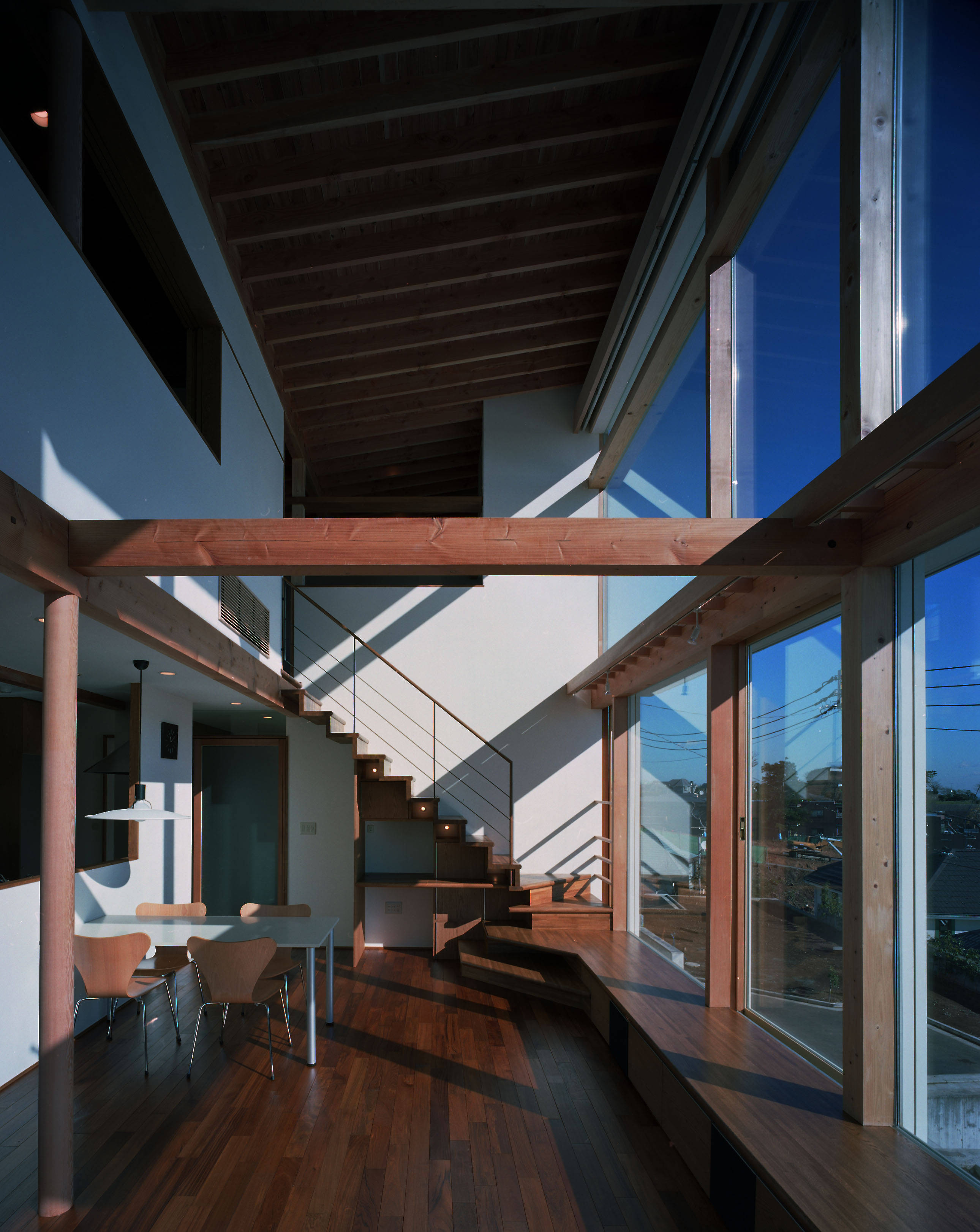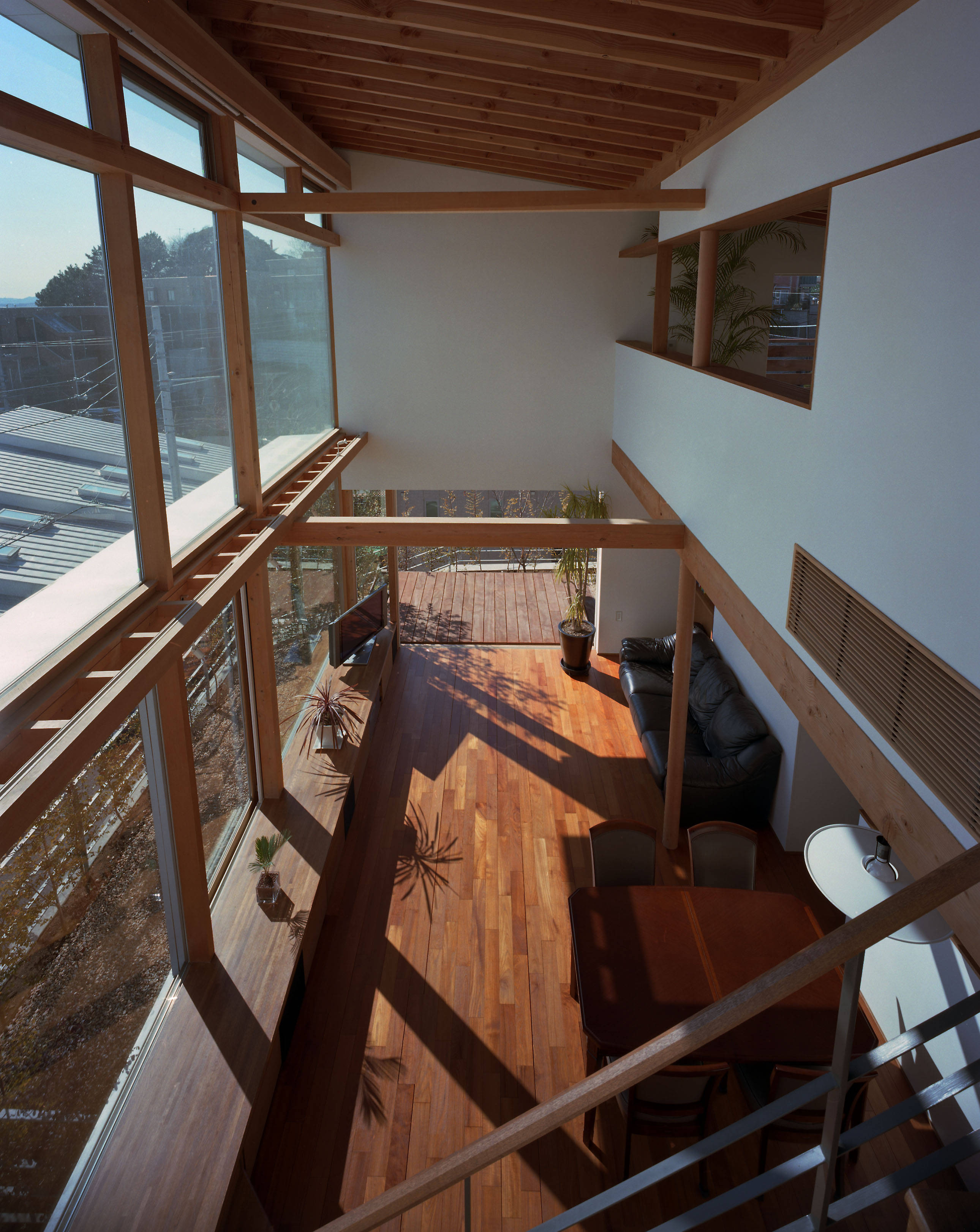 周辺より土地が高く、廻りからの視線が気にならないため、海の見える南側を全面ガラスとし、そこに吹抜のLDを配置しました。