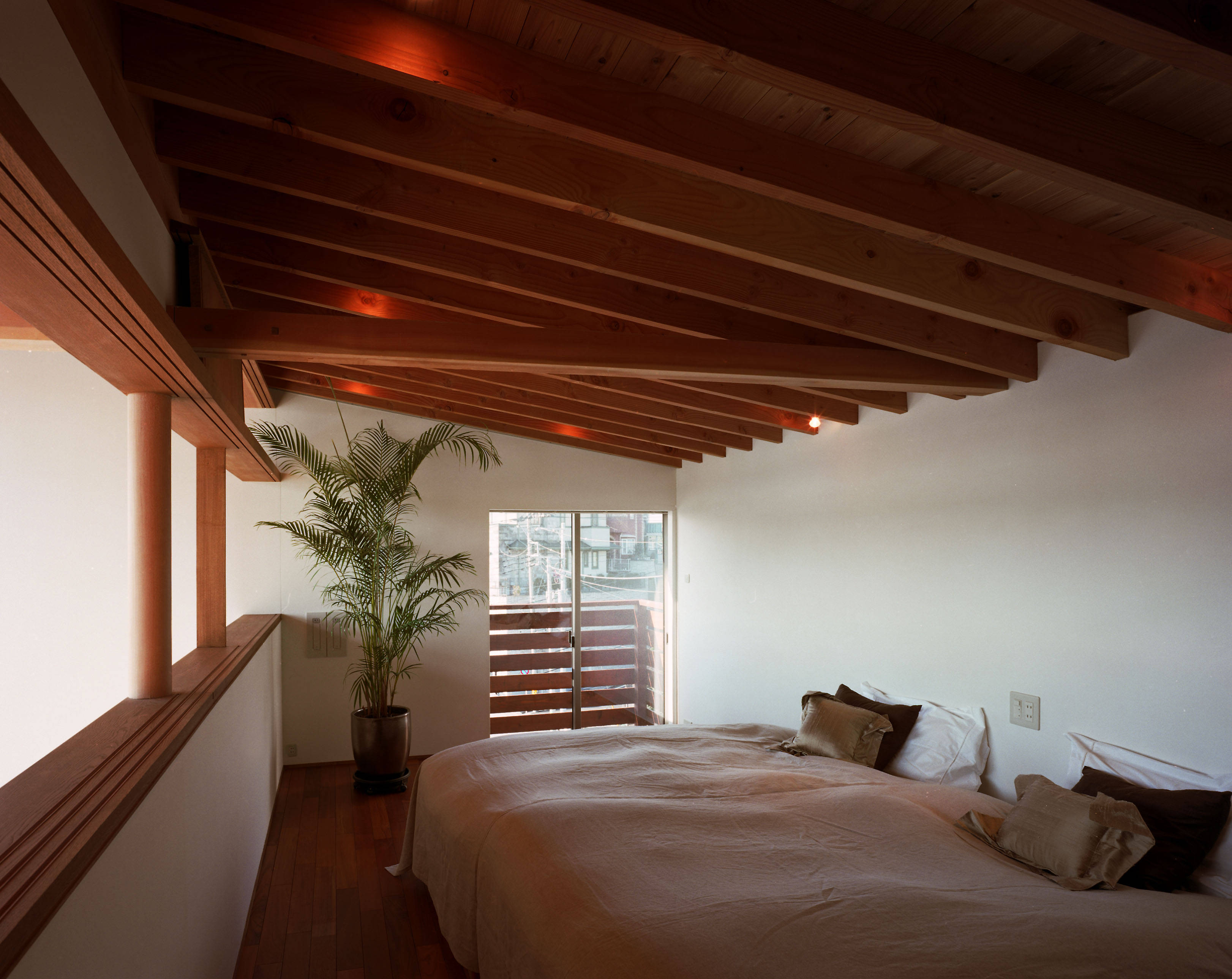 吹抜のLDを中心に、それを囲むように2階に各室をめぐらし、吹抜との境の戸を開け放つと、1・2階が一体につながる開放的な住空間を展開しています。