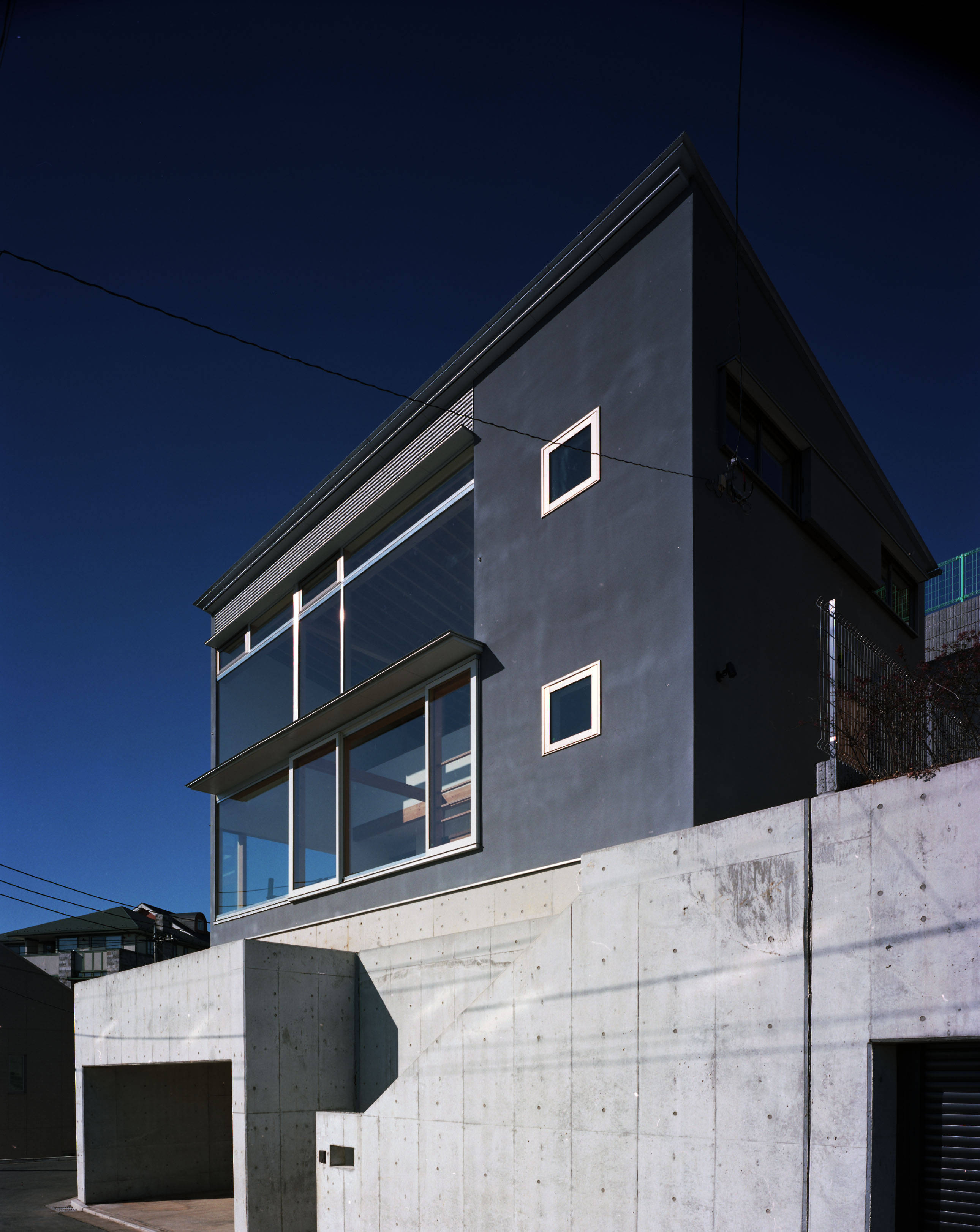 遠方に海を望む、急斜面を造成した丘に建つ住宅です。