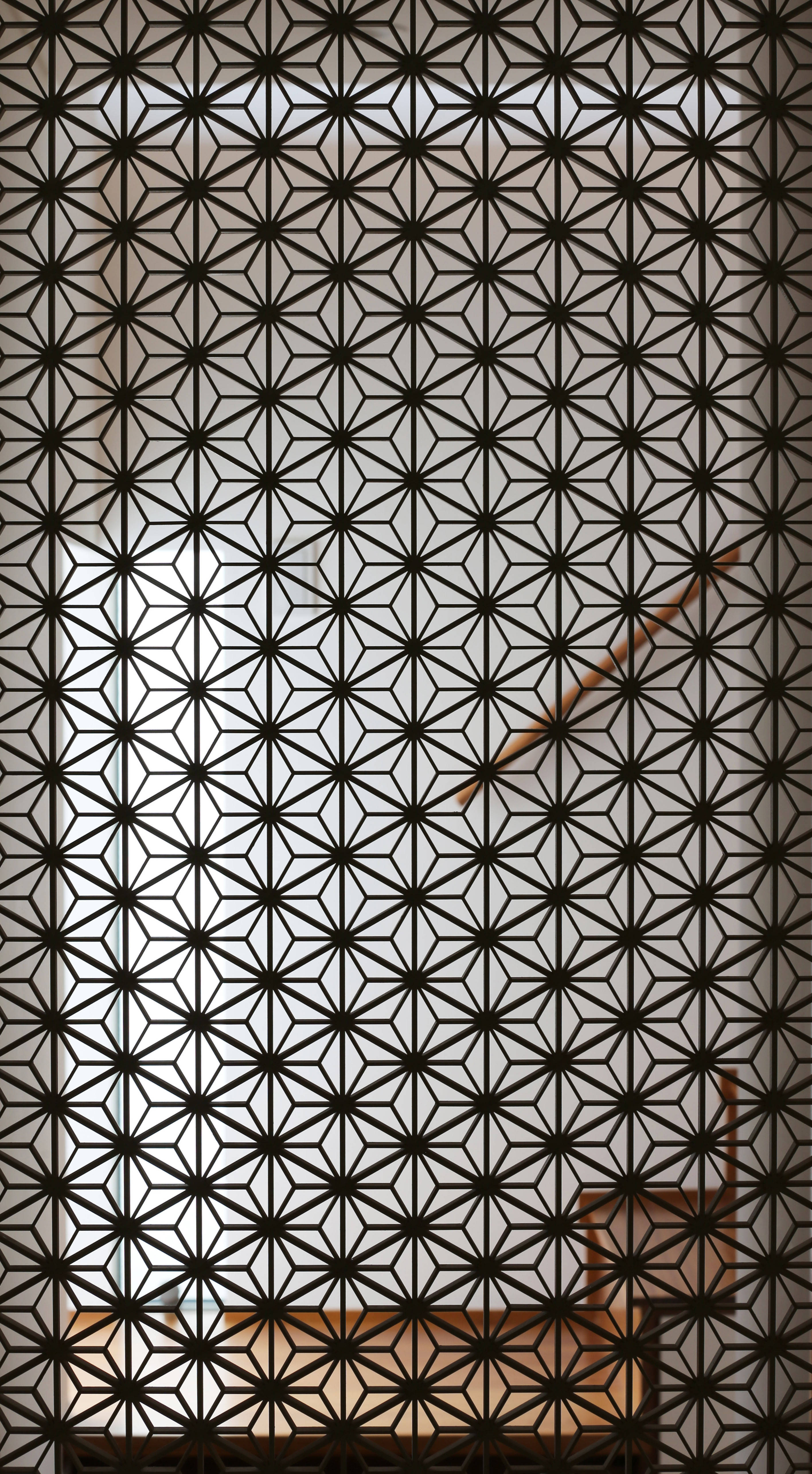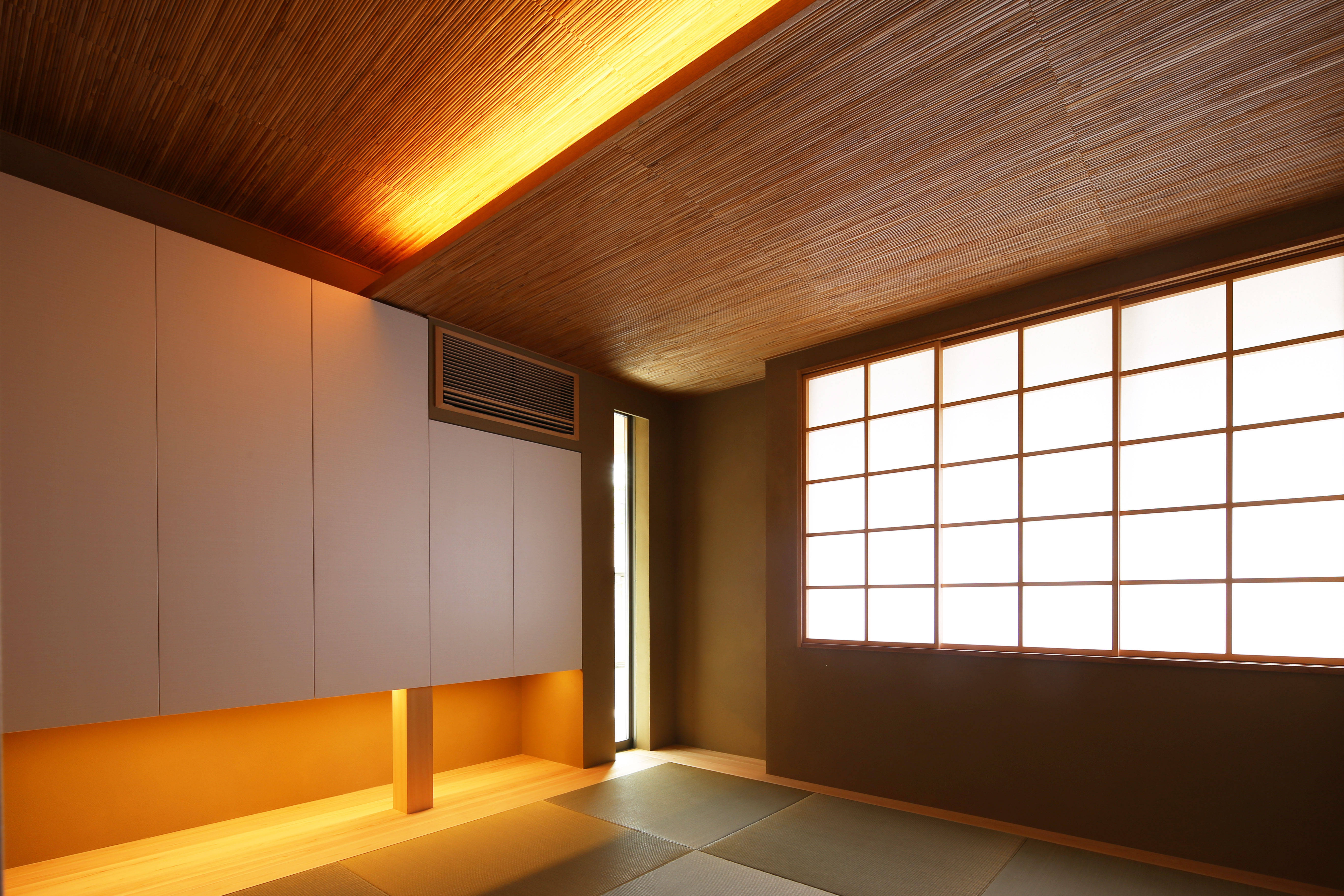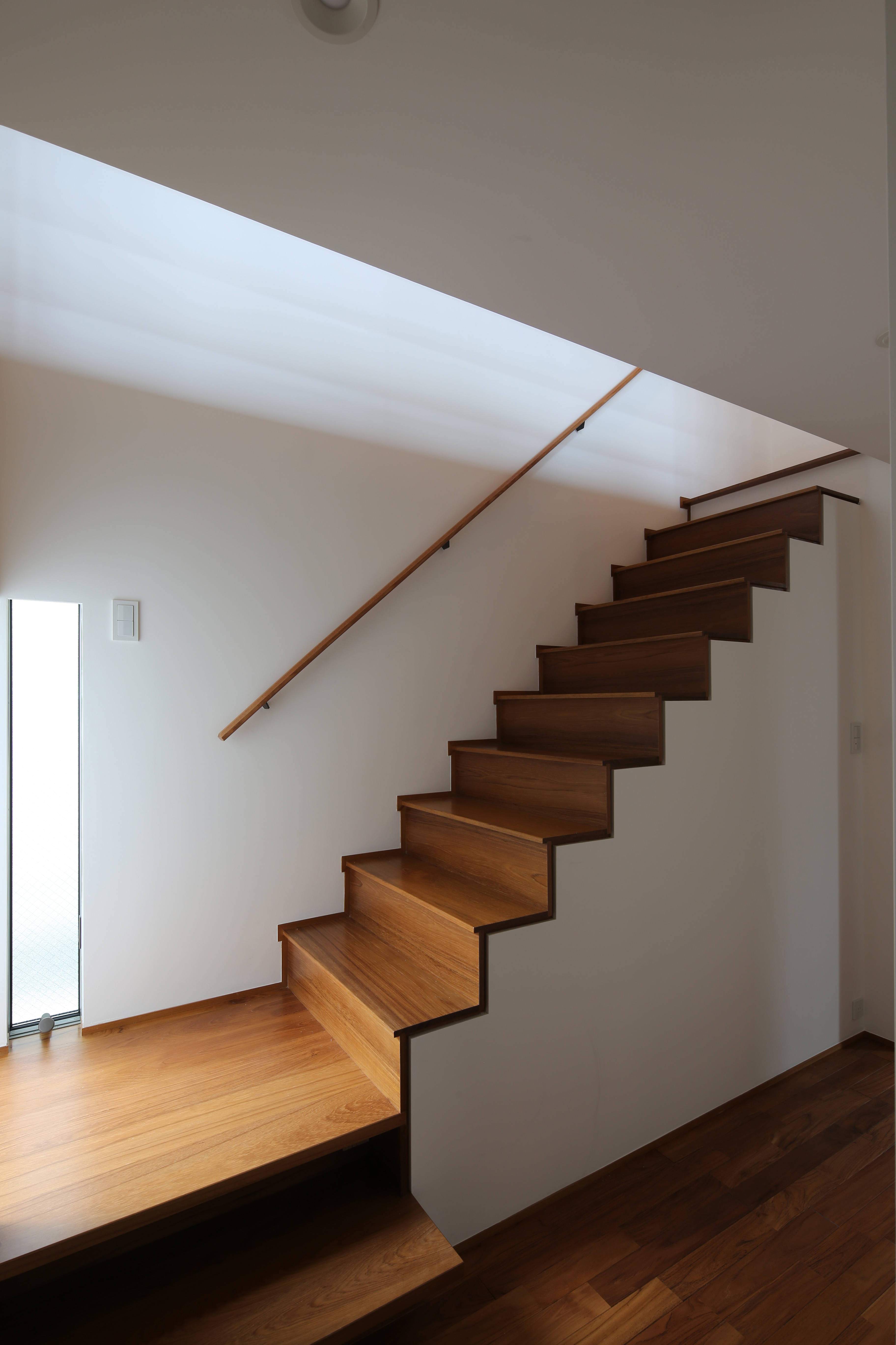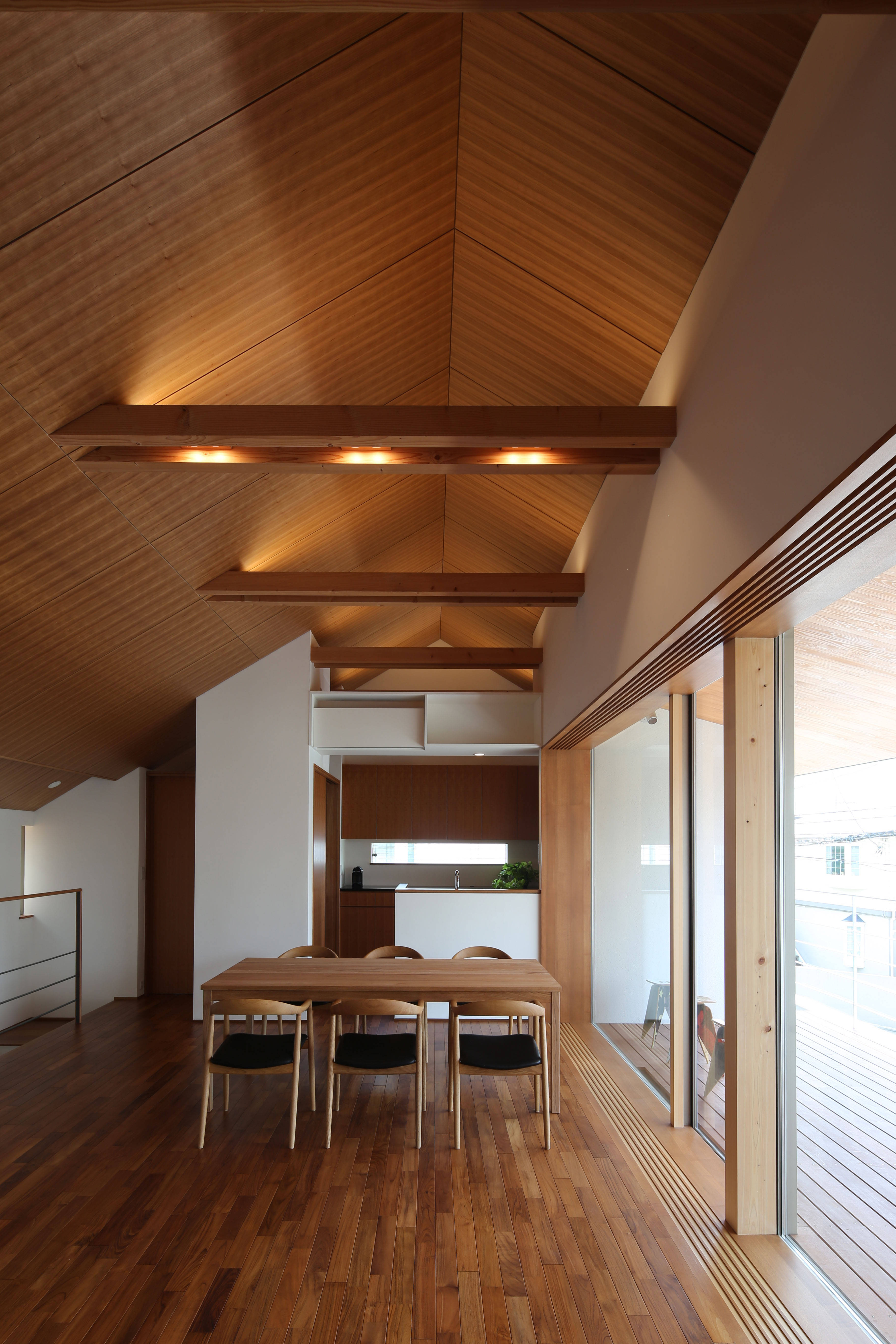 屋根の形そのままの天井に、照明を組込んだつなぎ梁が連続する住宅です。