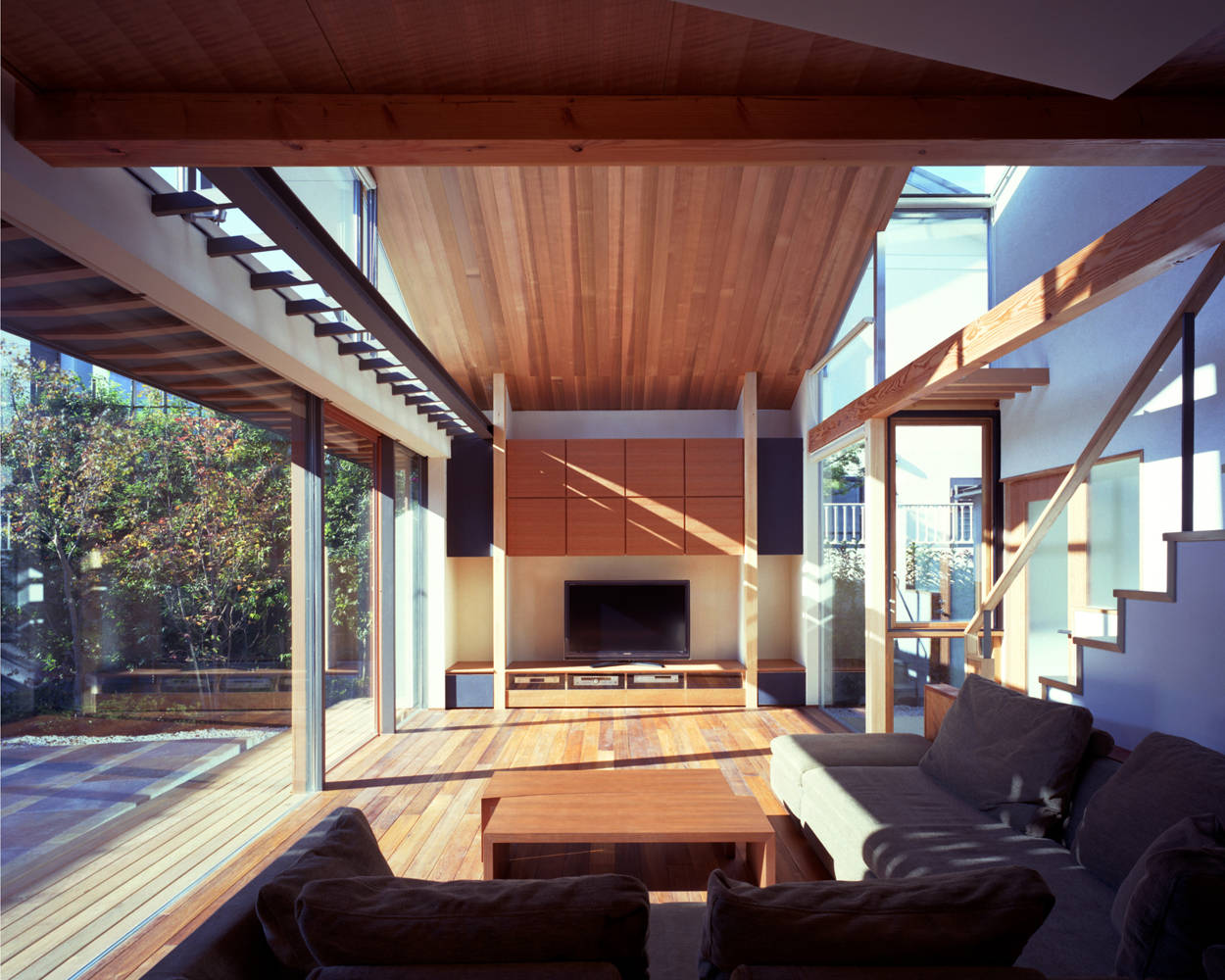 そして南、北の個室と中央のLDとの間に、空からの光に輝く明るいつなぎのスペース(階段・サンルーム)を挟みこむことで、各個室が「離れ」のような独立した感じが生まれるようにしました。