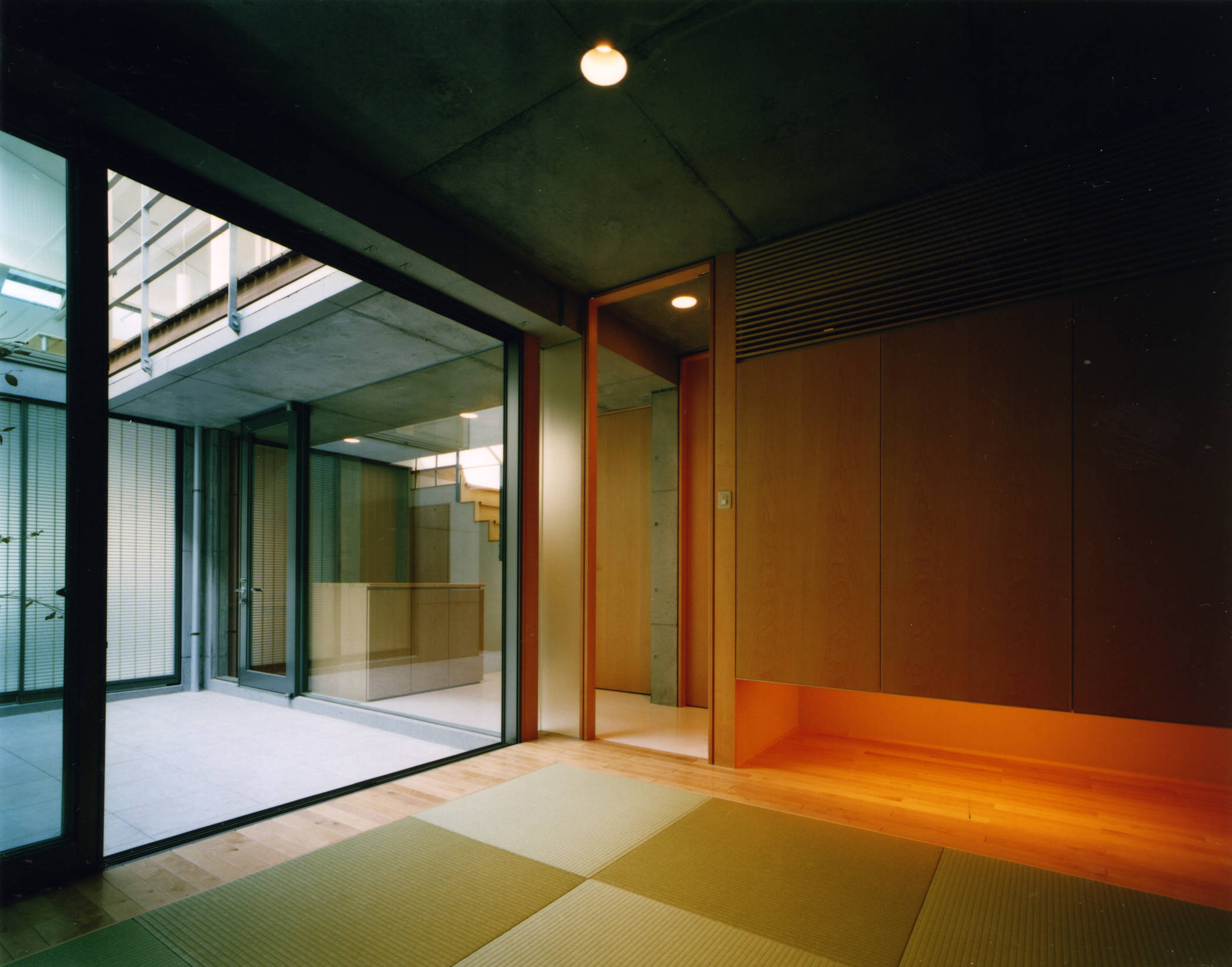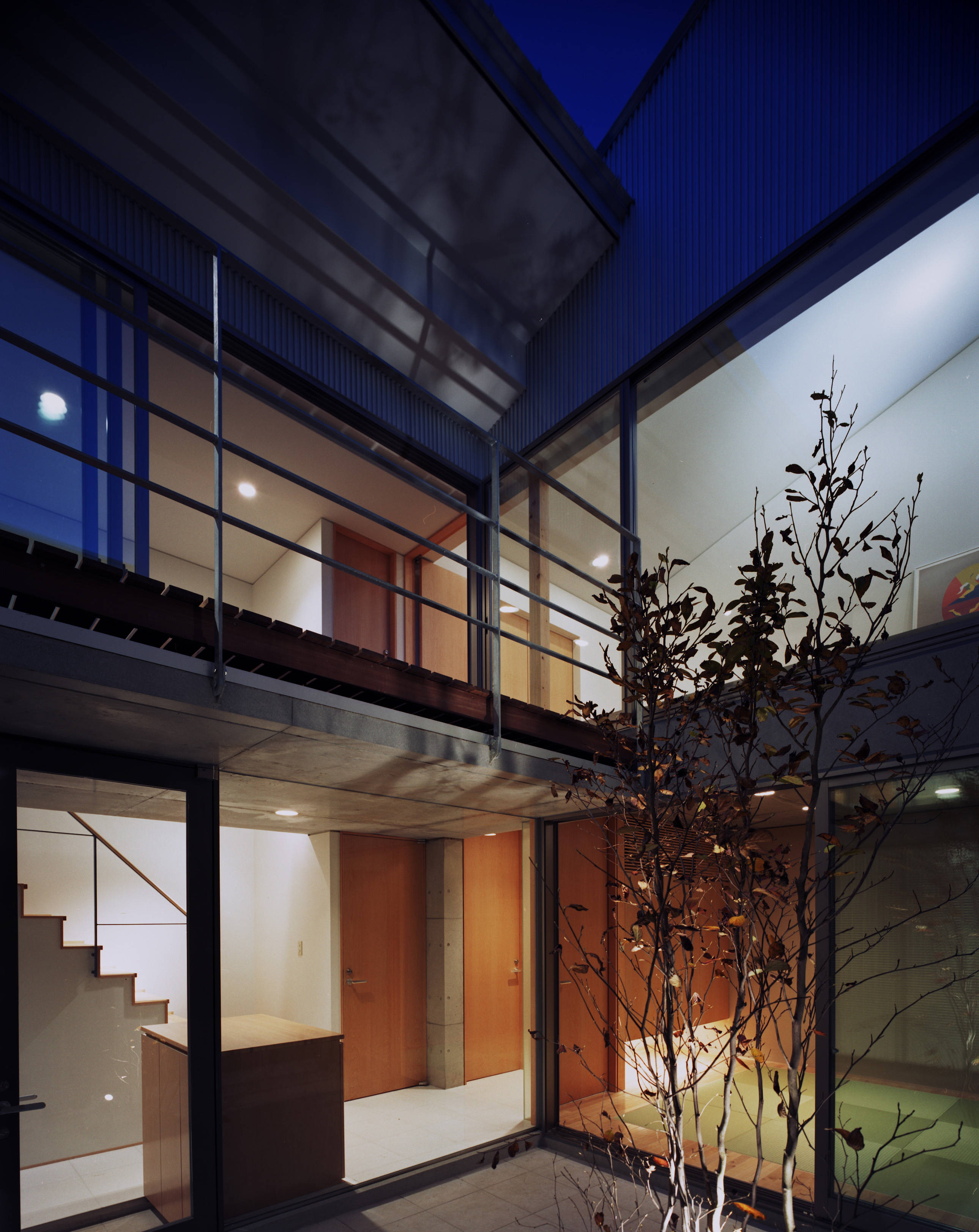 外観は、打ち放しの壁の上に、窓のない黒い箱が載る構成により、内を守る表情を強調しました。打ち放し壁の斜めの配置や、中庭からのほのかな光に、人を招き入れる気配が感じられるようにしました。