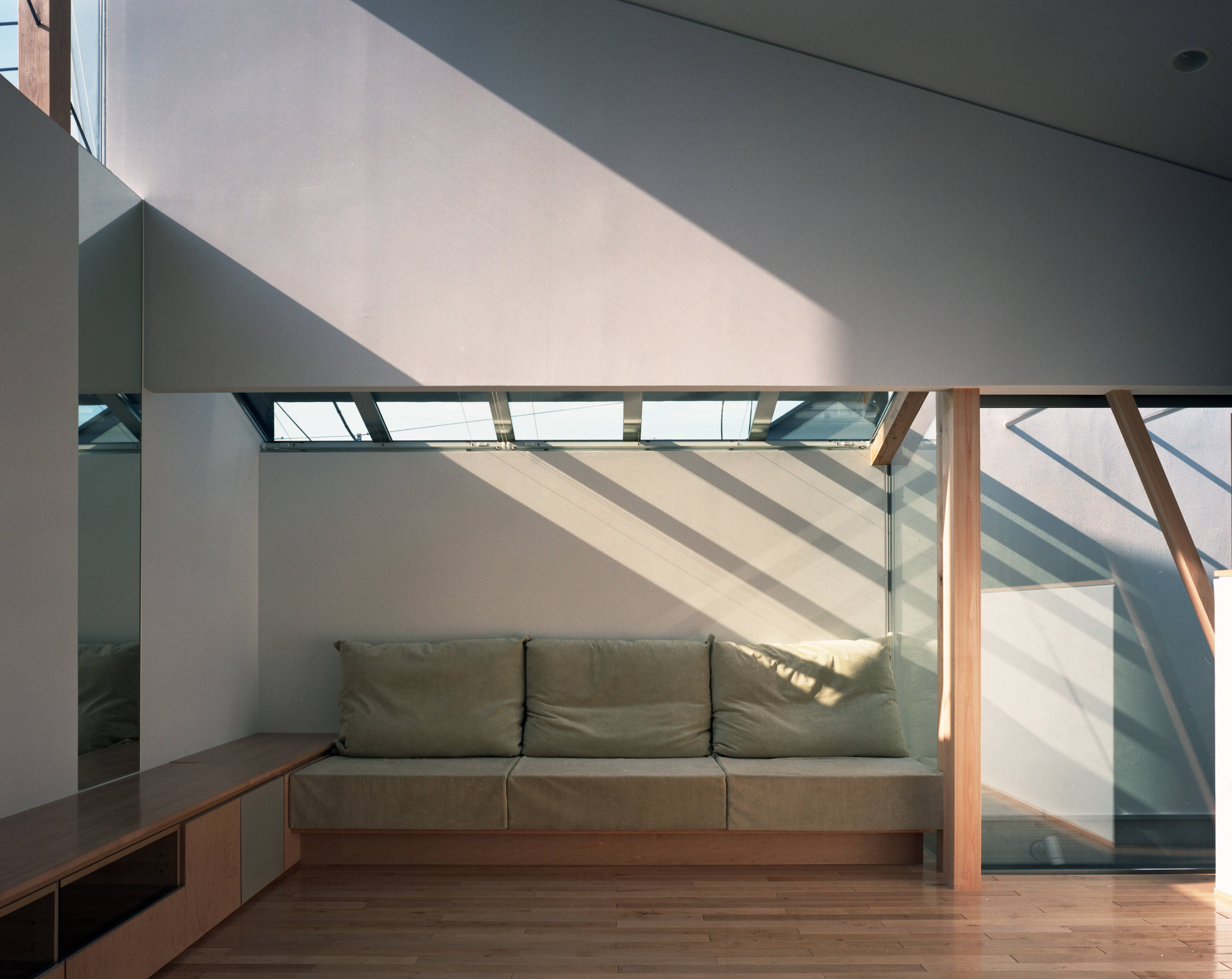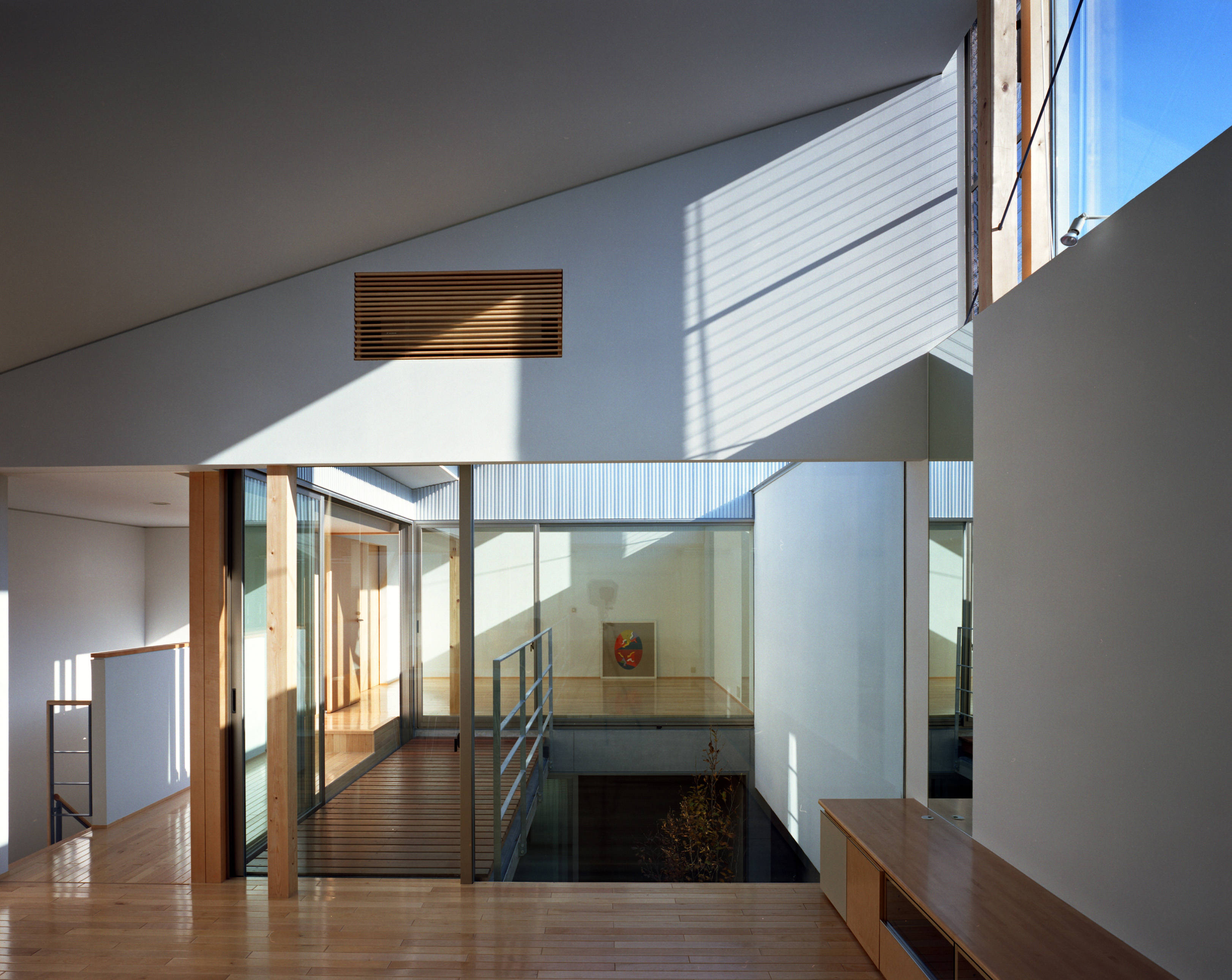 この囲まれた箱に中庭を設け、各部屋が中庭に向けて開きました。2階は、囲まれた四角い箱の上に、三角の片流れ屋根を載せました。上からの自然光が、閉じた室内を明るく照らし出し、高窓で切り取られた空の風景が、心に広がりを与えてくれることを意図してのことです。