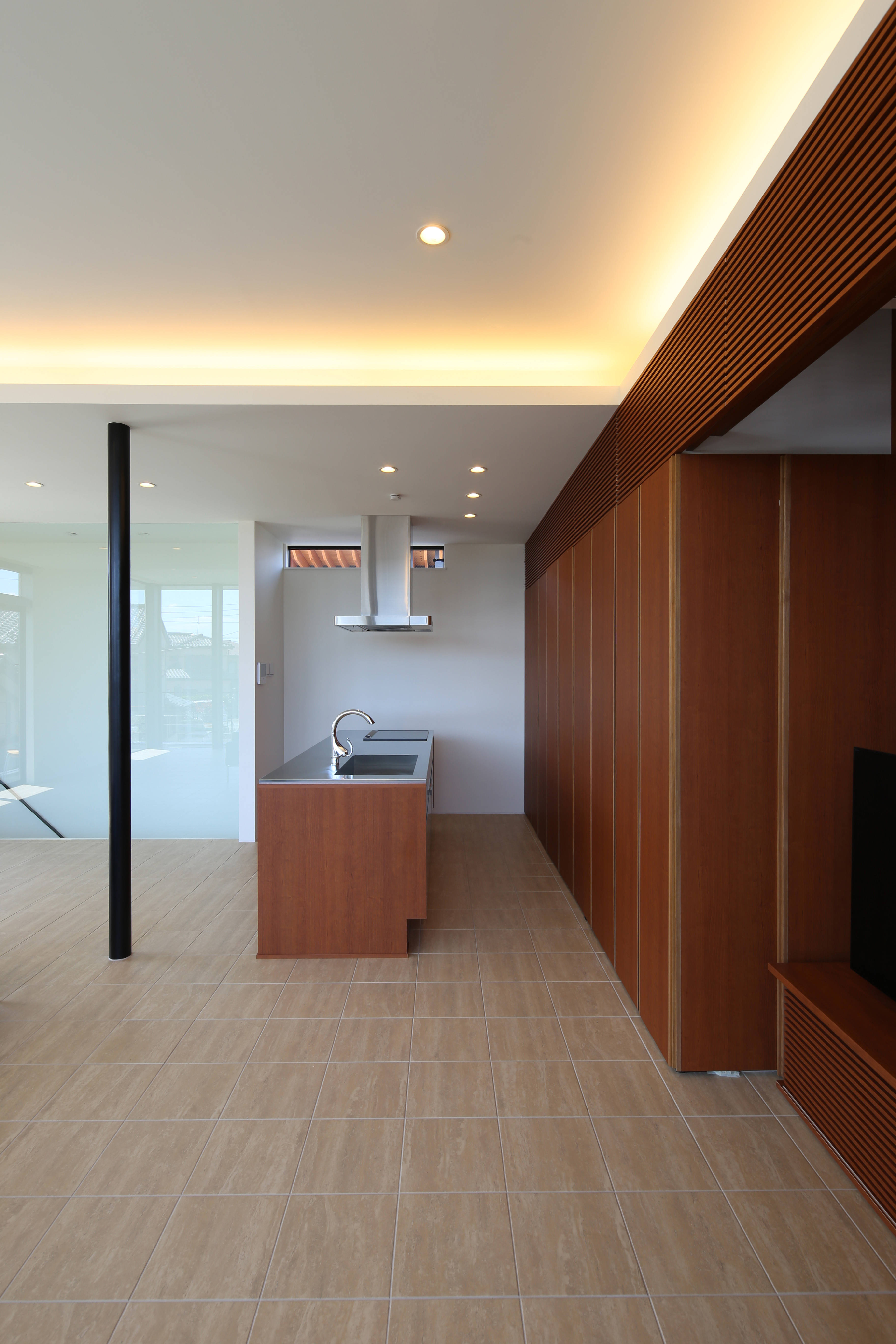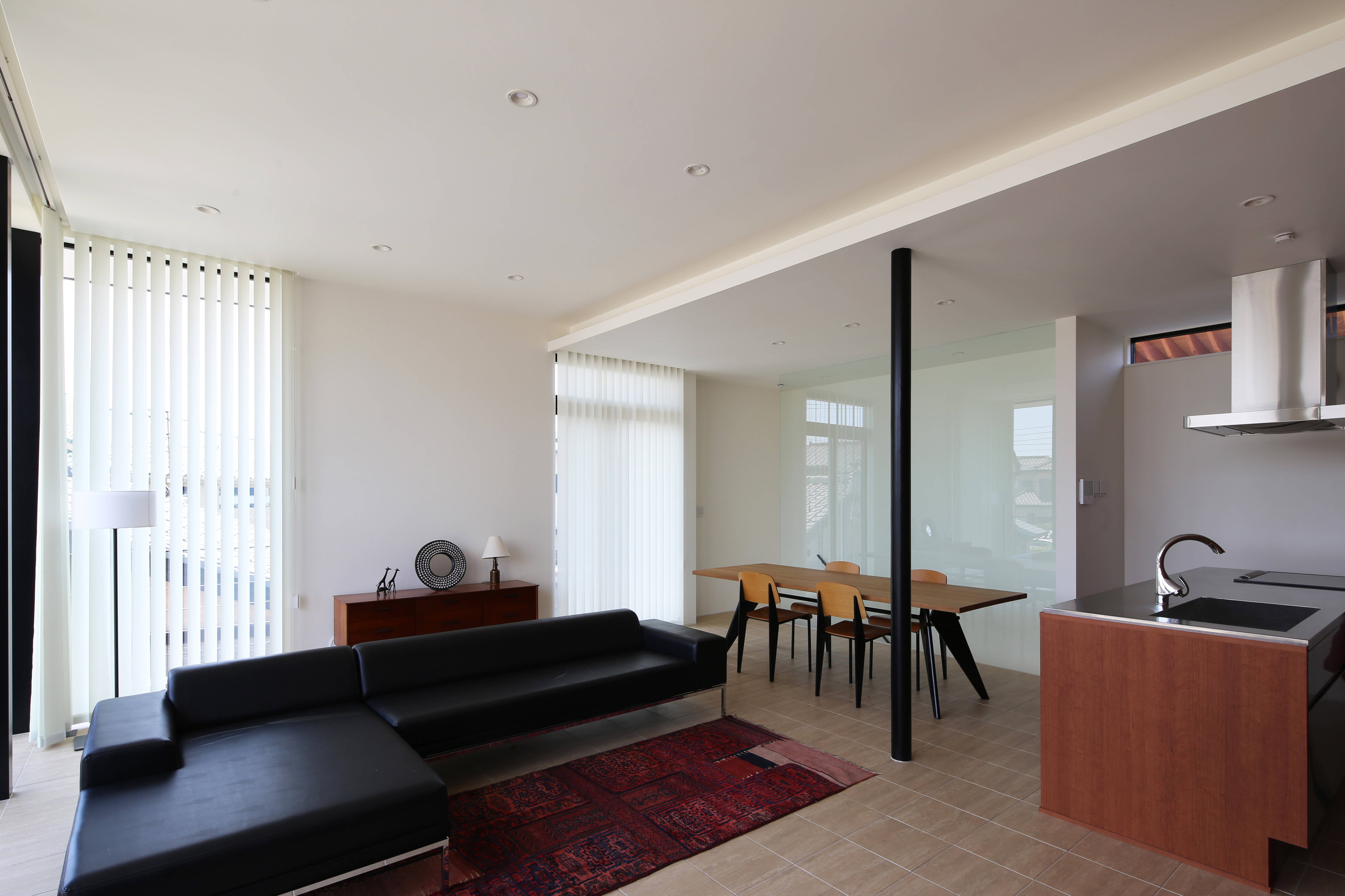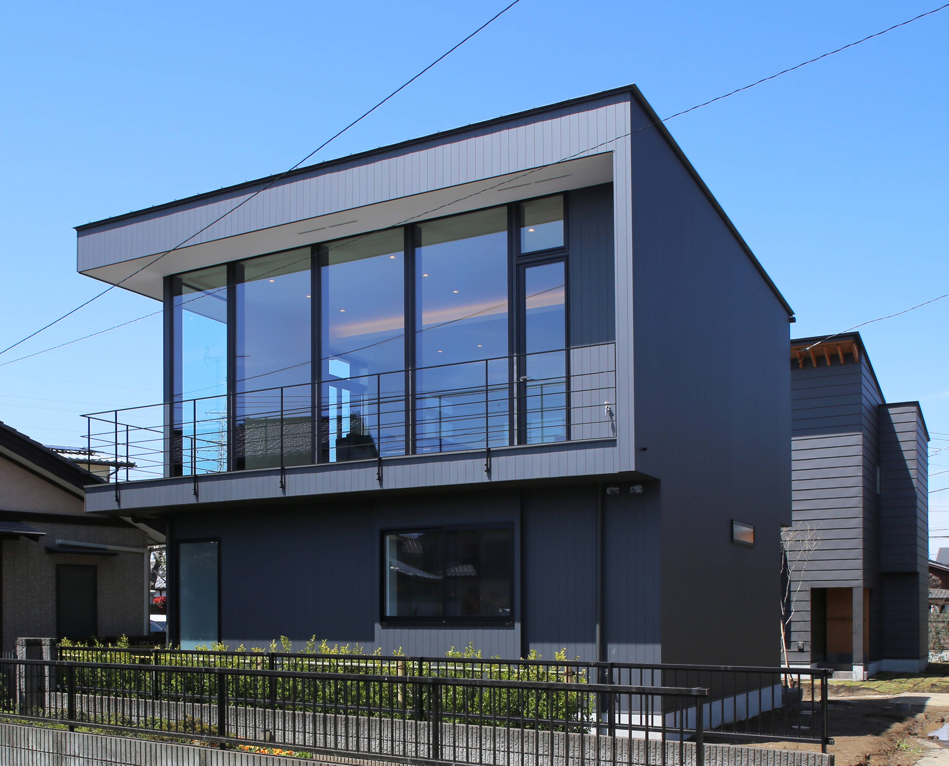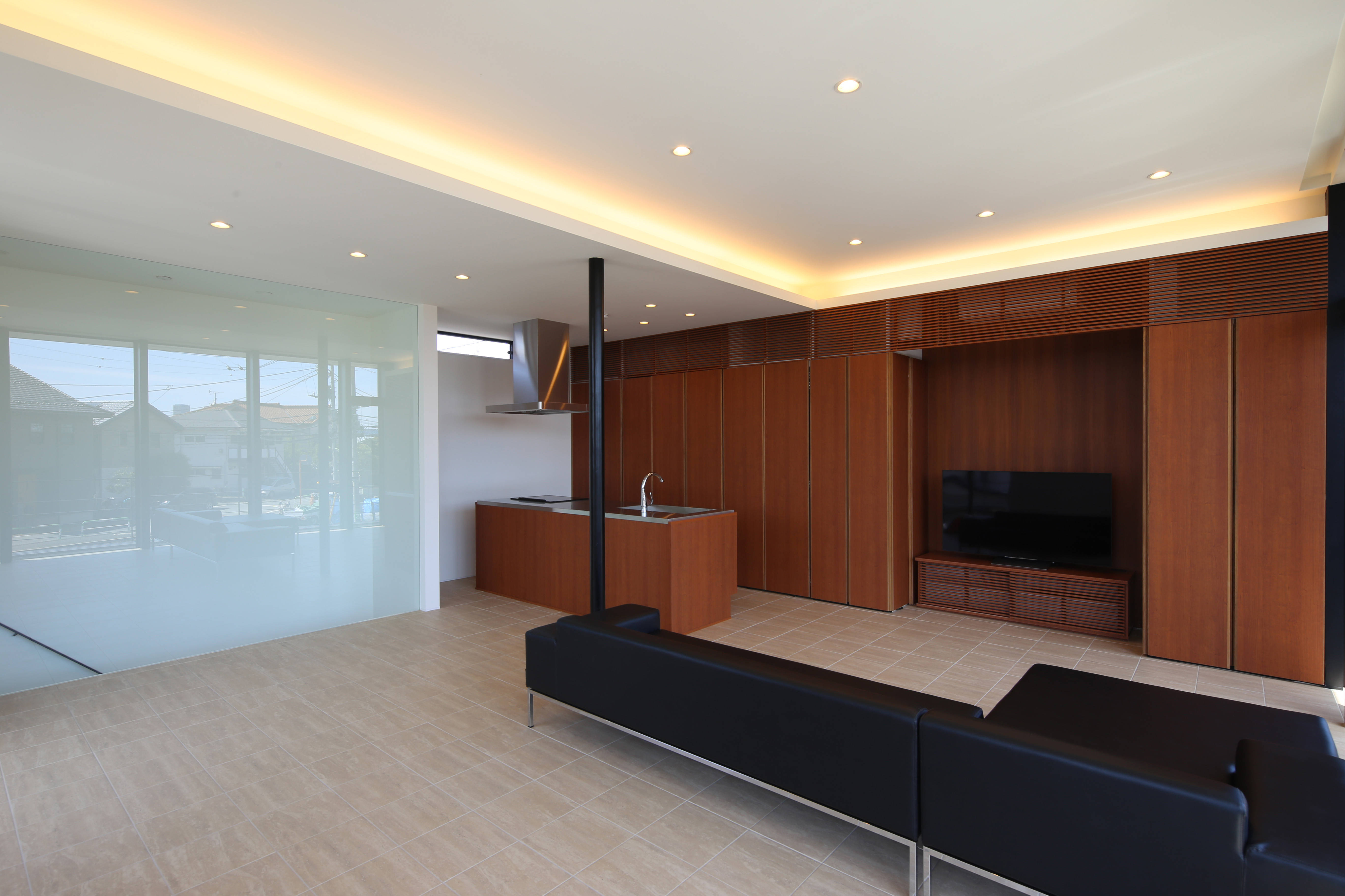 四角く、可能な限り単純な形の外観が特徴です。2階のリビングは、南側を全面ガラスとし、テレビ、キッチン家電を含め、収納は壁一面に収納したすっきりとおさめています。