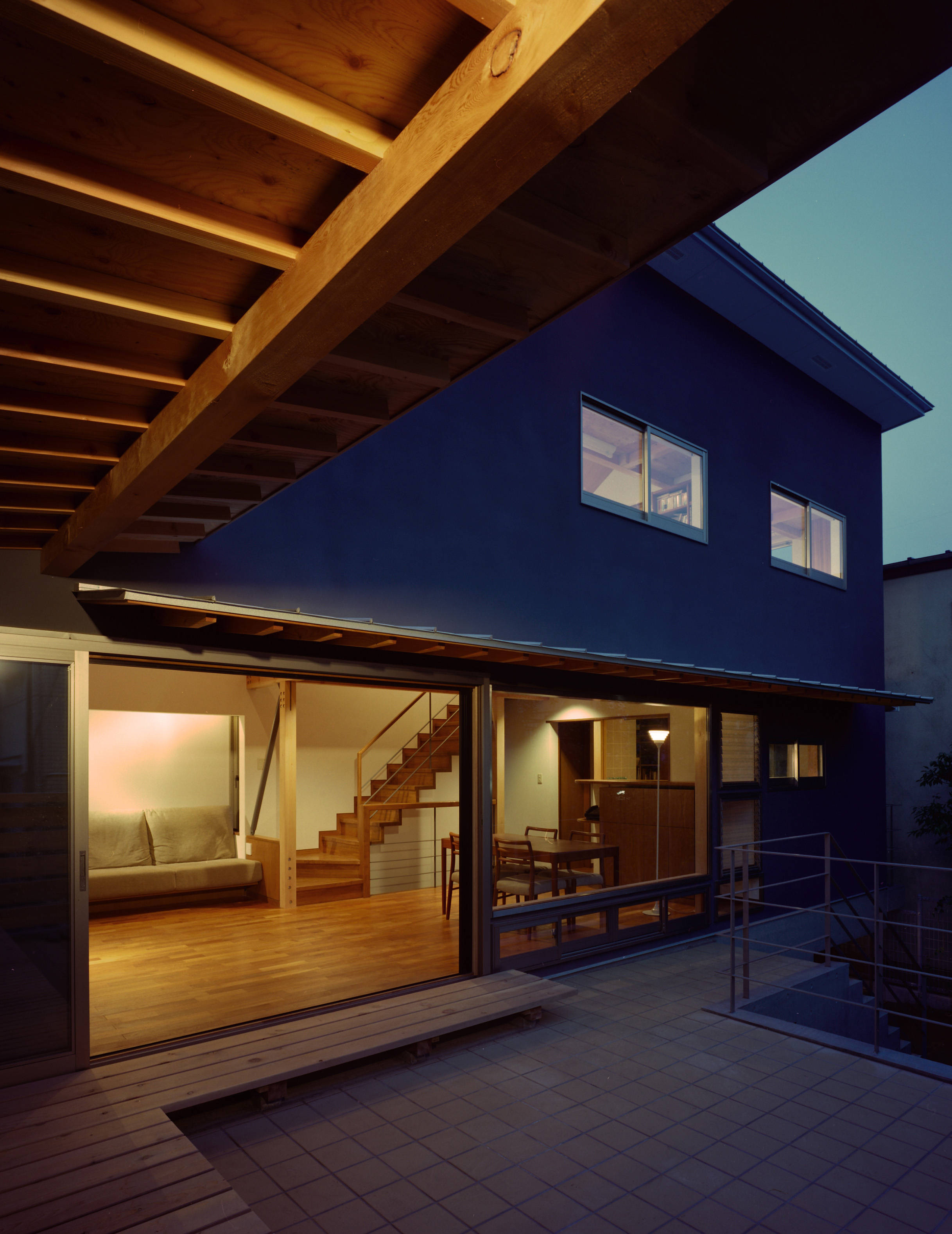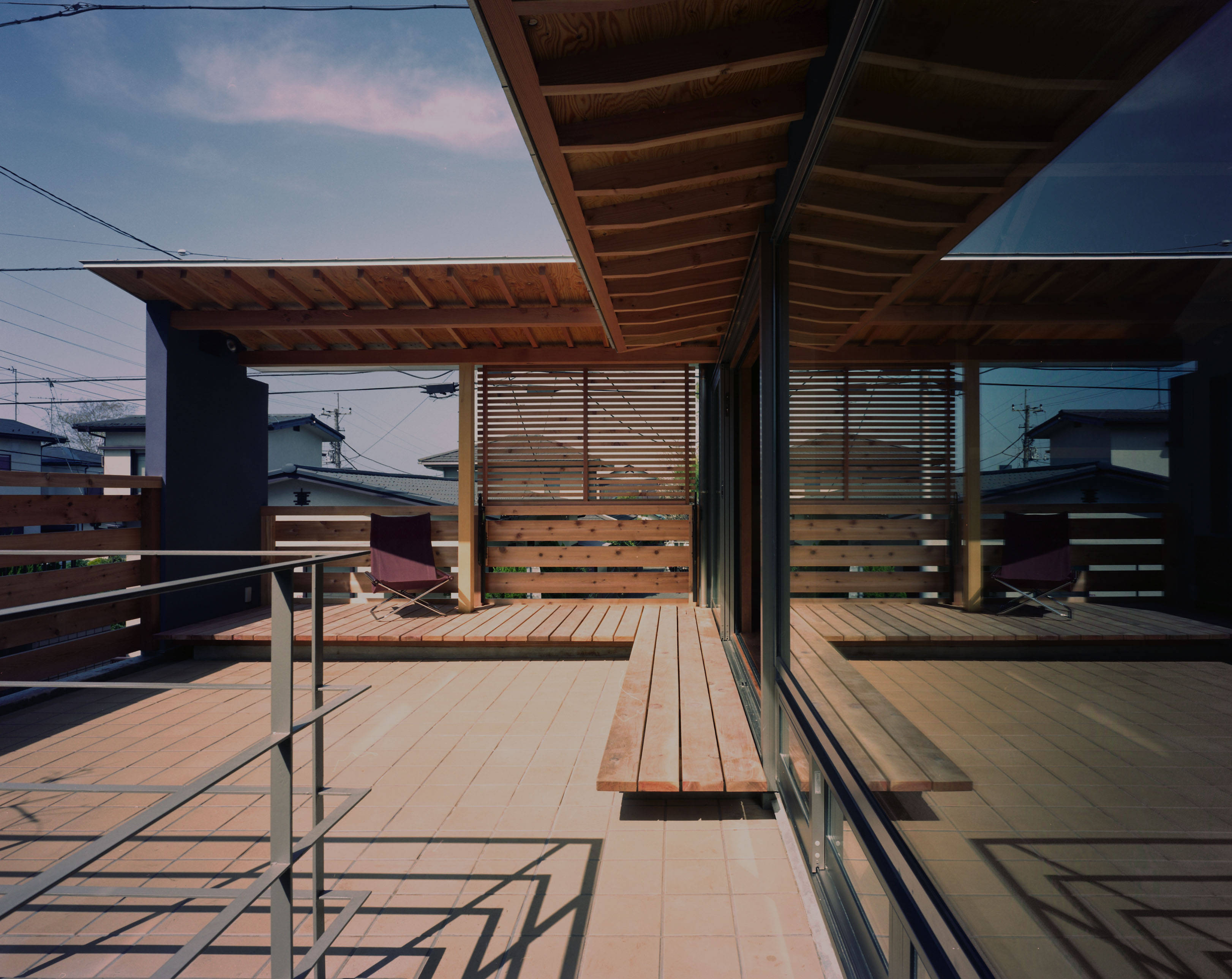 一方、テラスの木格子と手摺壁によって、外からの視線を隠すとともに、柱梁の水平垂直のリズムが生み出す安定感によって、守られた安らぎの感じられる住空間をめざしました。