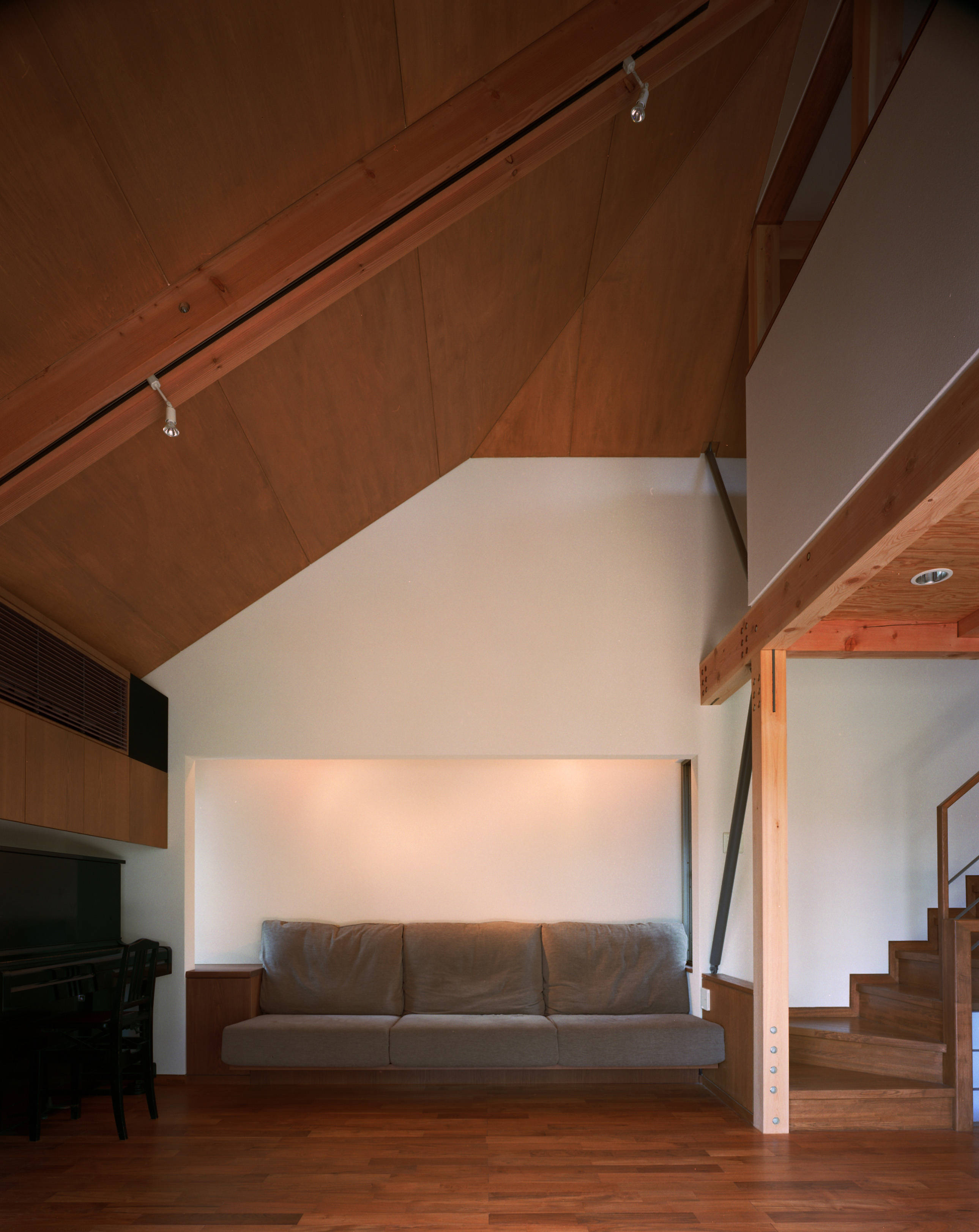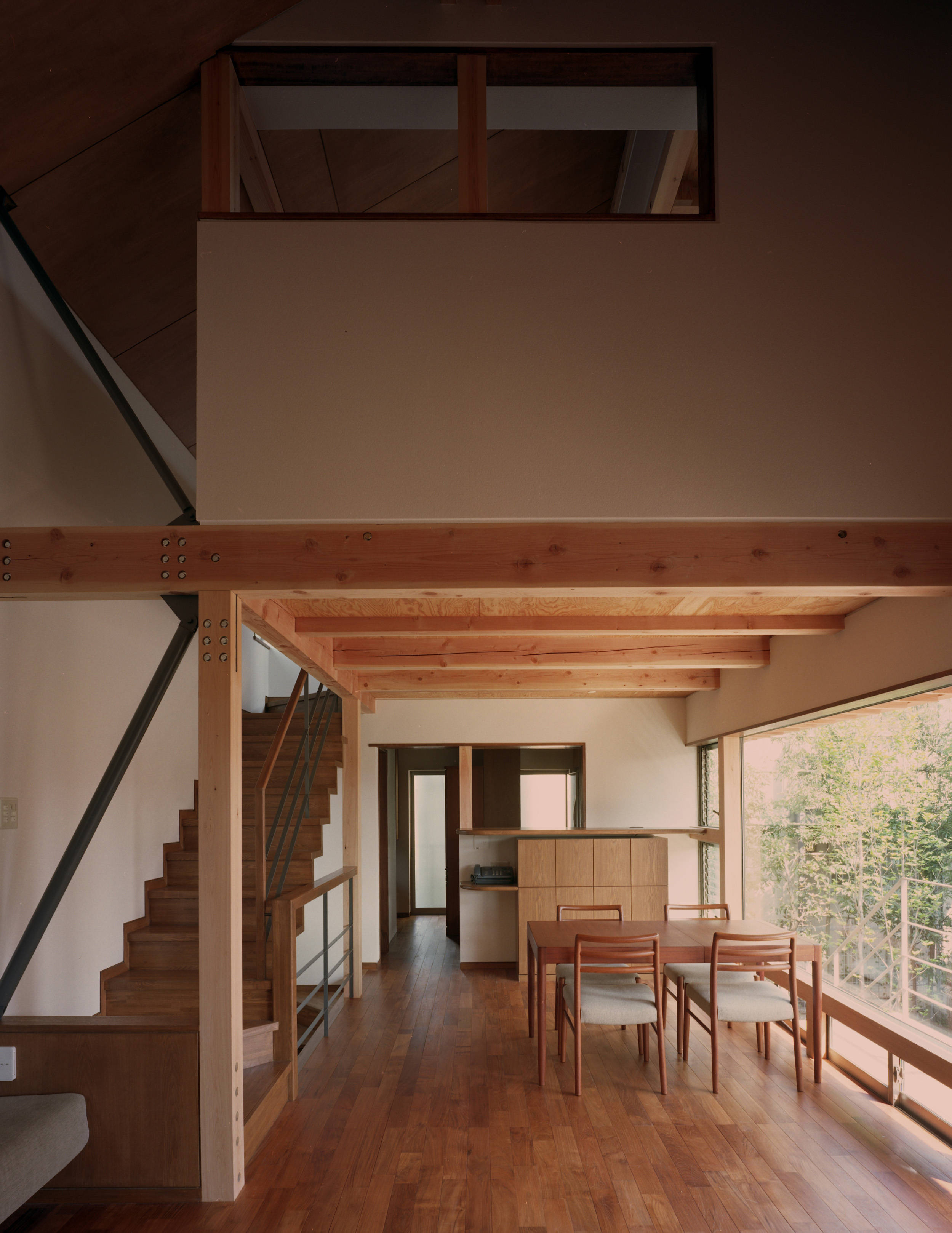 その中で、周囲からの視線を遮りつつ、室内と屋外とを開放的につなげることで、守られた安心の中で、広がりの感じられる住空間を展開しようと考えました。敷地が道より1,5m高かったため、この段差を利用し、半分土に埋めるように、コンクリート造で入口階(地階)をつくりました。その上に、木造で、開放的に、居間・食堂を形づくりました。