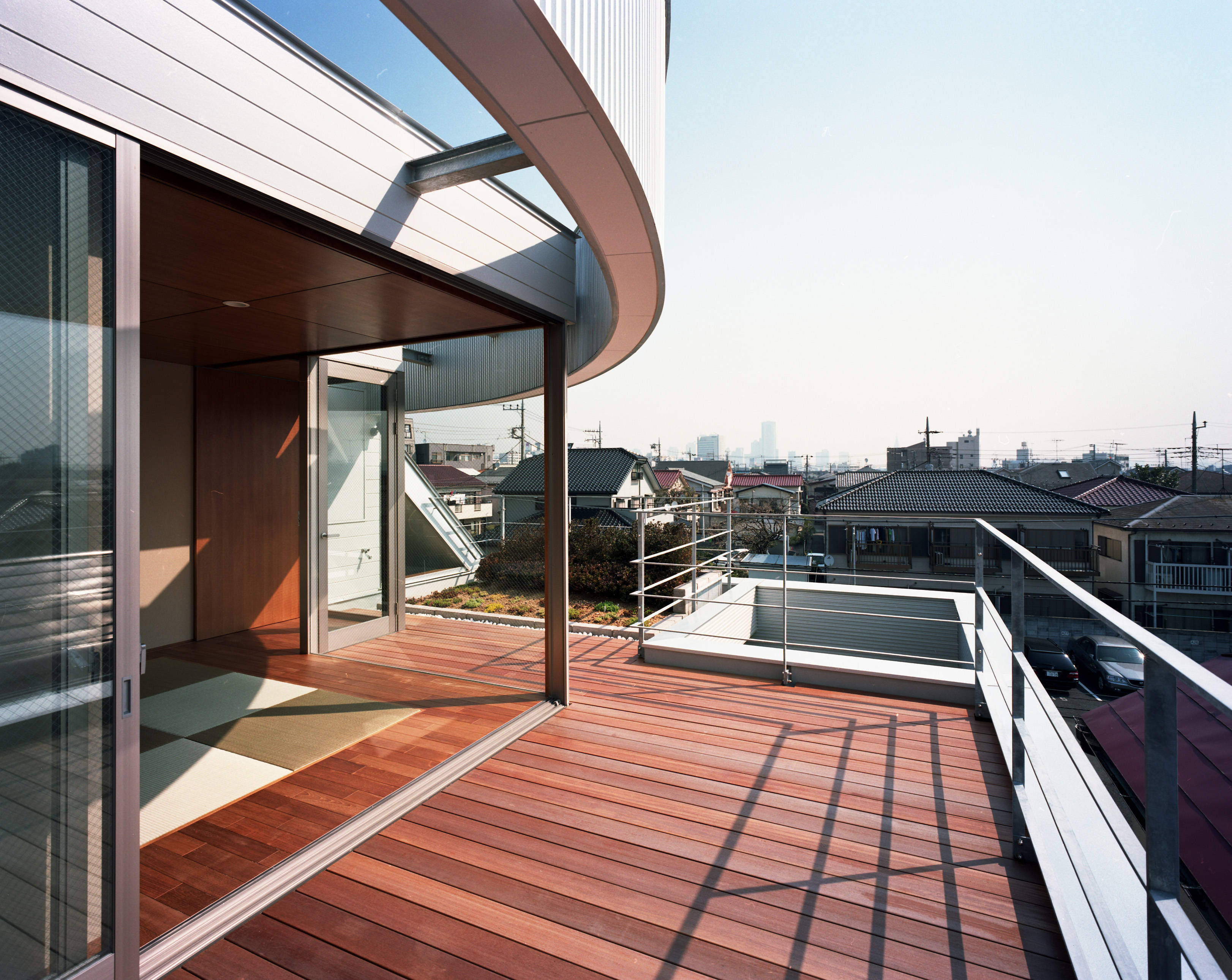 3階は、用途地域境界と斜線制限をかわした円形の中に和室空間をおさめ、視界の広がる南・東に向かってデッキ空間や庭園を設け、心が開放されるような場所にしました。