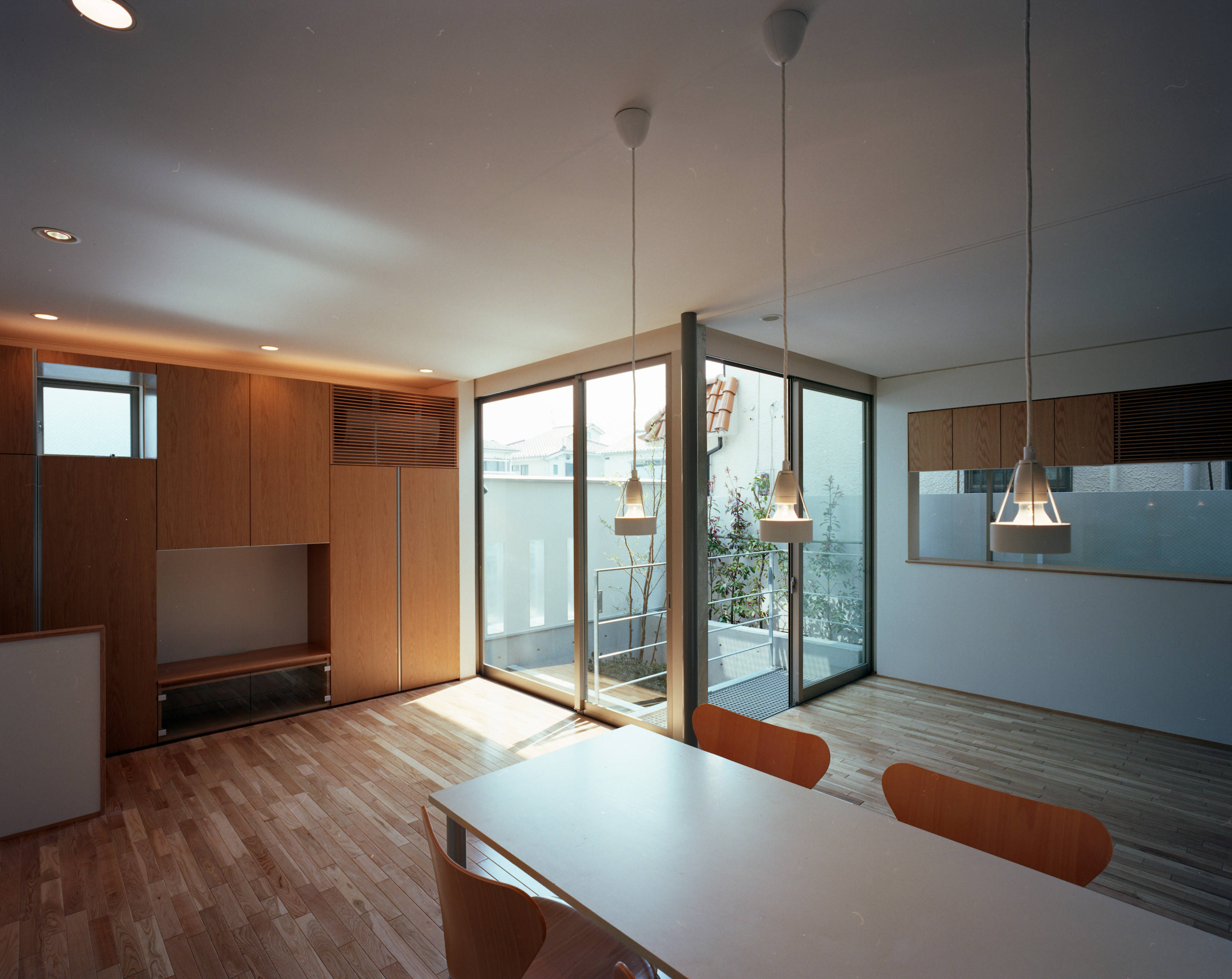 外からの視線を気にすることなく、居室空間に、光・風を導き入れるため、建物のボリュームの一角に、四角く外部空間を穿ち、この小さな外部に、植栽、庇バルコニー等を組み込むことで、上下のつながりを感じさせる立体的な庭空間を形づくっていきました。