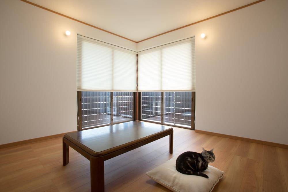 1階は主寝室,水回り,趣味室そして食堂居間へ回遊できるつながりのある空間としている。愛猫の居場所も確保。