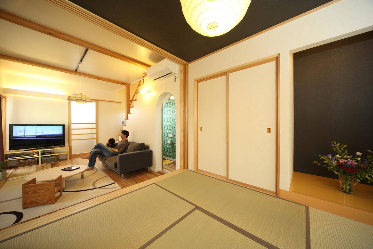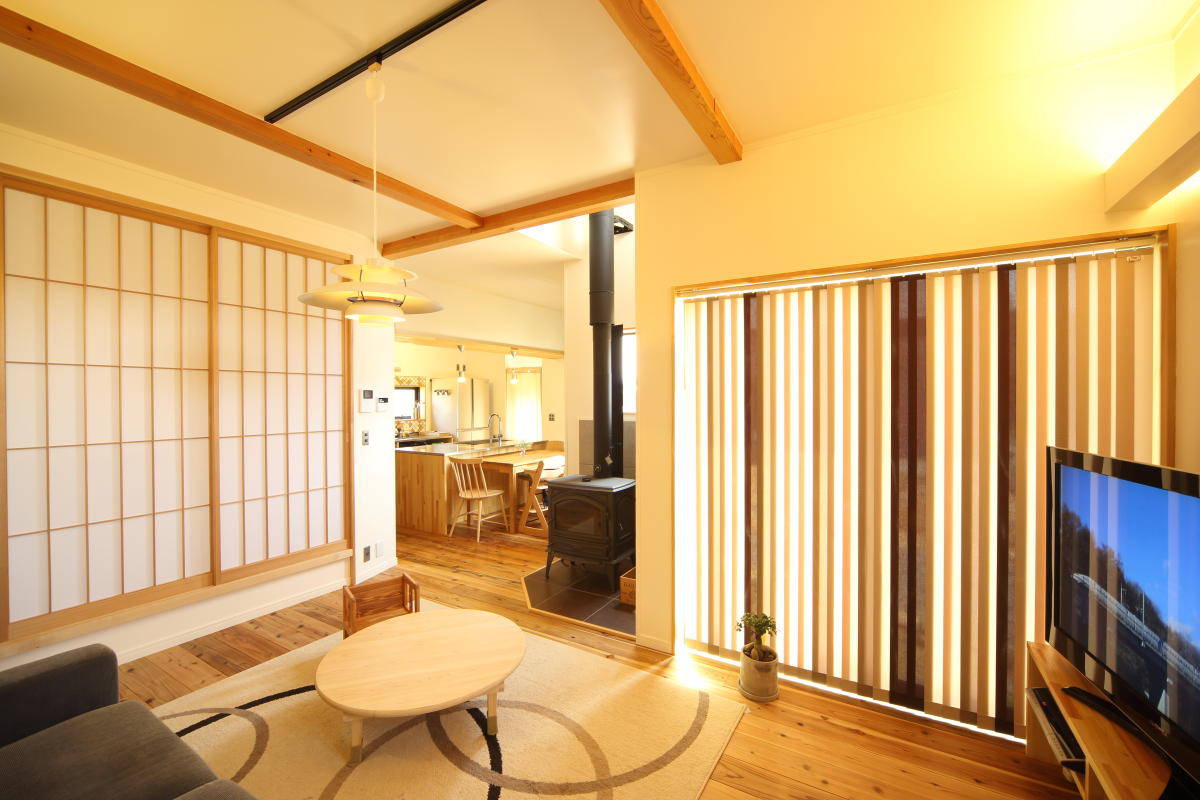薪ストーブを中心にほぼワンルームのつながりのある空間構成としています。