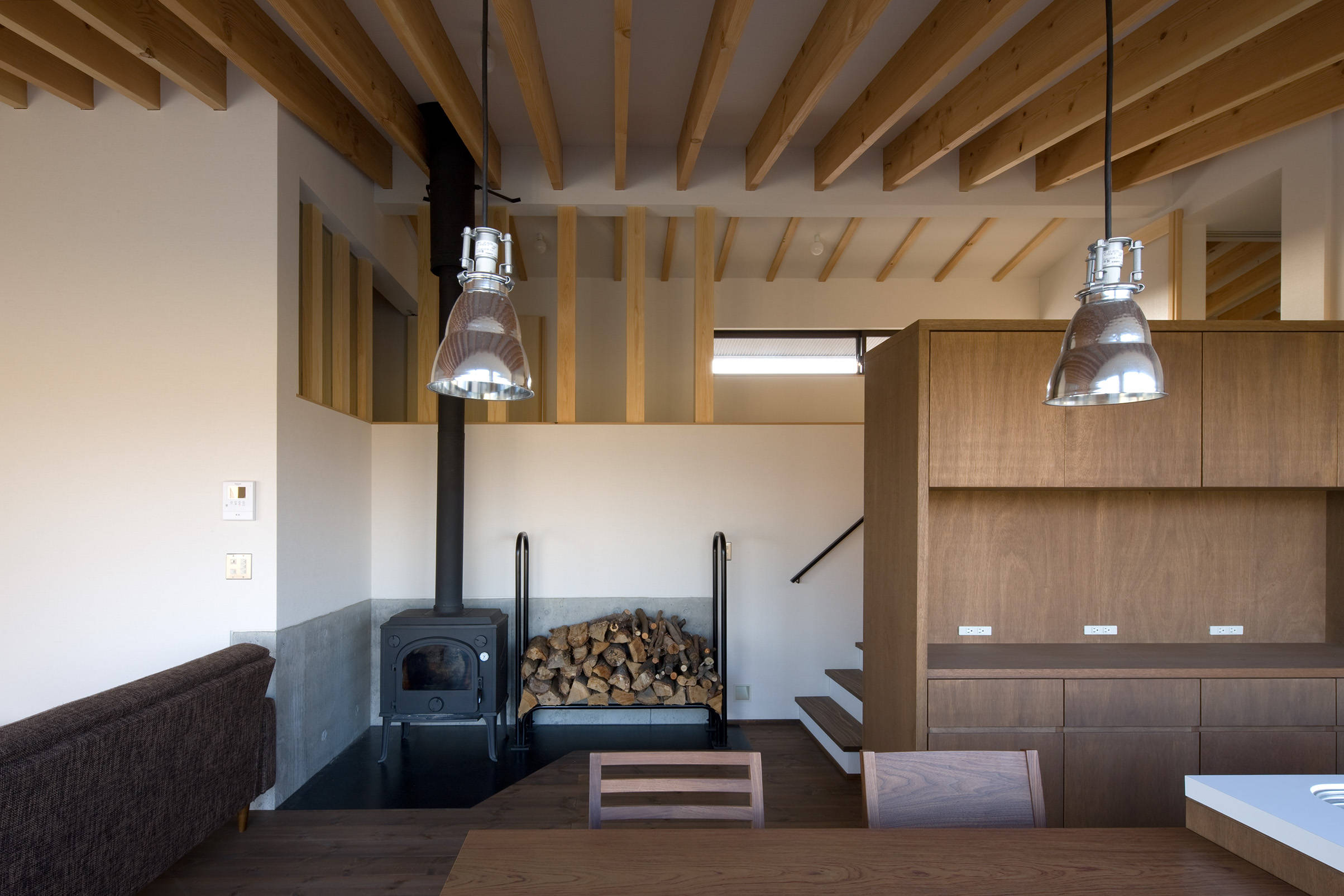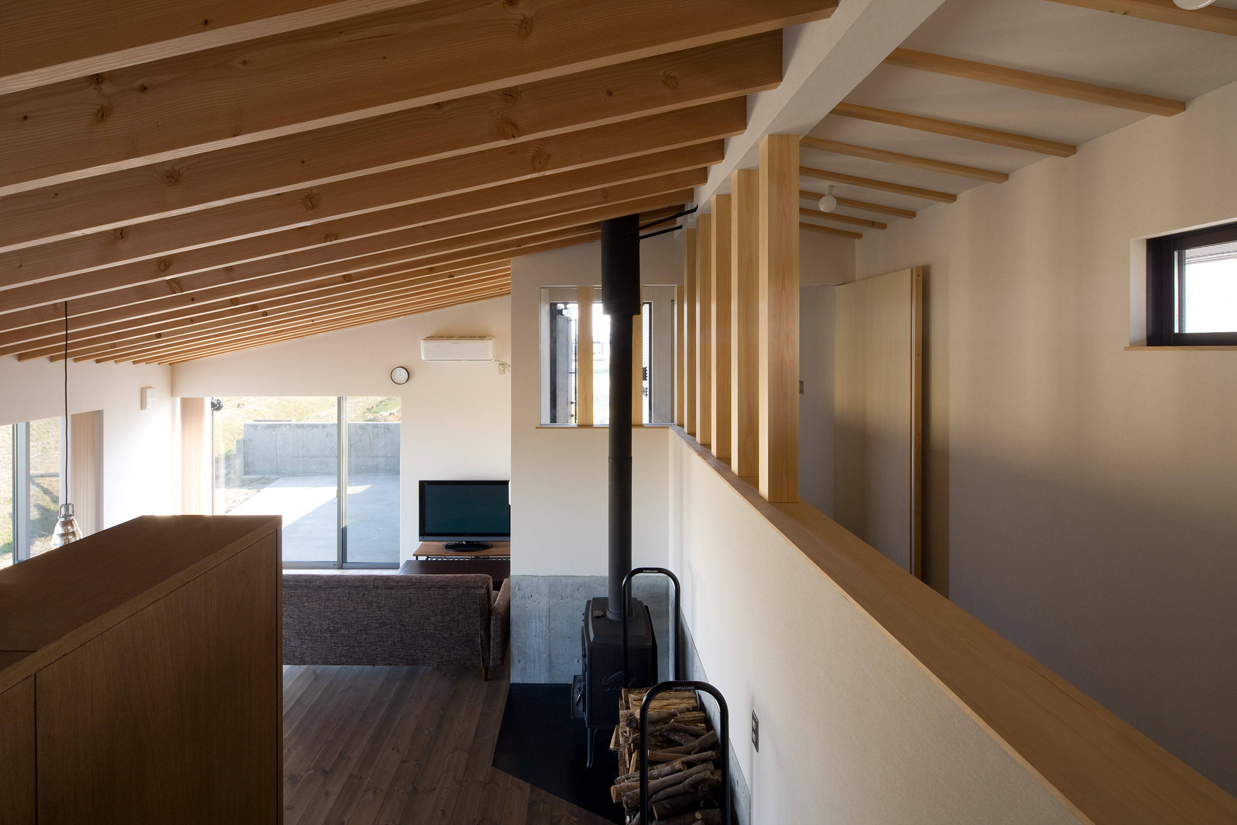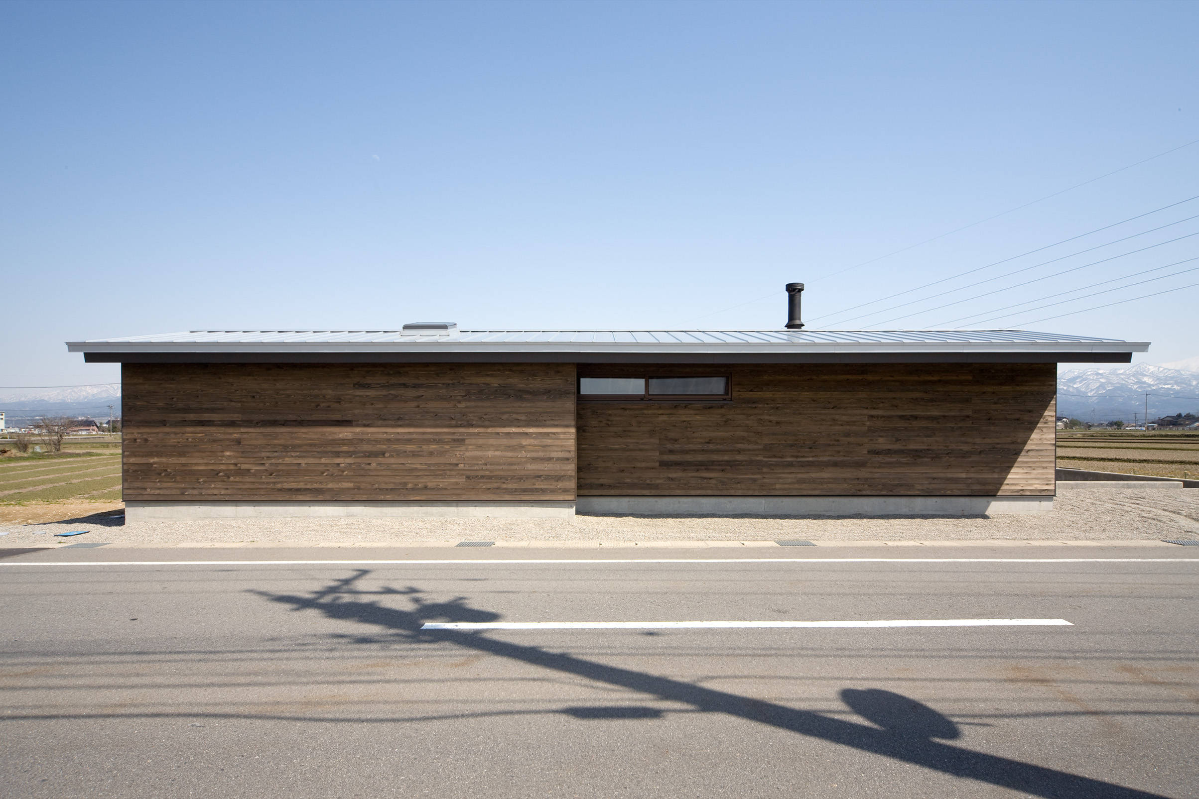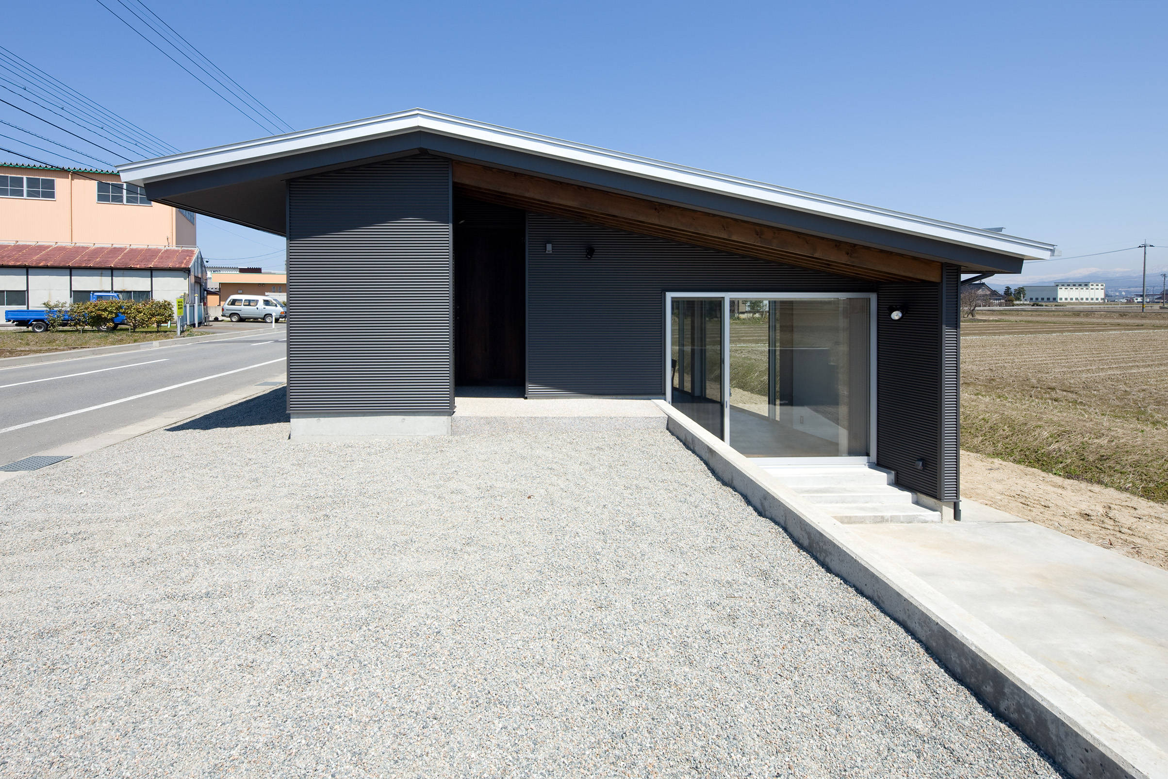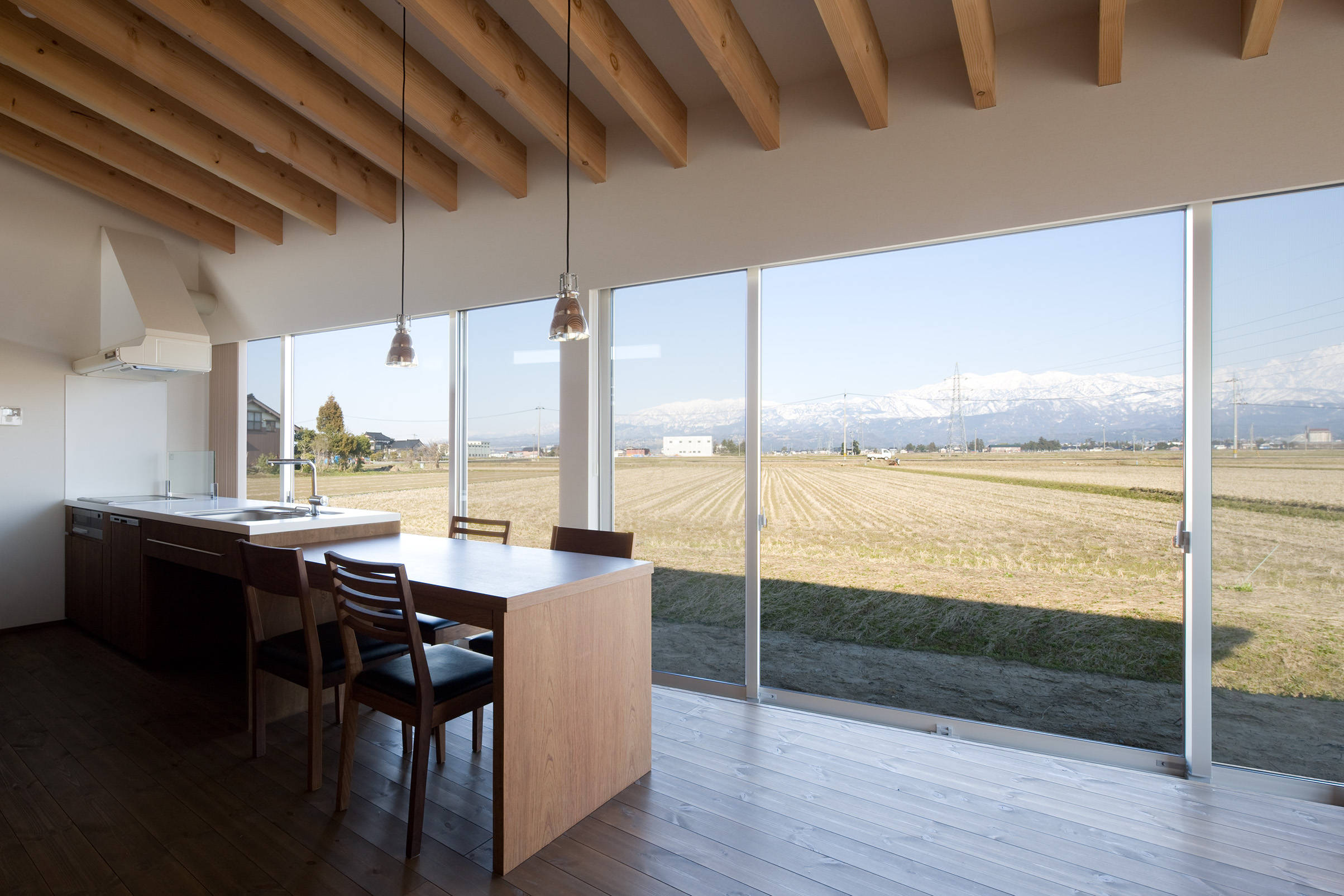 この住宅は、立山連峰を一望できる敷地に建っています。目の前には水田が広がっているため、眺望を遮るものは何もありません。水田に向かって傾斜のある敷地形状を生かし、半階掘り下げるように建てました。そのことが人と外部との距離感を縮めて、車の往来が多い道路に面しているにも関らず、落ち着きが感じられる家ができました。
