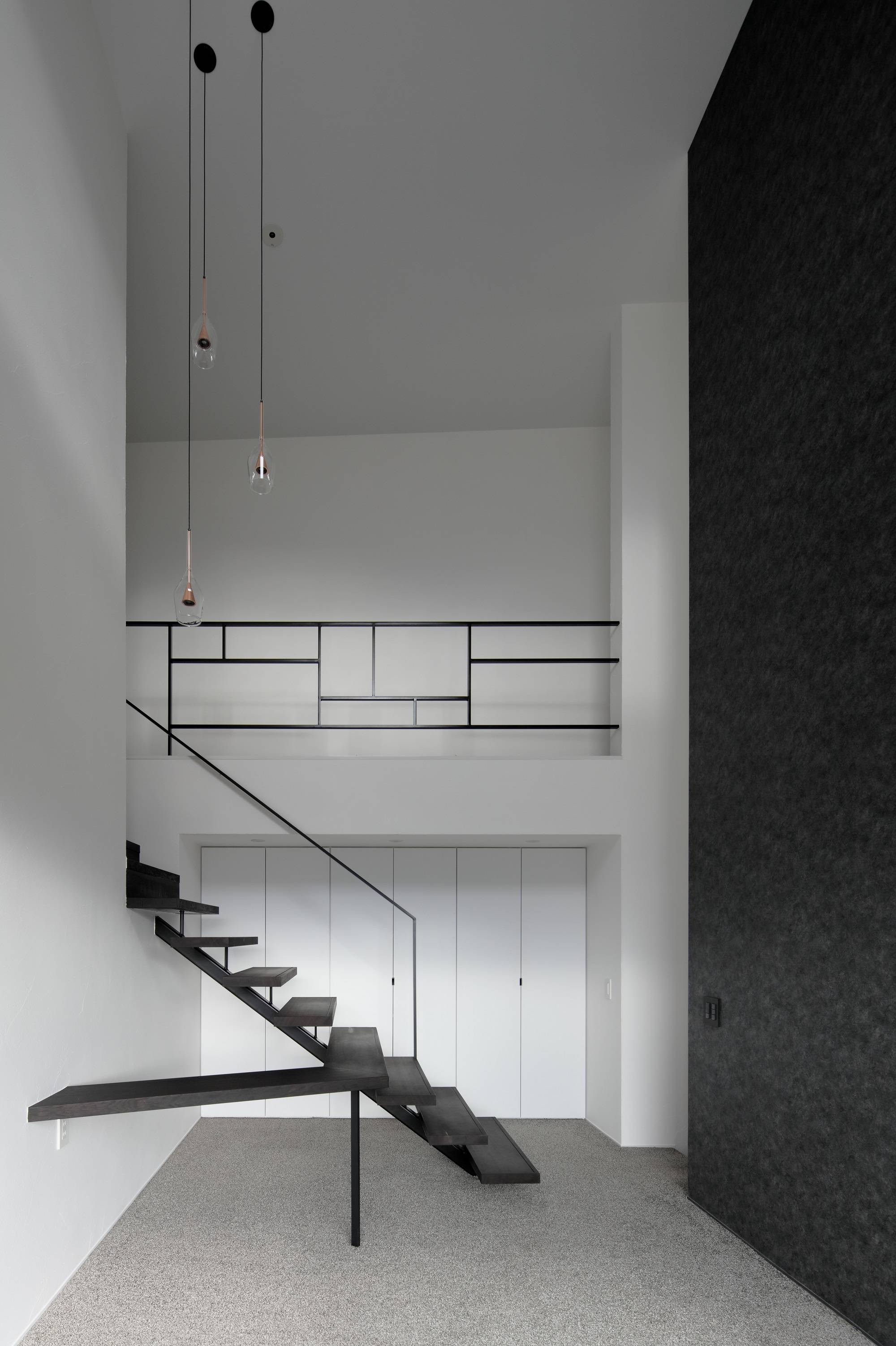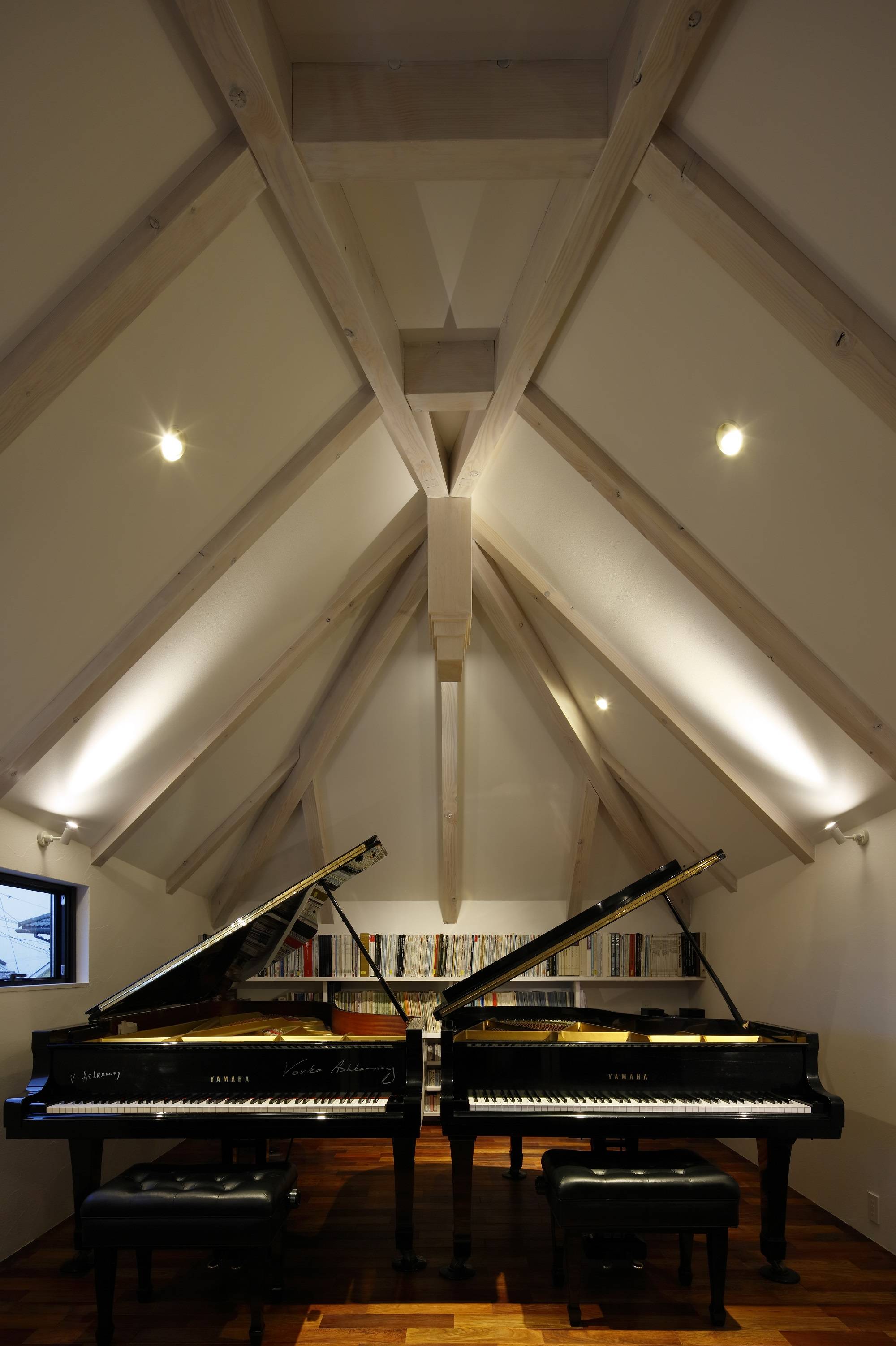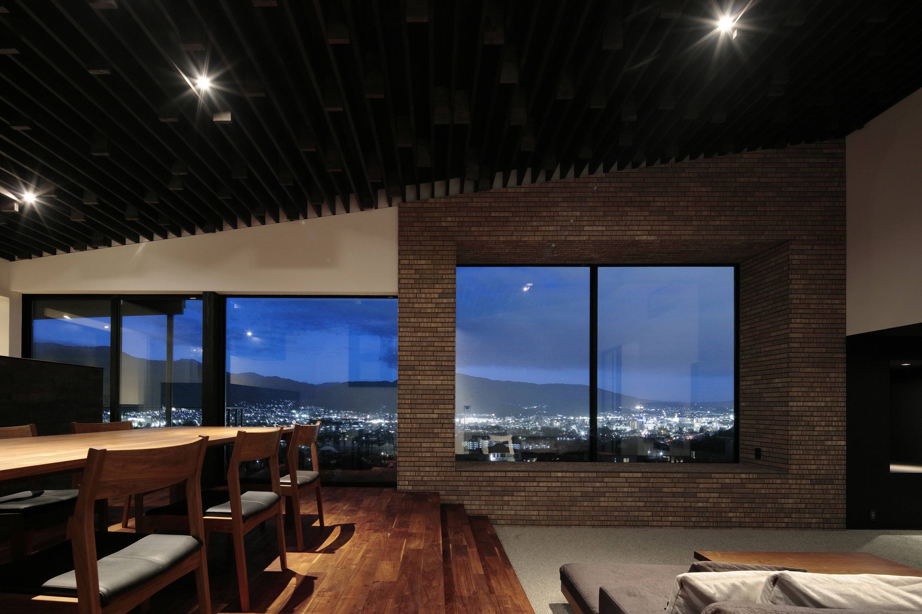 松本城と松本平を眼下に、その向こうには美しい山々の稜線を臨む場所に母の家を設計した。自身も幼少期を過ごした故郷・松本に想いを馳せながら設計した。 空の色、雲の流れ、山の表情、自然の移ろいは壁の切り抜き方に依って、いつまでも新鮮な発見に満ちて眺めることができる。勝手自由に開けているように見えるランダムな開口部は、様々な大小、奥行、仕上、形状、高さで配置することにより、歩き、座る際に、多様なシークエンスを日々楽しめるように考えた窓群である。景色をより強く切り取るために設えたフジツボ窓は、外観を印象的なものとすると同時に、内部の陰影ボリュームをあげる装置として設えている。敷地はくの字に曲がった平面をしており、家のどこからでも松本平を臨むことができる。道路側はプライバシー確保のため閉じたが、反面、景観側は多くの開口を擁する完全片側採光の住宅である。それにより、光のコントラストが強調され、窓配置に加え、より陰翳の強い空間構成となった。また、ピアニストのための音楽堂も離れとして設えた。木構造現しのミニマルな室内は蕪束を採用し、松本らしい伝統的なデザインでありながら、屋根に様々な傾斜を加えることで、稀有な空間にしたいと考えた。自由奔放かつ大胆な内部構成を持たせることができたと思う。