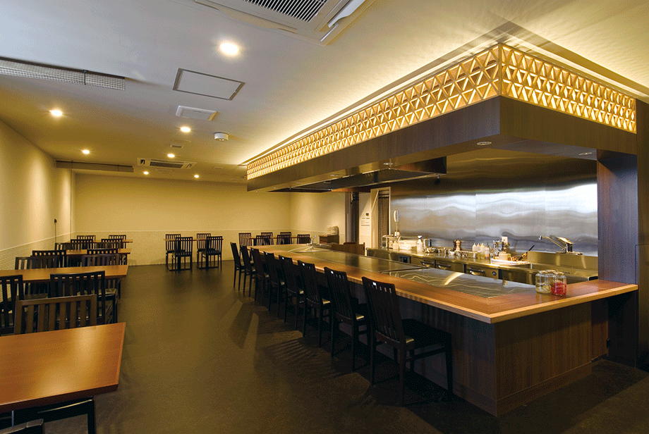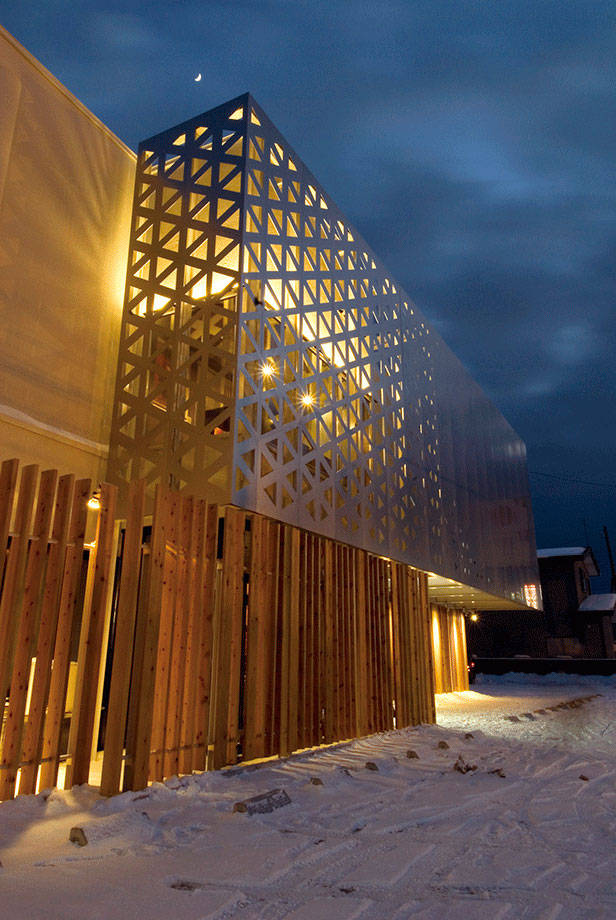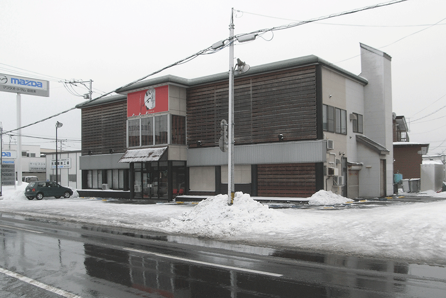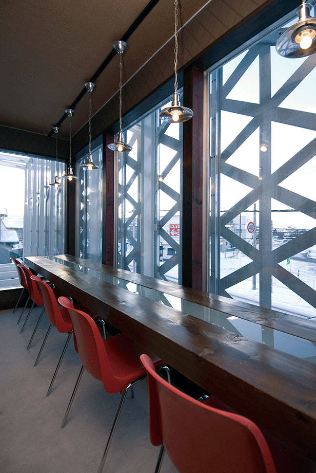 木造2階建、築30年を経た飲食店ファサードのリノベーションである。敷地は函館市内の自動車教習所に面しており、クライアントからは際立つファサードでありながらも、気軽に入れるカジュアルさが同時に求められた。要望に対し、既存本体に構造的な負担をかけることは避け、周辺に自立した鉄骨フレームを建て、ステンレス製パネルと木製ルーバーにより本体を囲い込む提案が採用された。三角形の孔がグラデーショナルに穿たれたステンレスパネルは、内外の環境をグラデーショナルに連続させ、移ろう空の様相をぼんやりと映し込む。一見ランダムにもみえる木製ルーバーは、鉄骨下地を隠ぺいするよう配置され、来客を店内へと誘導する。新しく生まれ変わったファサードは、対照的な二種の素材の併用により、閑散とした周辺環境を触発すると同時に、自然の気配を身にまとい来客を暖かく迎え入れる。内部は2階のオープンキッチンを中心に改修している。