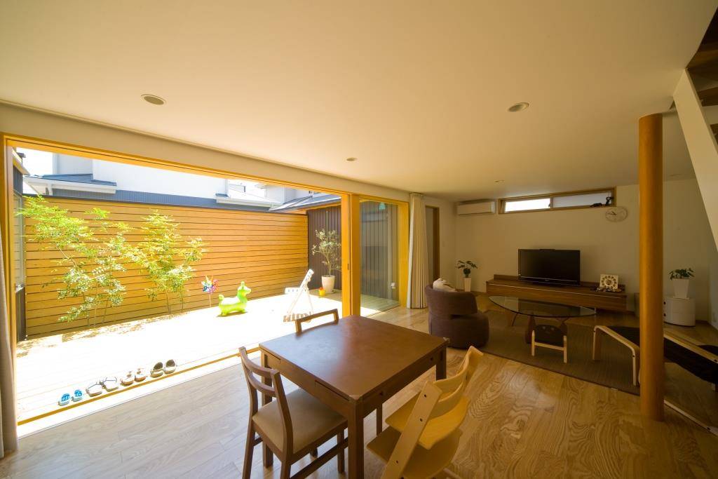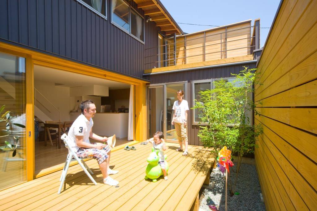 シンボルツリーと中庭の木々(シマトネリコ・オリーブ)の四季の変化を楽しめ、デッキが家族の安らぎのある居心地の良い場所となることを期待している。