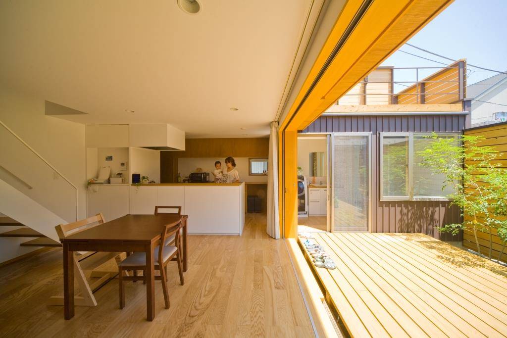 延床面積は26坪だが、居間とデッキをフラットで繋ぐことにより、より広さを感じられるように設計した。厳しい敷地であっても、外部との関係を大切にしたプラン。