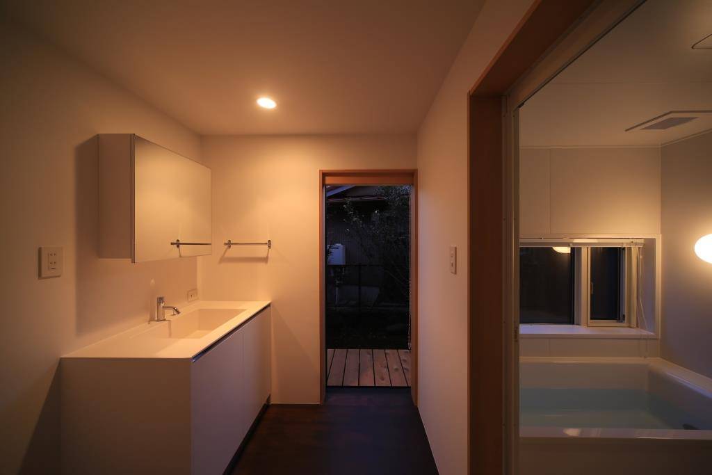 洗面室・浴室は、左右の棟より道路側に引きを取り、濡れ縁を設け、明るい水廻りとしている。