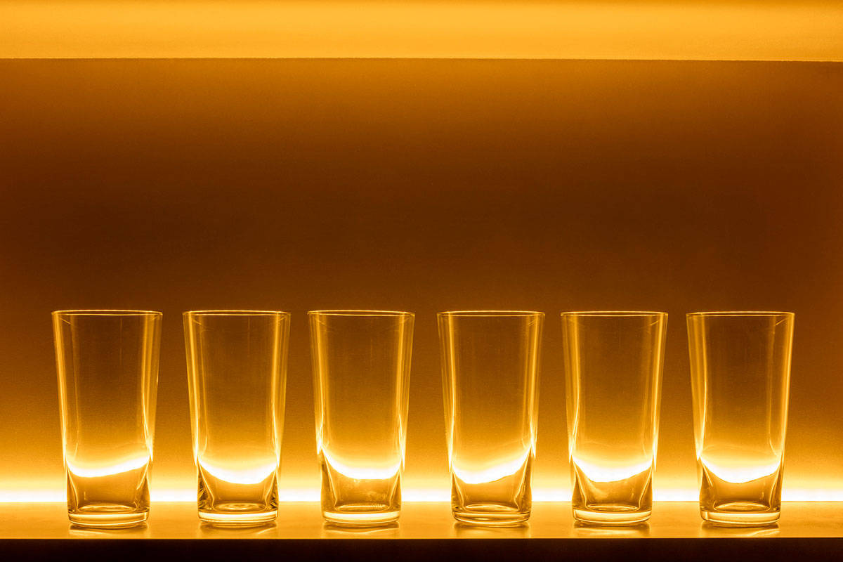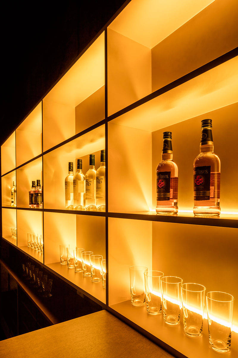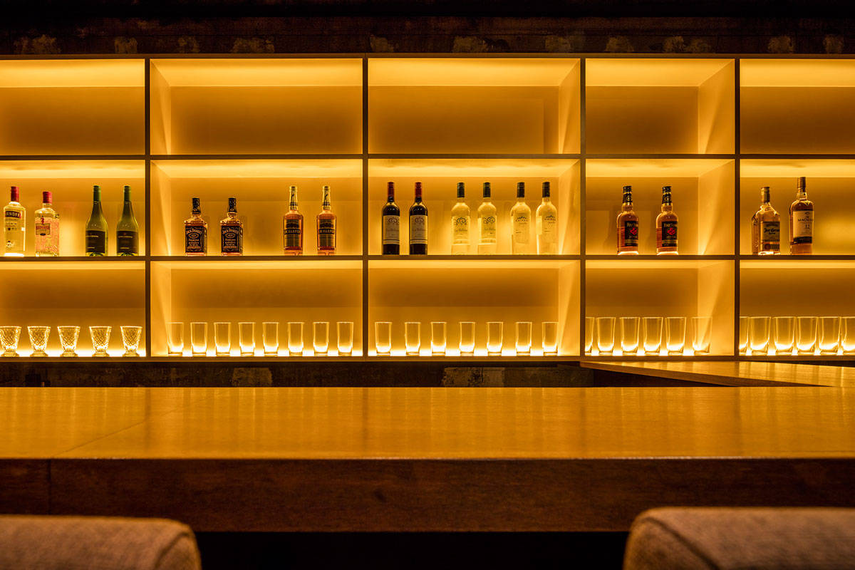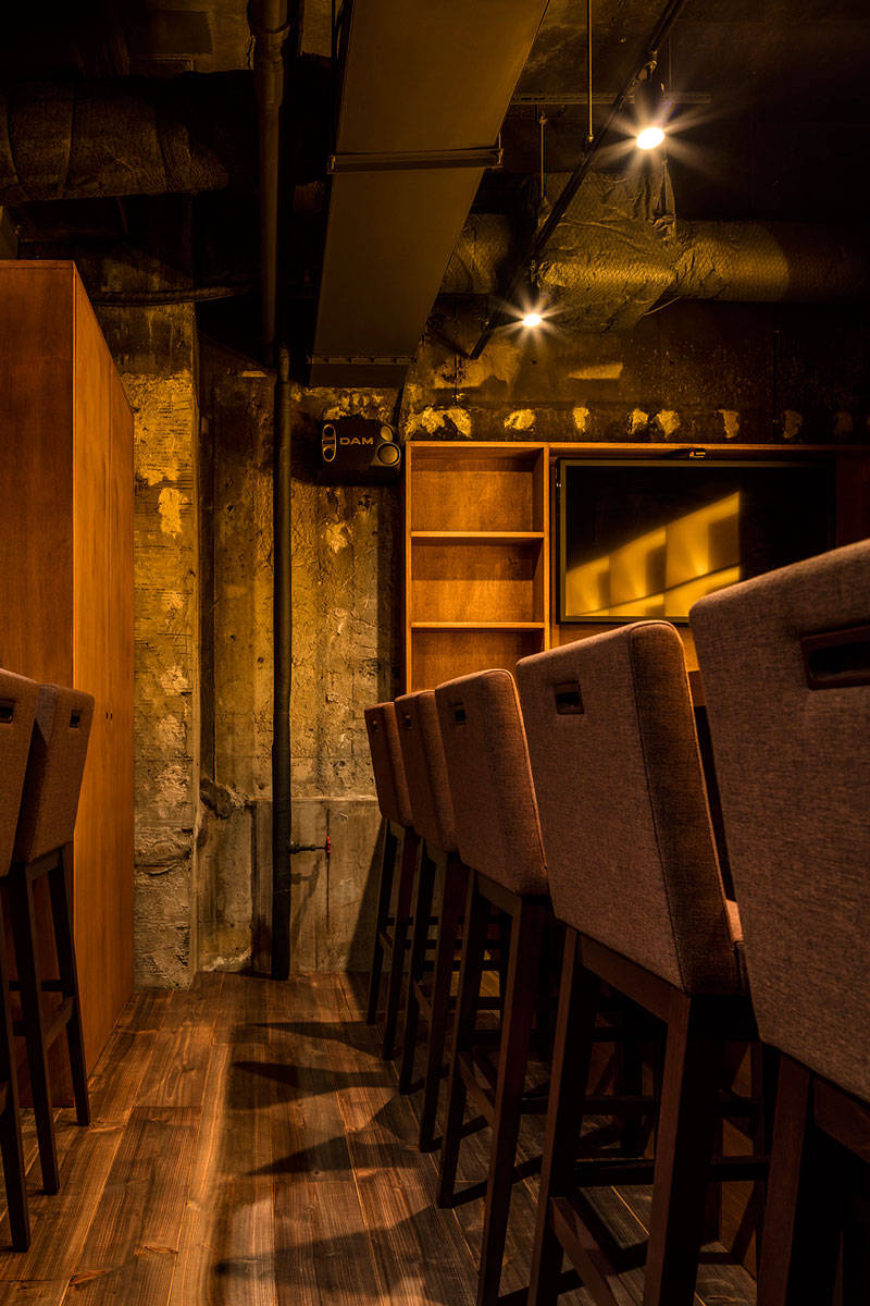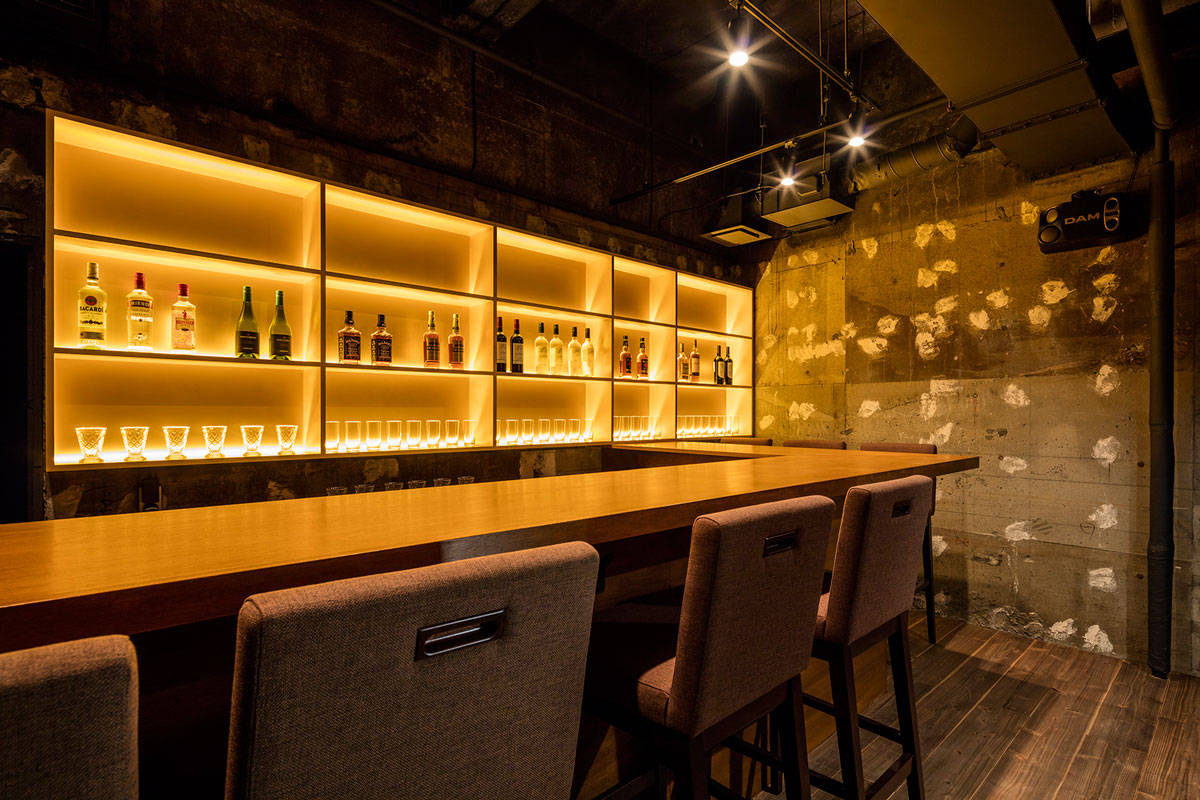 東京都内、用賀駅ビルの地下1階に位置する5坪の小さなバー。ボヤで黒焦げになった既存の壁や天井はすべて剥ぎ取り、あらわになったコンクリート躯体に、その記憶を留めることにした。新たに造作したカウンターや棚は、全てラワンベニヤと塗装のみで仕上げている。ゴールドに塗装されたボトル棚がカウンターや壁を金色に照らし出す。ローコストながらも、華やかで居心地のよい空間が実現できたように思う。