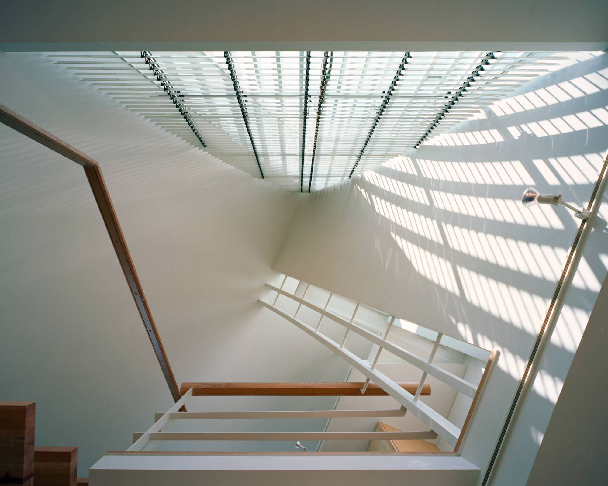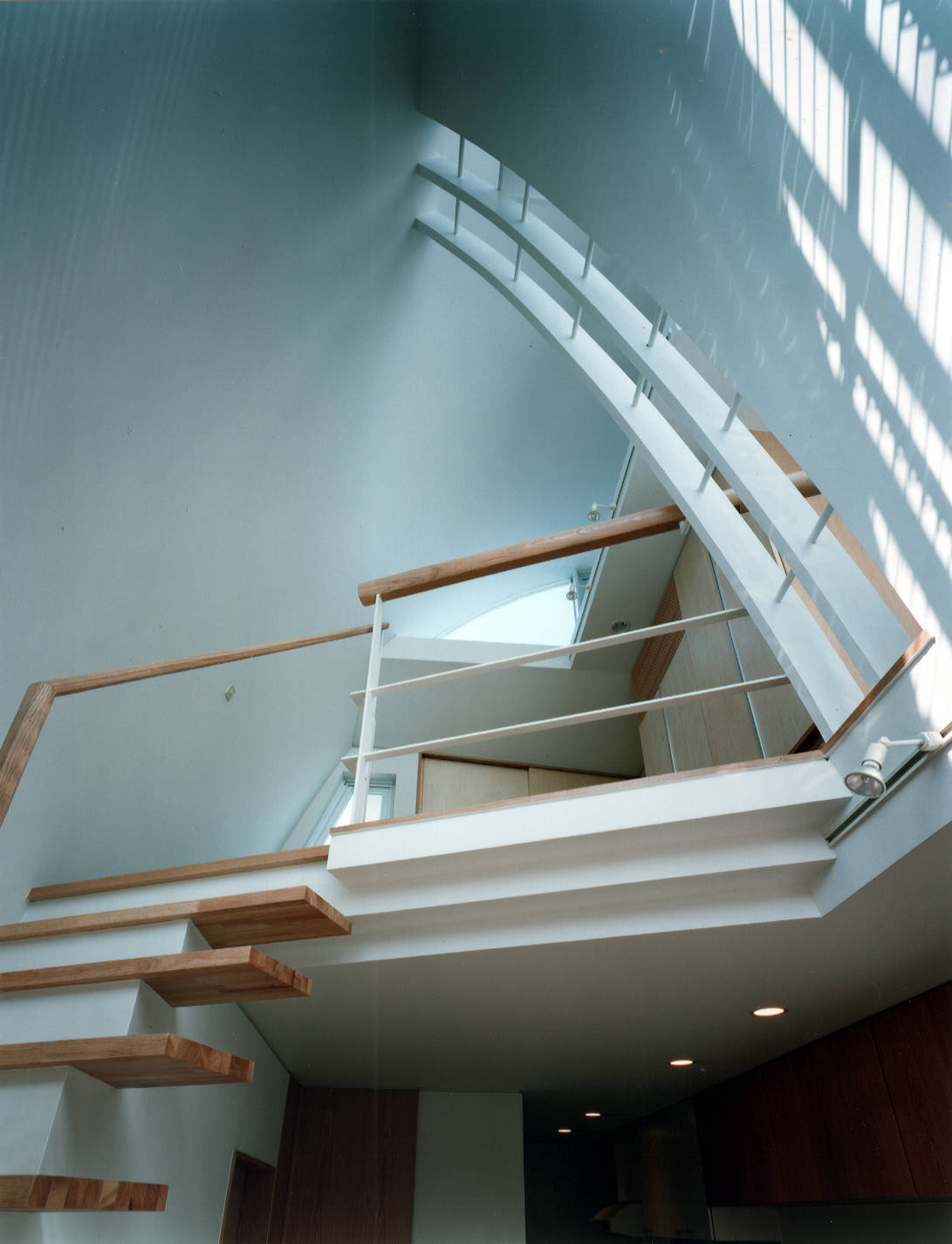 外壁がそのまま屋根へとつながる大きな曲面にすることで、小さいながらも伸びやかなスケールを感じさせる外観としました。円弧の屋根はそのまま内部を包み込み、守られた落ち着きの中で、空へとの広がる内部空間をめざしました。