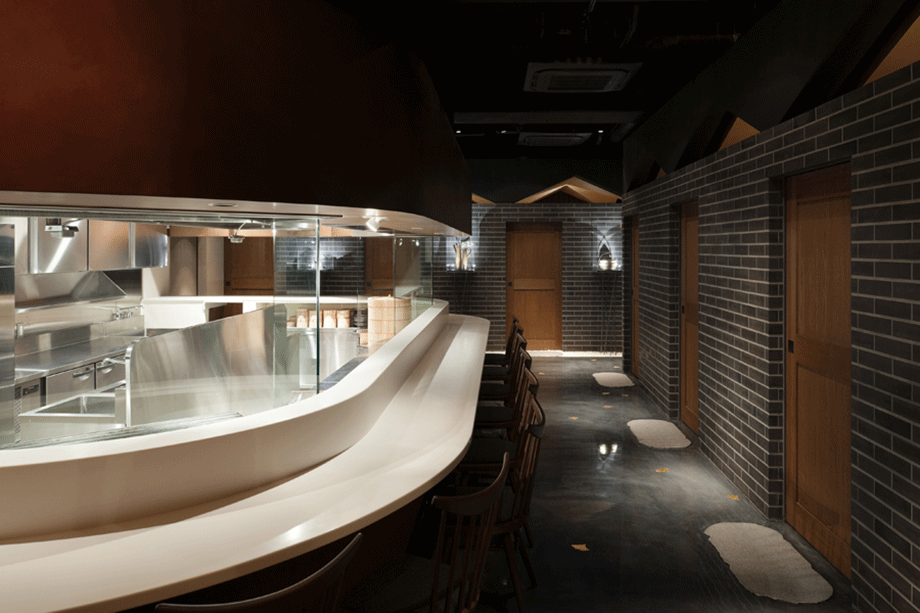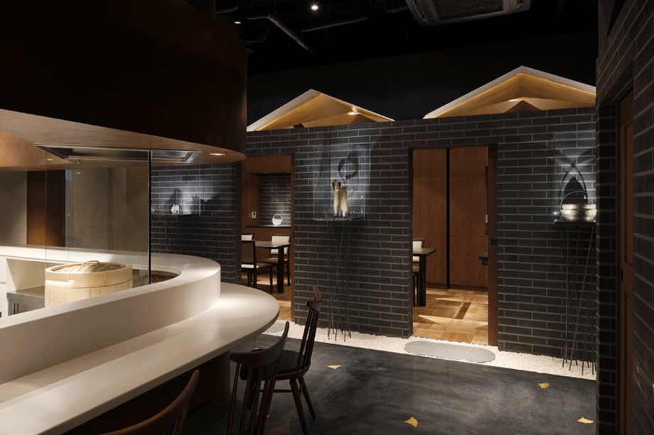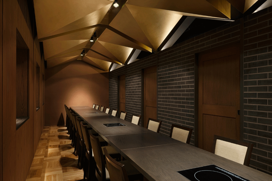 客席はカウンターと個室に大別できる。オープンキッチンを囲む白いカウンター席では、炭火焼や蒸し物が調理される様子が楽しめる。客同士もさりげなく目配りできる距離感を大切にした。個室は4人部屋が4室並ぶタイプと、10人部屋からなる。金色に塗装された4人部屋の天井は、2つの家型が交差してできた形状となっている。部屋同士は収納式の大型建具で仕切られており、建具収納時はパーティー・ルームとして一体的な利用も可能である。