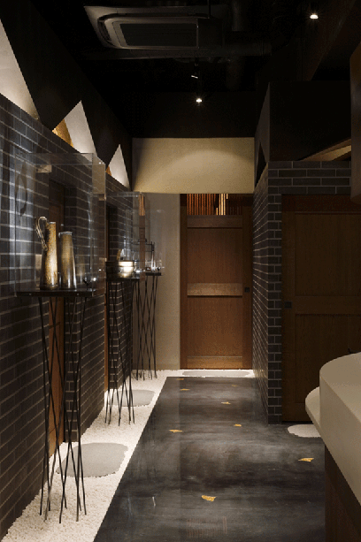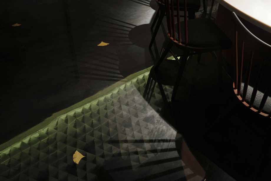 店の入口付近には神宮外苑の銀杏並木に想を得たアーチ状の照明装置が浮かんでおり、季節の移ろいを色の変化で表現する。個室が軒を連ねるホールは、開放的な直天井とし、個室に通ずる露地空間のようにしつらえた。床には銀杏の葉をかたどった金箔が散りばめられ、水が打たれた露地のごとく艶やかな樹脂で封入されている。