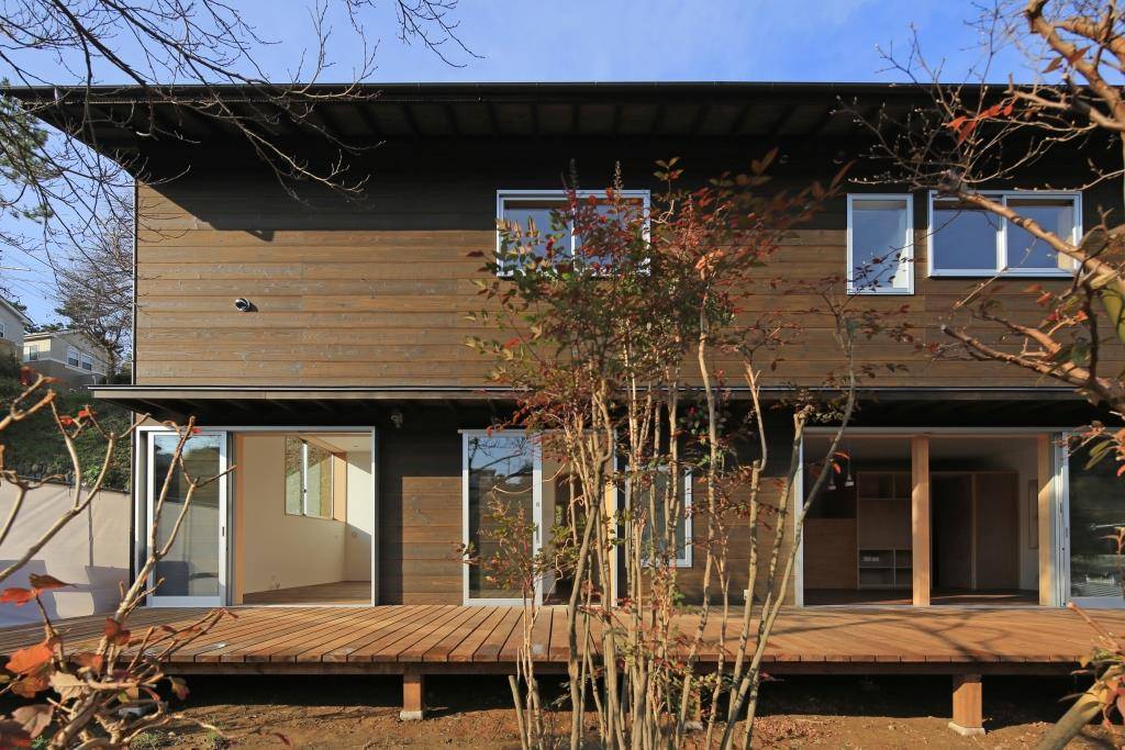 片瀬山に寄り添うような緑豊かな雛壇状の敷地に建つ二世帯住宅。