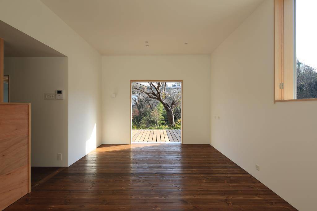 親世帯の食堂・居間は庭に大きく面するため外との繋がりを意識した空間とし、子世帯の食堂・居間は庭に面する部分が少ないため、天井高(2.8m)とし高窓から光を入れた篭れる空間としている。