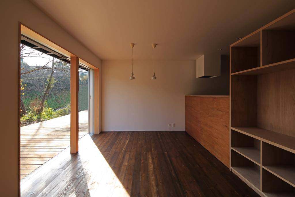 スロープ状としたのには親世帯の車いす対応、建物を低くすることによる隣家への圧迫感低減のためである。