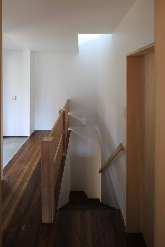 親世帯延床18坪、子世帯延床24坪と狭小な住宅の中、玄関が狭くなりがちなところを拡がりの感じられる玄関とすることに注力した。