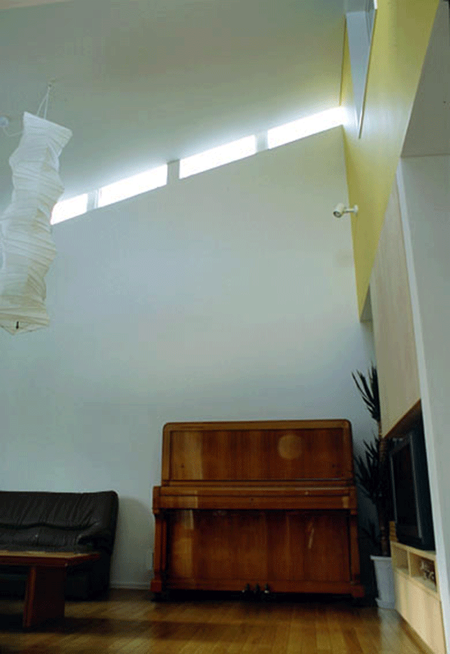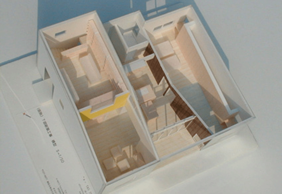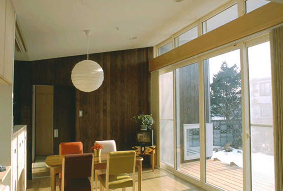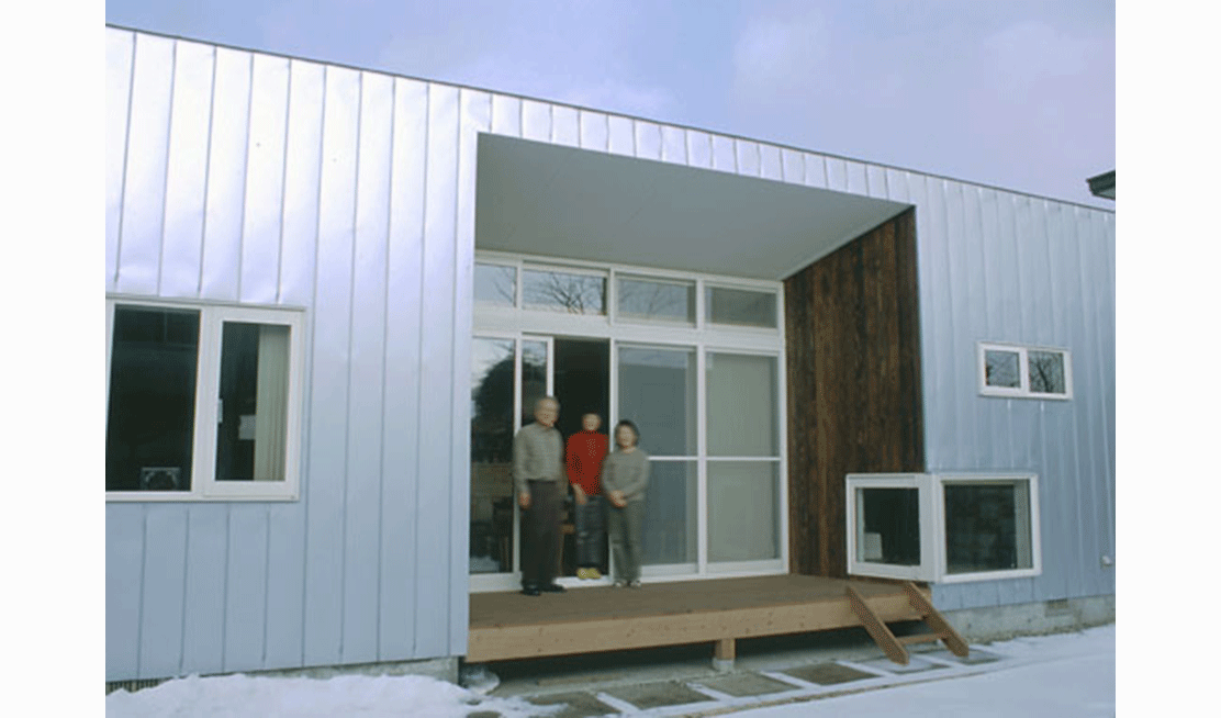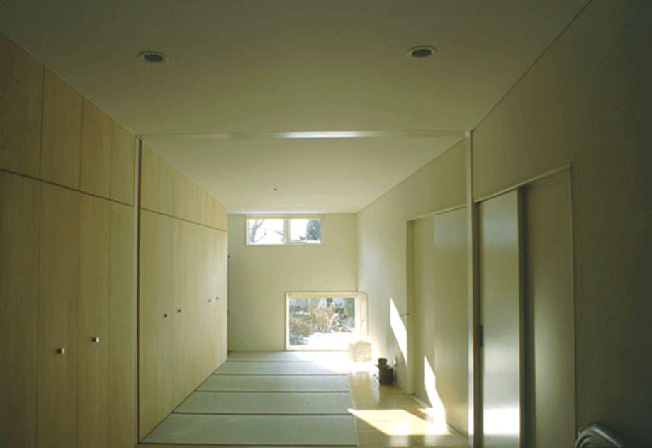 函館市の郊外に位置する夫婦2人の為の住宅。室内は南北に伸びる壁面により3領域に分節され、各々が異なる断面形状となっている。舞台のような開口をもつ中央の領域は、オープンキッチン、ダイニング、テラスの順に庭へと連続する観照装置である。西側領域は、吹抜けのある2層で、玄関、リビング、書斎などからなる。東側は高さを抑えた寝室、和室で構成されている。3領域の視線の広がり方を明確に差異化することで、その都度生活シーンに応じ、居場所の雰囲気や庭との関わり方を選択、スイッチできる。小さな家ながらも生活シーンの多様性を楽しむことができる。