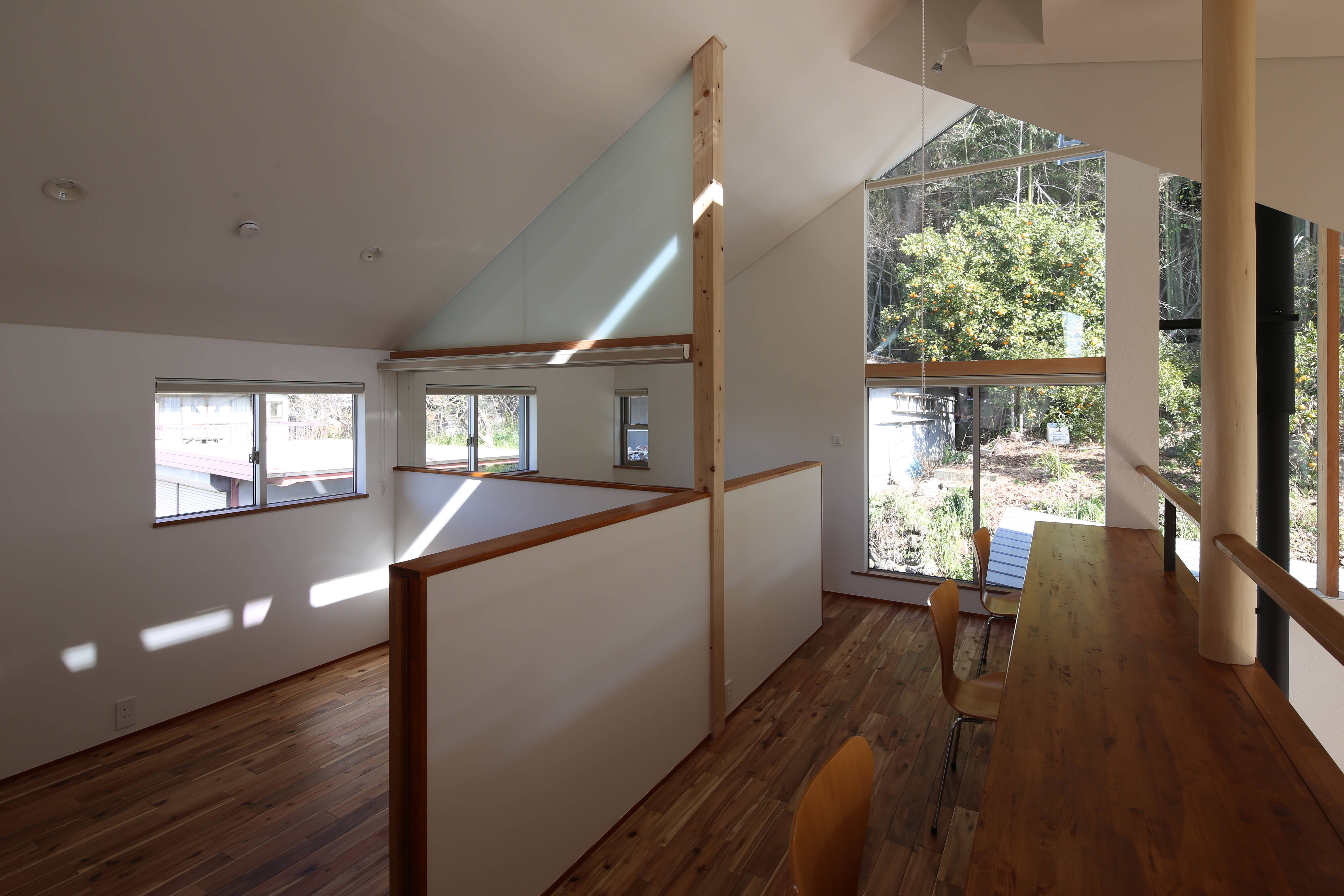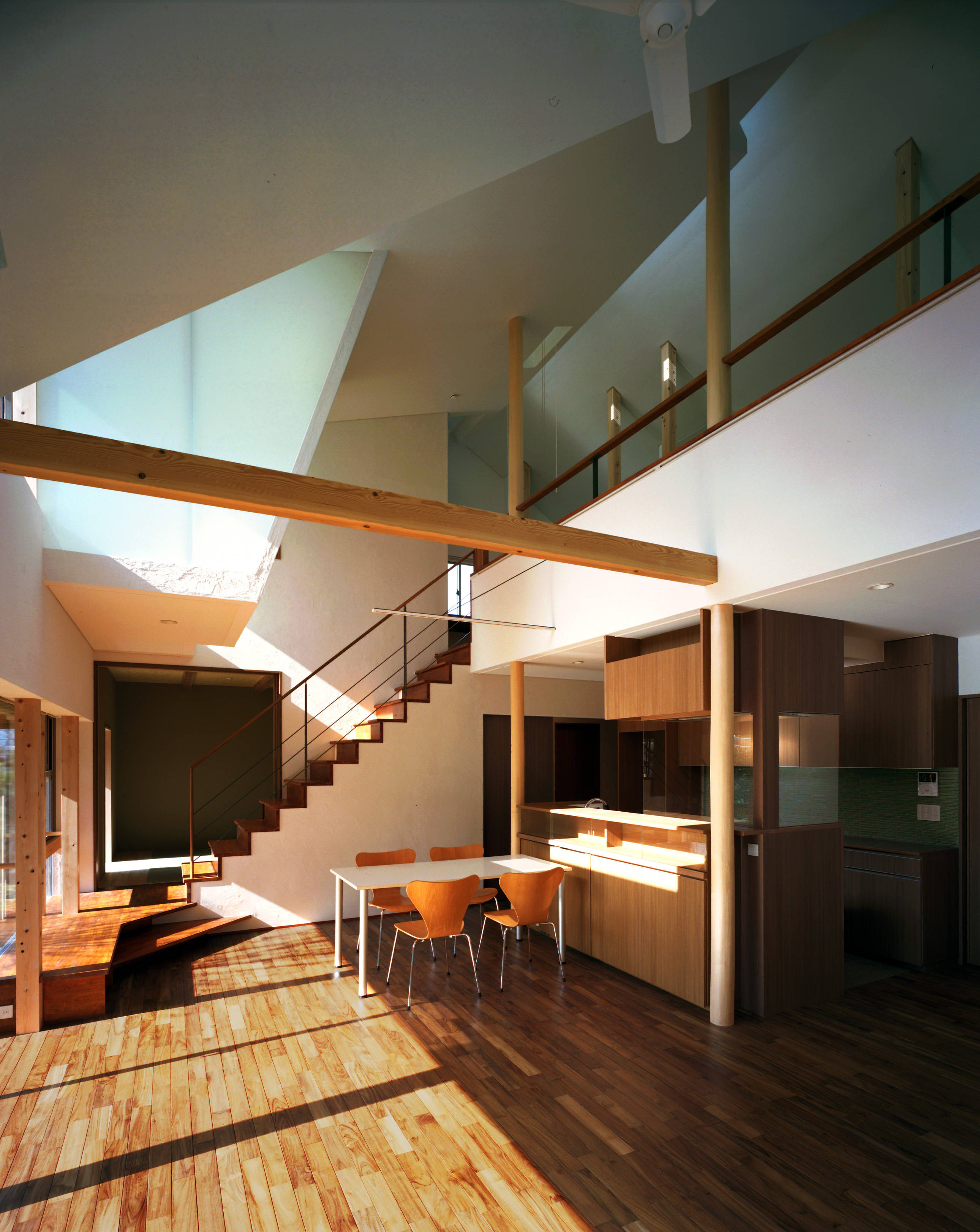 2階はリビング吹抜に面して子どもたちのための大きなカウンターを設け、一人一人が自分の席において独立した落ち着きが感じられるように、急勾配の天井や、斜めにはり出すサンルームによって、リビングの大空間を適度に分節していきました。