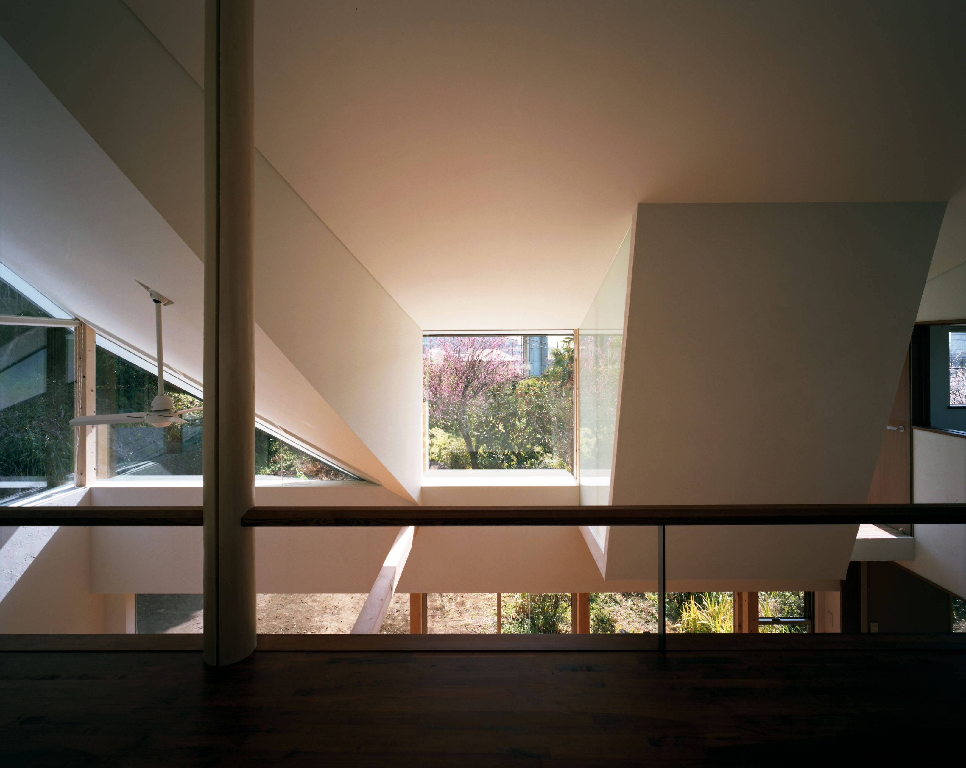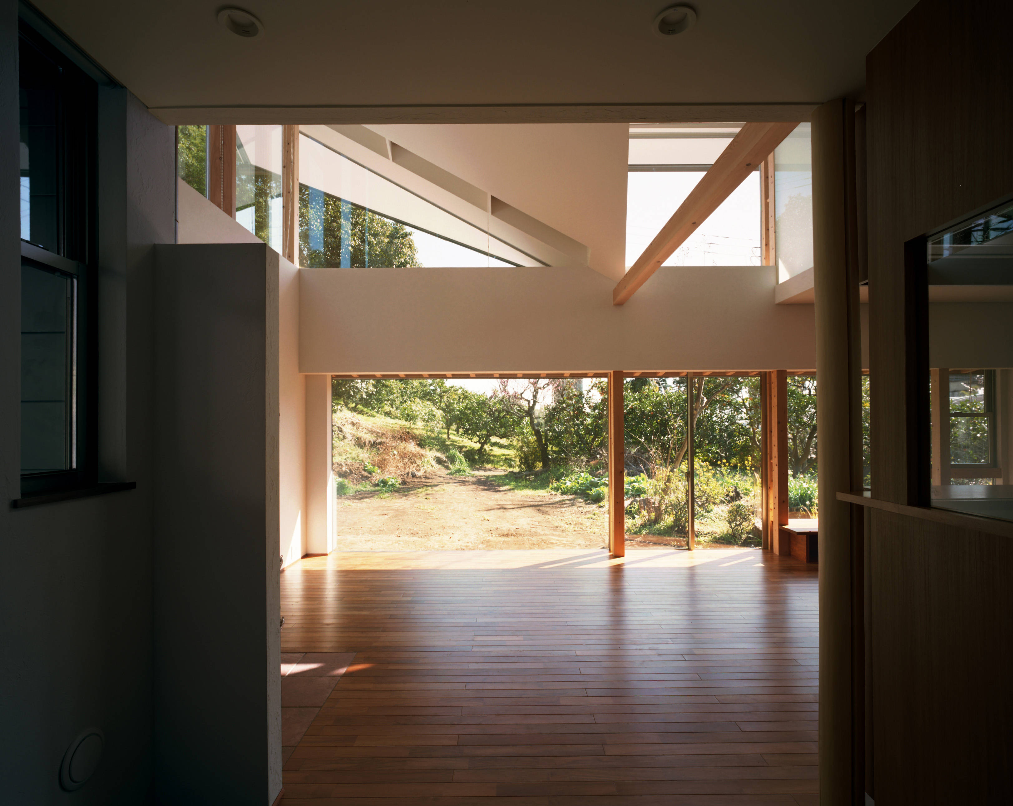 リビング全体を見渡そうとすると、急勾配の壁や天井が視界を斜めに遮ります。同時に遮られない残りの部分から奥へと視線が導かれていきます。こうして遮られた視界とつながった視界とが斜線を境にパッチワークのように組み重なっていきます。木立、岩などによって視界が見え隠れすることで先へと心が誘われていく山での体験にも通ずるこの建築空間の中で、住み手の心が、日々新しい世界を感じつつ、豊かに育まれていくことを願っています。