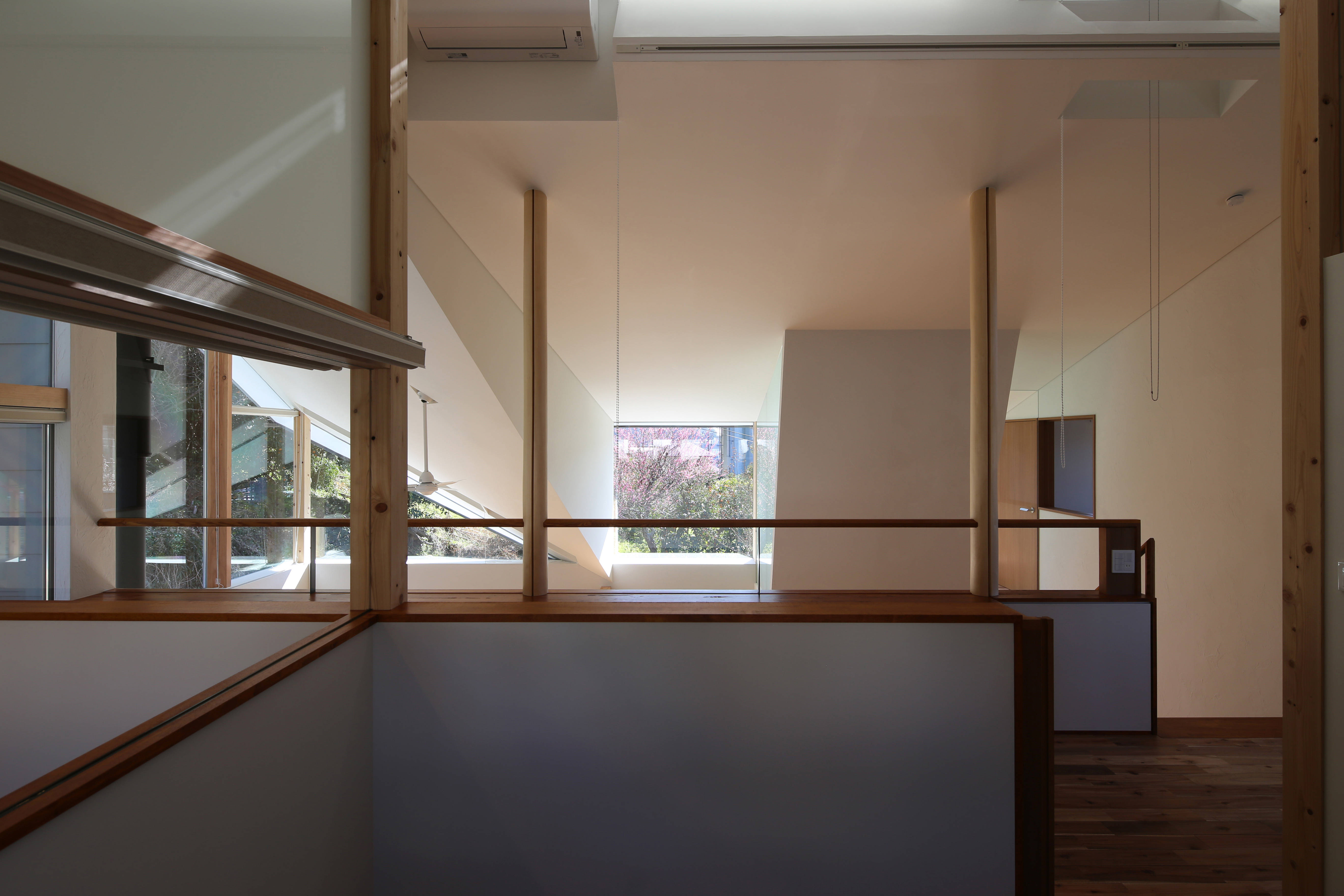 小部屋(サンルーム)をリビング吹抜の南側上部に吊り下げ、高速道路の存在を遮蔽するようにしました。