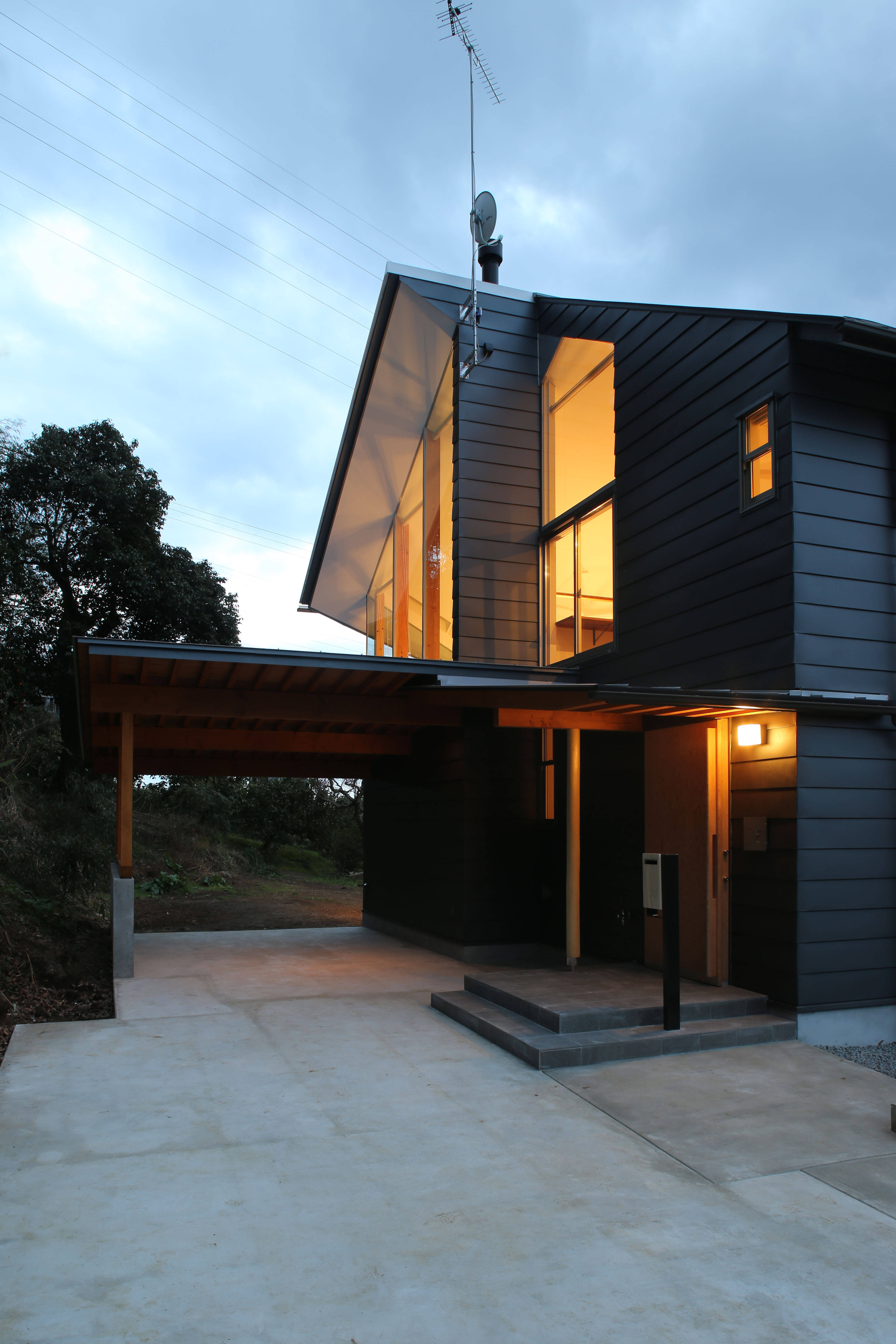 東に山が迫る山のふもとに建つ、夫婦と3人の子どものための家です。