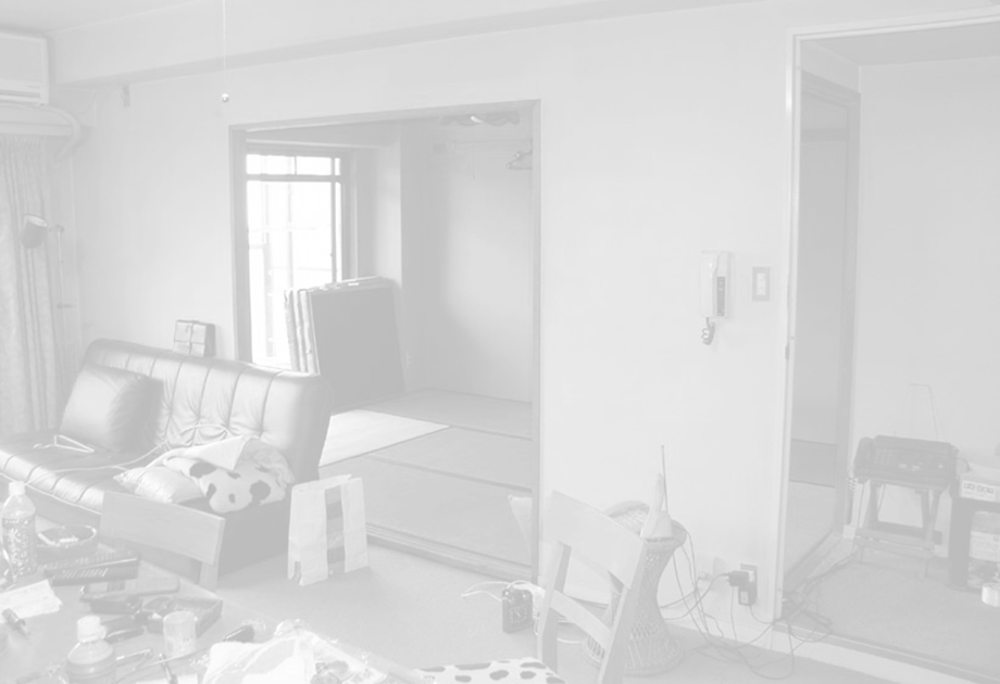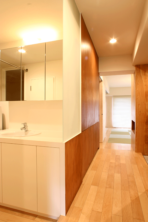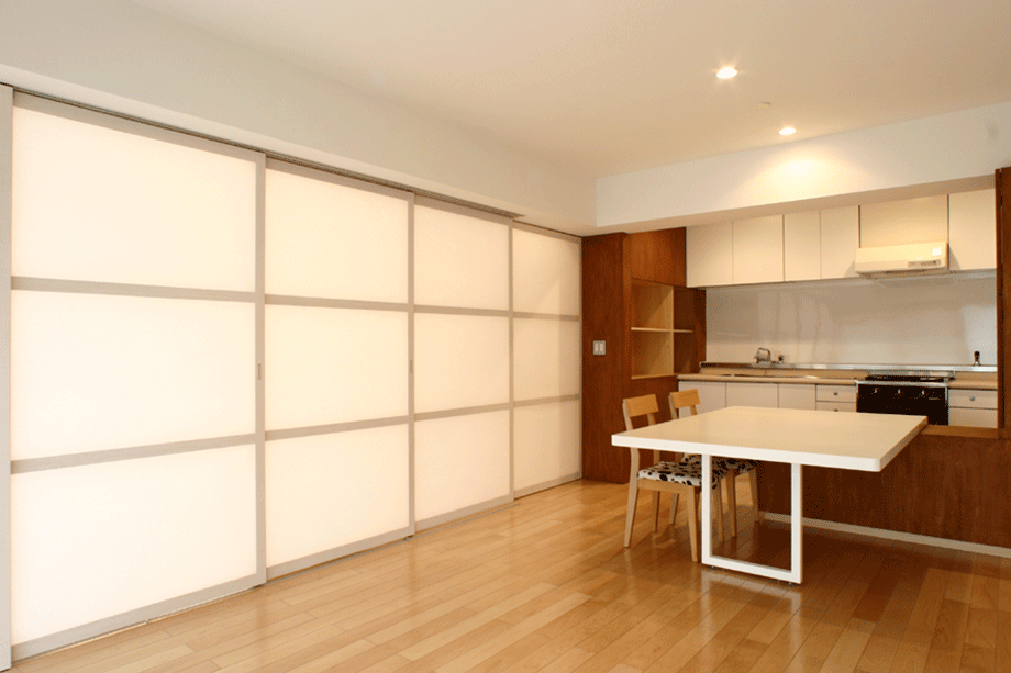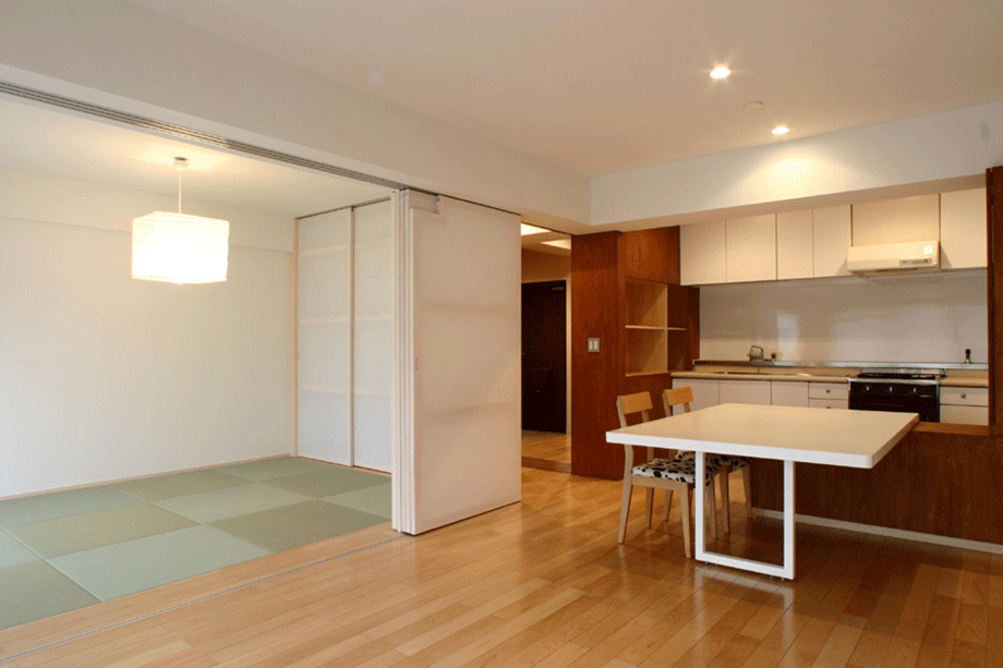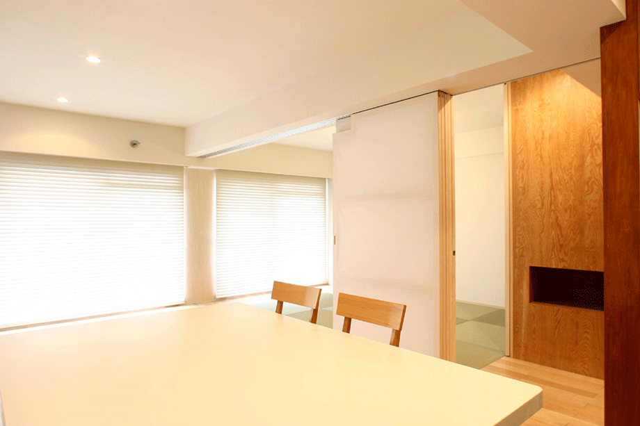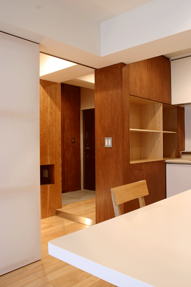 都内の一般的な3LDKマンションのリノベーションである。時折ビジネスで上京するクライアント夫妻は短期間の滞在のみで、普段は長男が一人で暮らす。極端な間取り変更は不要で、夫妻の訪問時にはゆったりくつろげる空間が望まれた。流動的な使われ方をふまえ、和室とリビングの間にあった固定壁を撤去し、代わりにやわらかく光を通す連動引戸を設けることで、利用人数に応じて1室にも2室にも変えられるようにした。壁や造作家具の仕上げには、ステインを施したシナ合板と構造用合板を用いた。白の壁を背景に複数の木の境界面が各々の居場所を緩やかに切り分ける。家具や可動間仕切などを造作する代わりに、水廻りは必要最低限の交換とし、ローコスト、短工期化を図った。