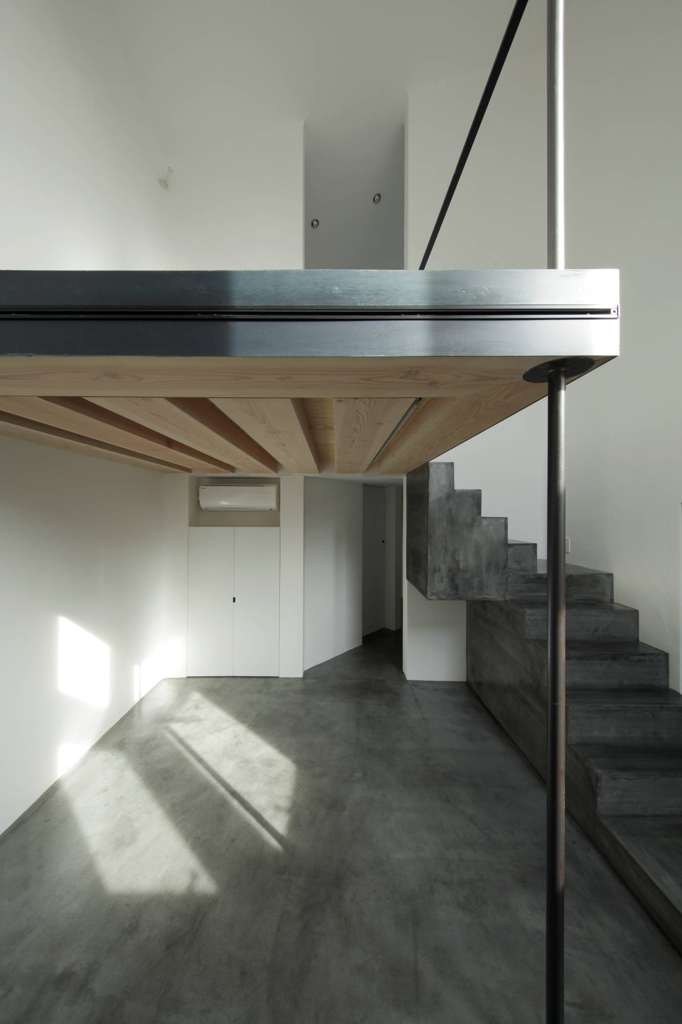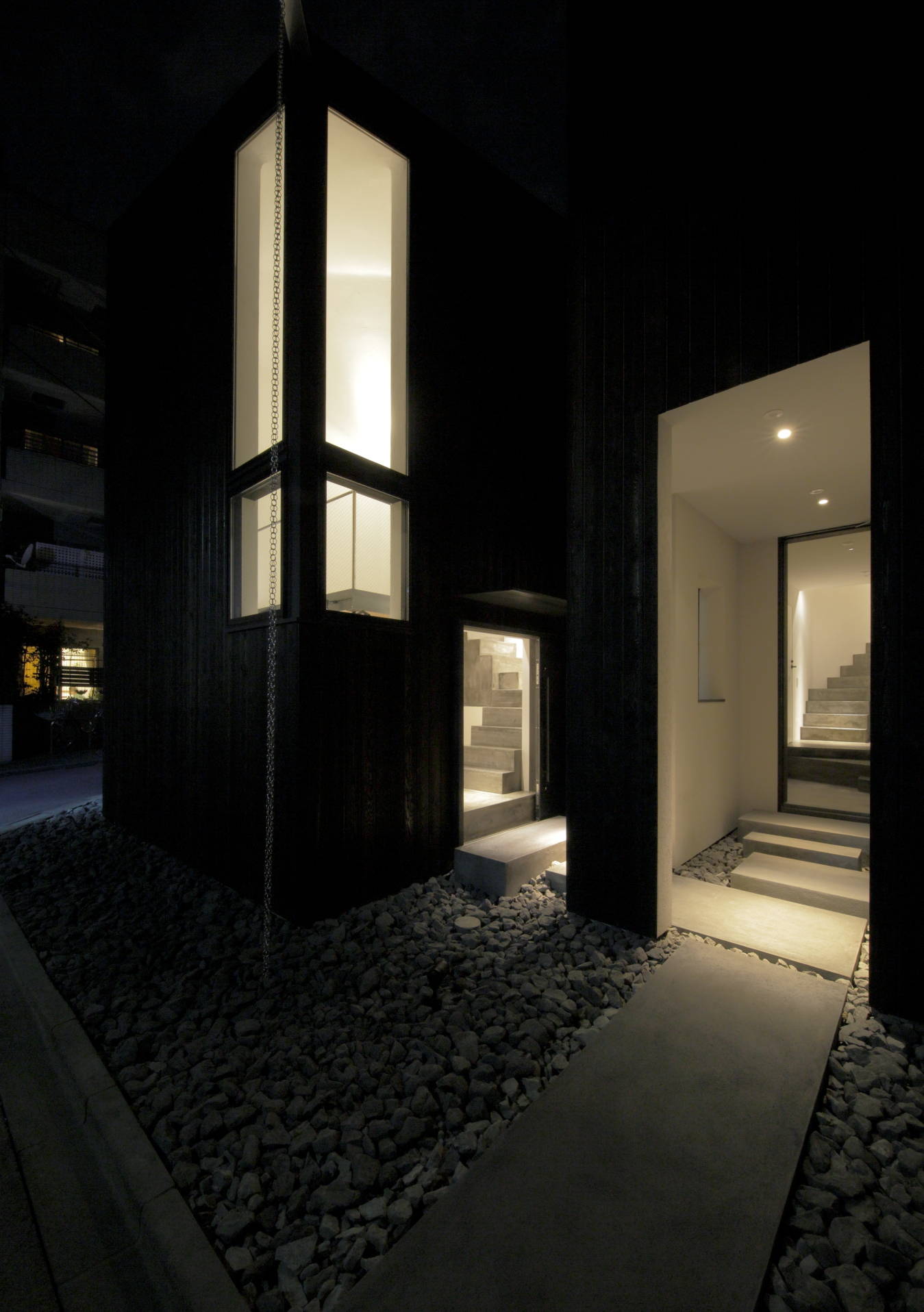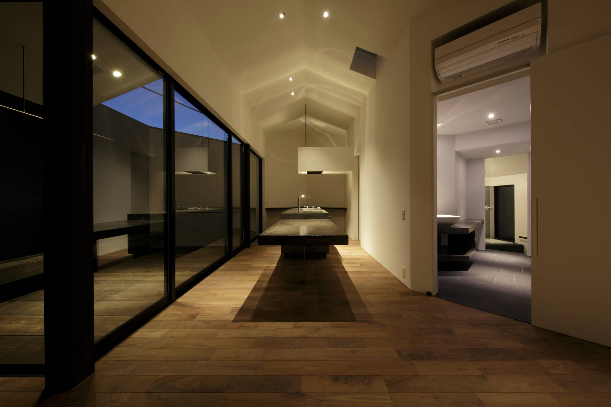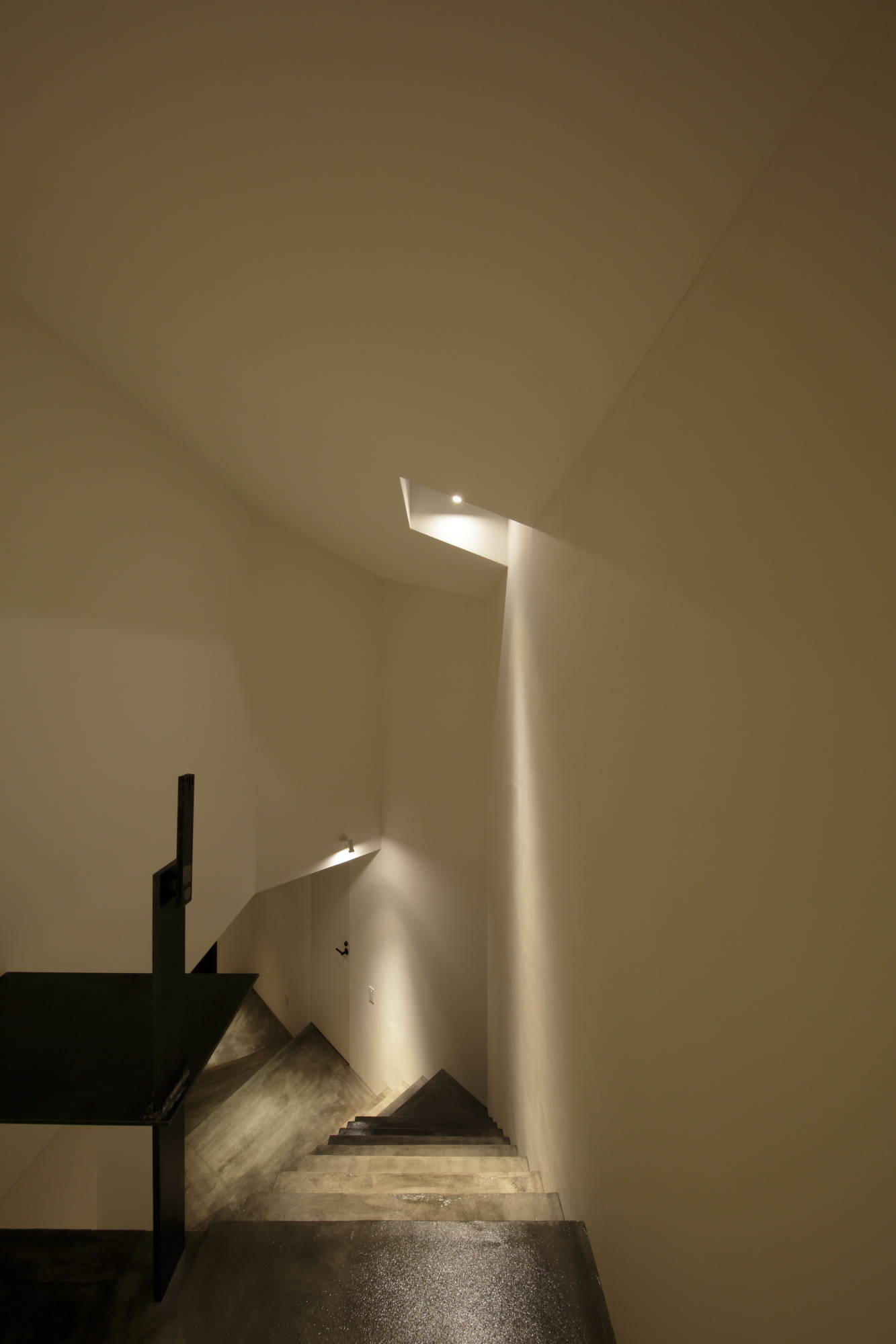 ジュエリーデザイナーの奥様のアトリエを擁する住宅。敷地は5角形で、変形している部分が道路に面していた為、そこに ”繭(まゆ)” のような塊を作り、 人の目に留まるようなファサードとした。住宅街にあるため、全体的に閉じた状態としながら、スリットを入れて居住空間と分断すると共に光と風を 通す計画とした。敷地形状から自然発生的に導かれた45度ラインにより室内には様々な見え方が現れる。 シンプルに美しく住まいたいというクライアントのために室内は極力装飾を排しながらも、重量感ある質感の素材を多用して、 印象的に落ちる絞られた光の空間とした。各所のディテールに少し味付けをして触れる度にその個性を感じる家としたかった。 長い時間を掛けて愛着の湧く住宅になってくれればと思う。