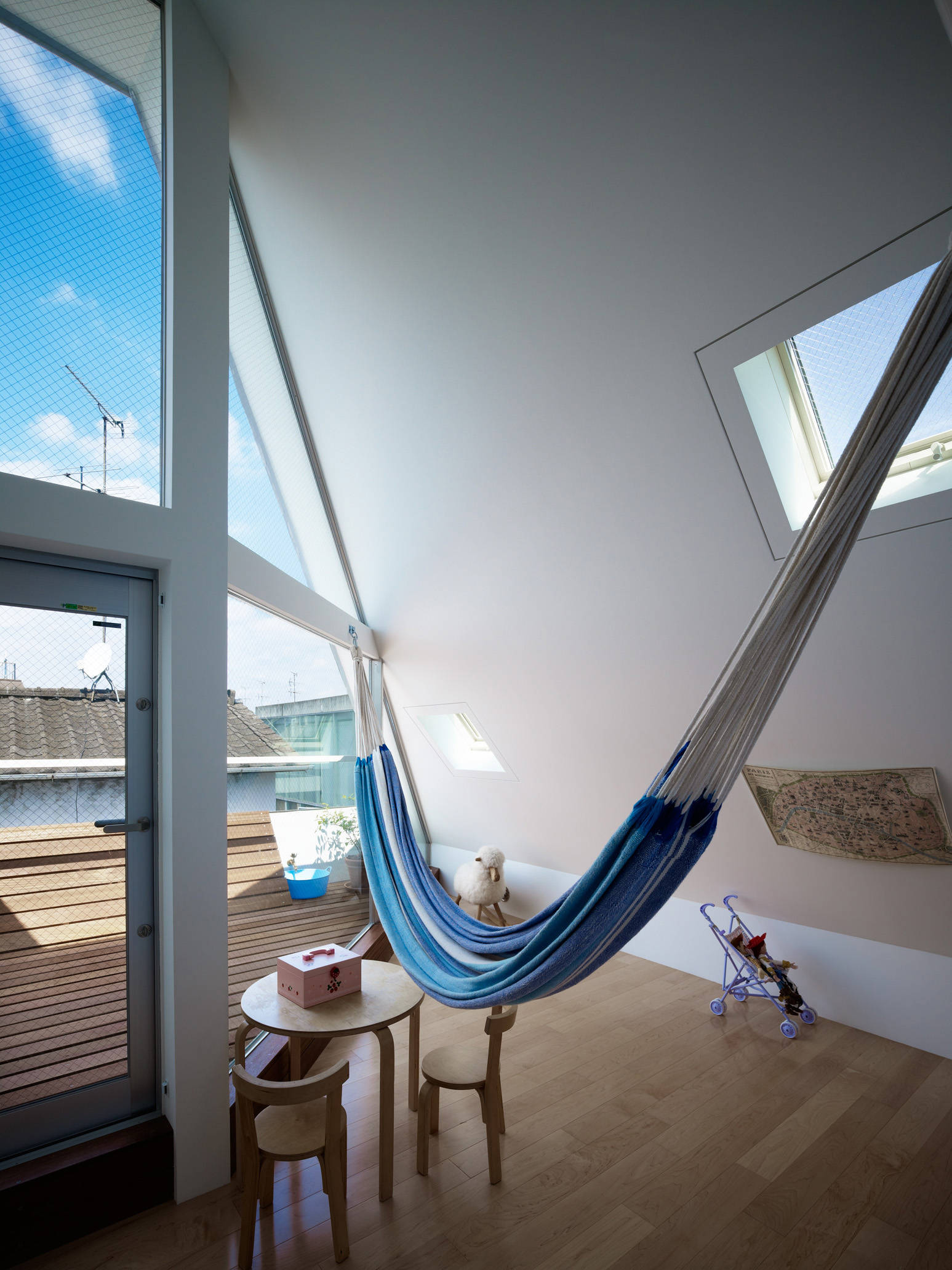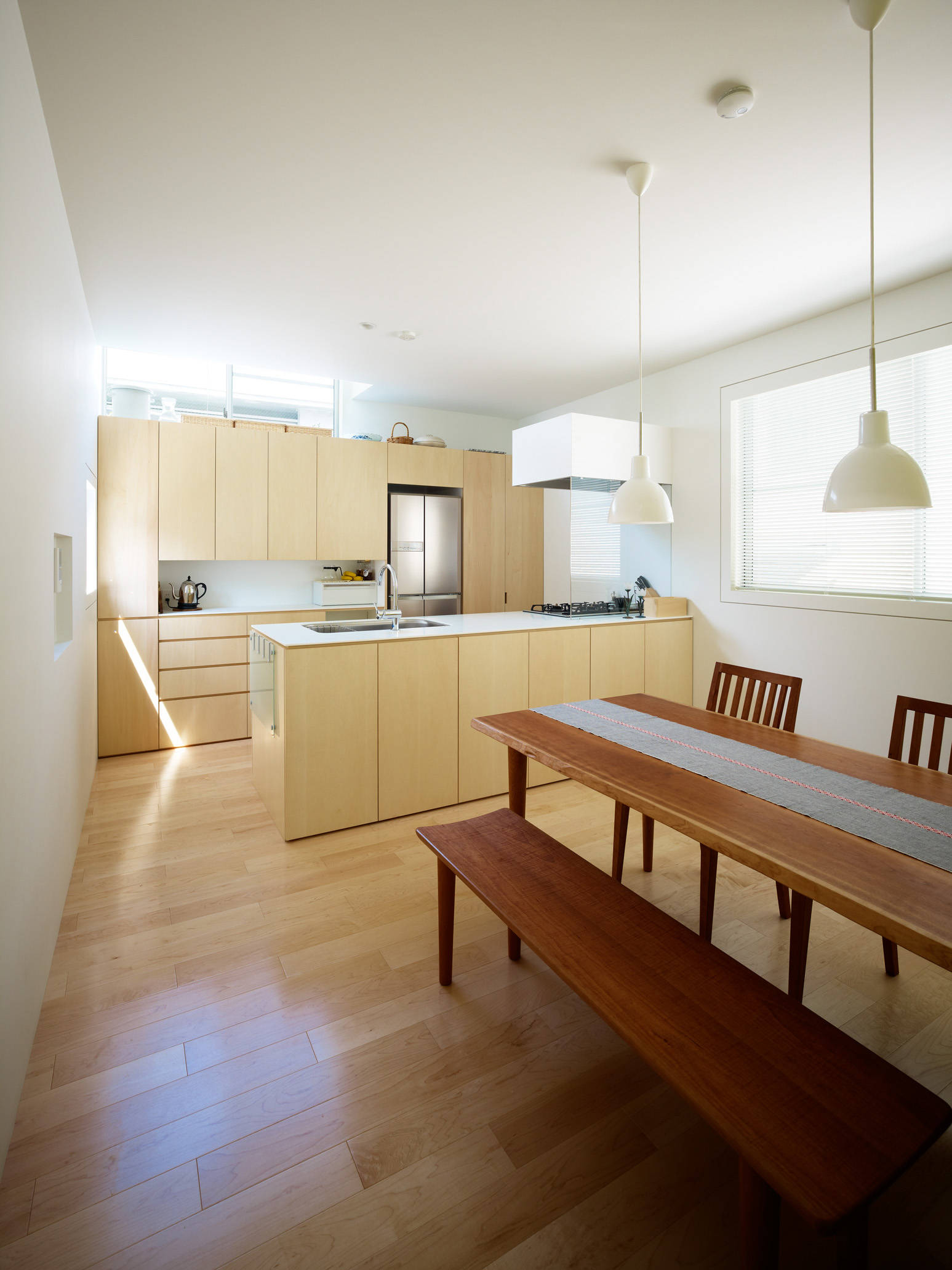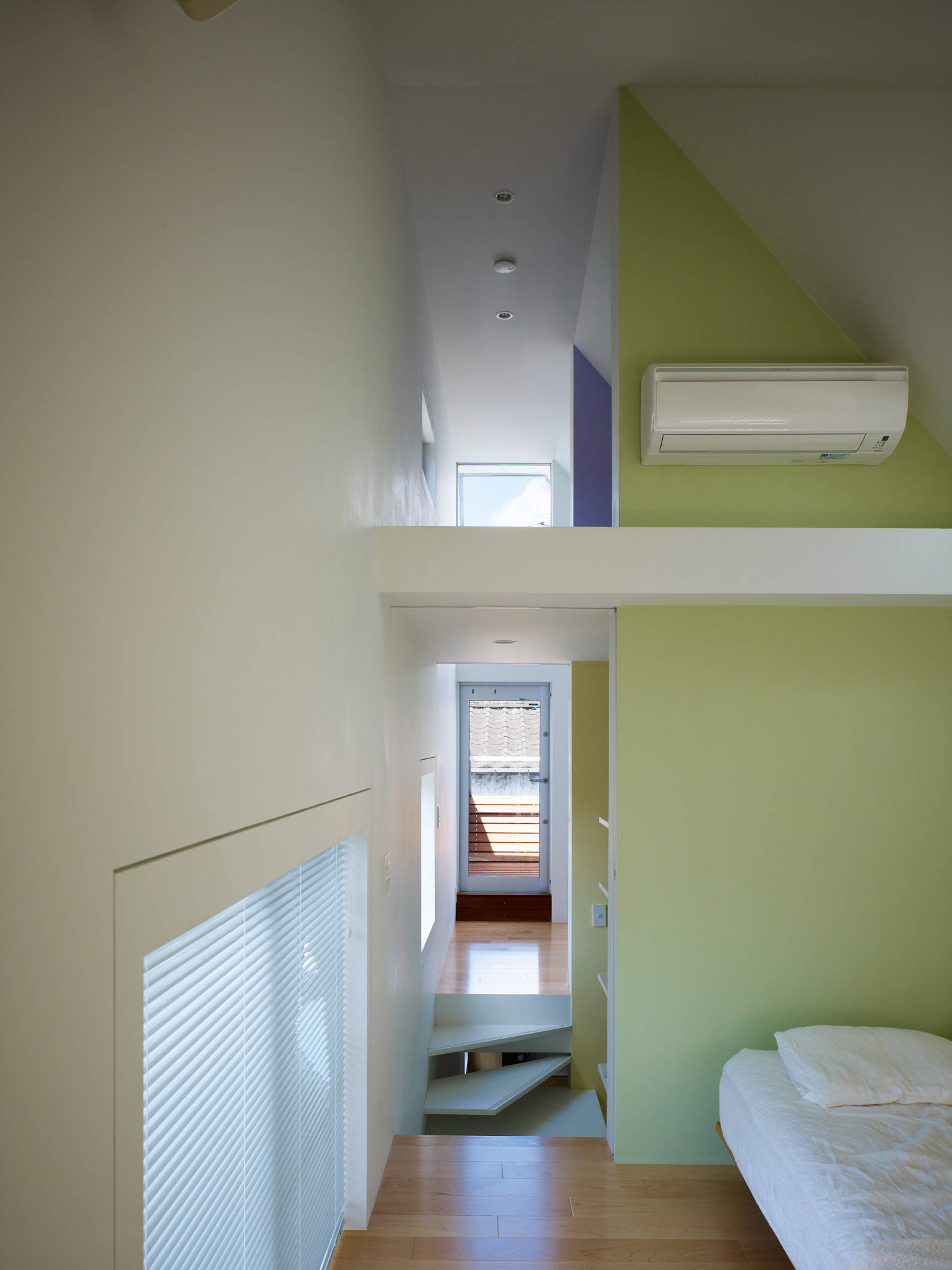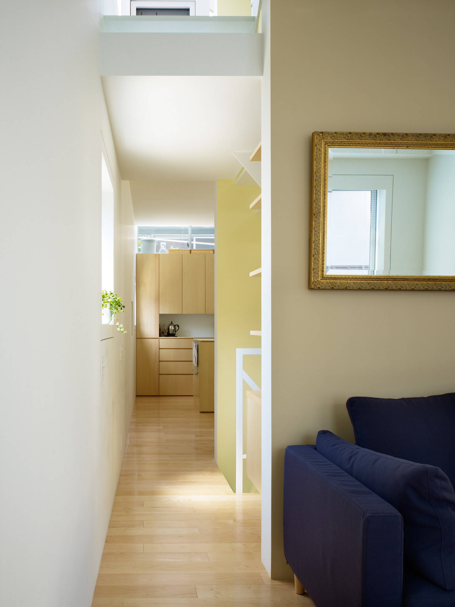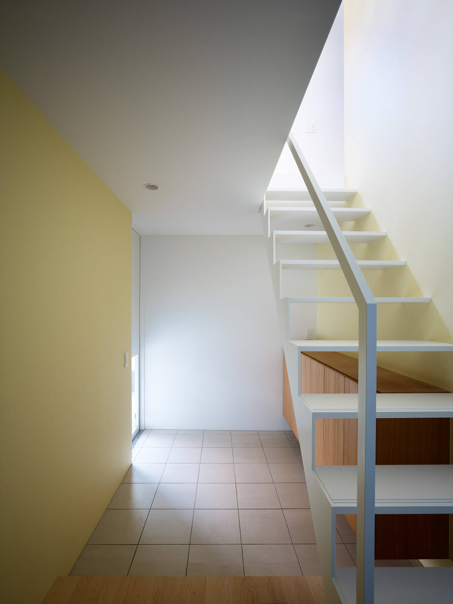 敷地形状は間口が約4.5m、奥行きが12.5mと南北に細長く、隣家と距離を確保しづらい典型的な都心の敷地であり、施主は充分な採光や風通しを確保することを希望された。法規的な建築面積と容積を最大限に確保し、平面の中心に配置した階段を挟んで構造壁を2枚配置することで、各室がゆるやかに分節されながらワンルームのようにつながる家となった。開口部の大きさや位置、高さを工夫することで、一日中自然光が入り、部屋全体を風が抜けていく明るく気持ちのよい家となった。