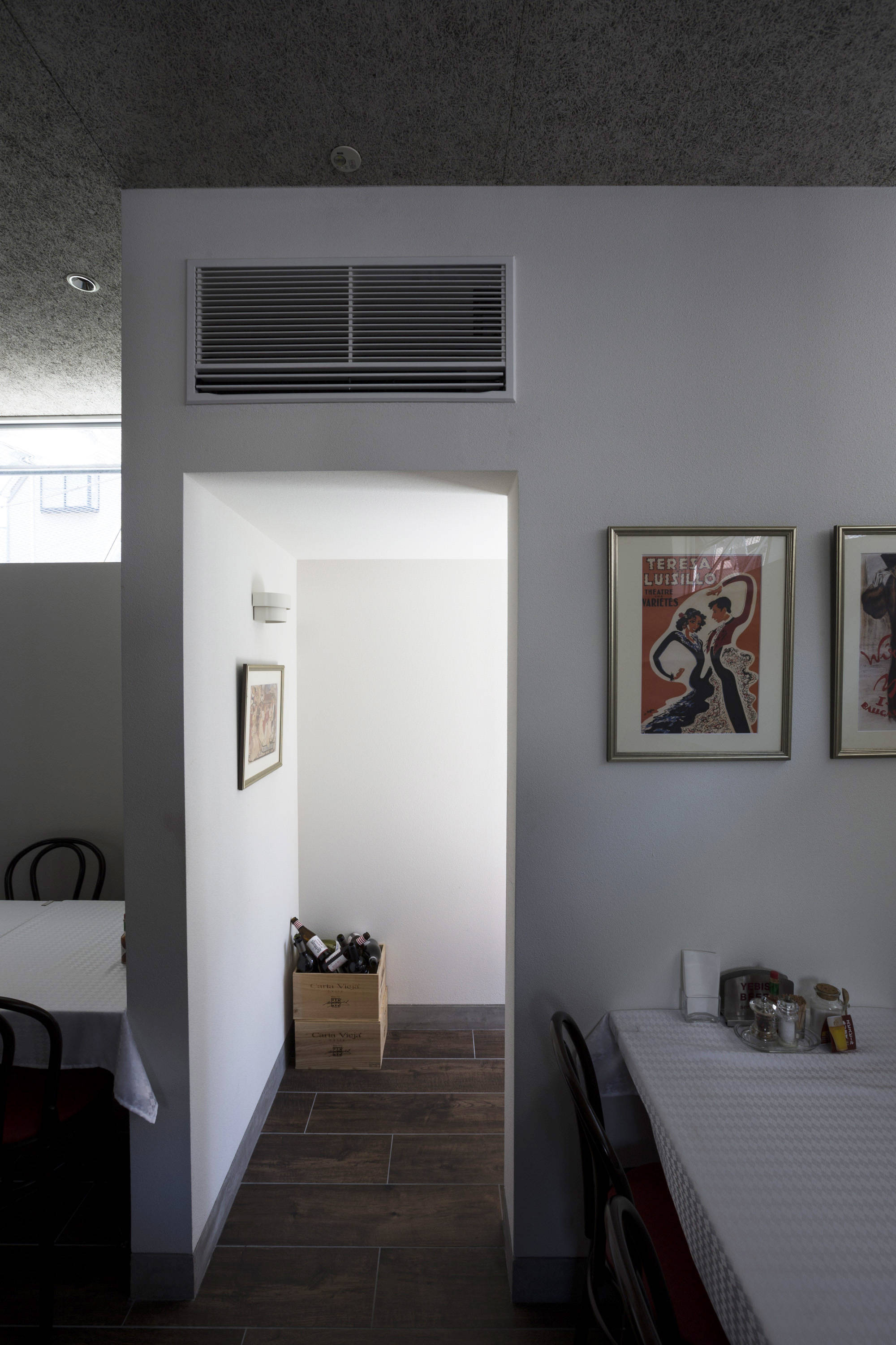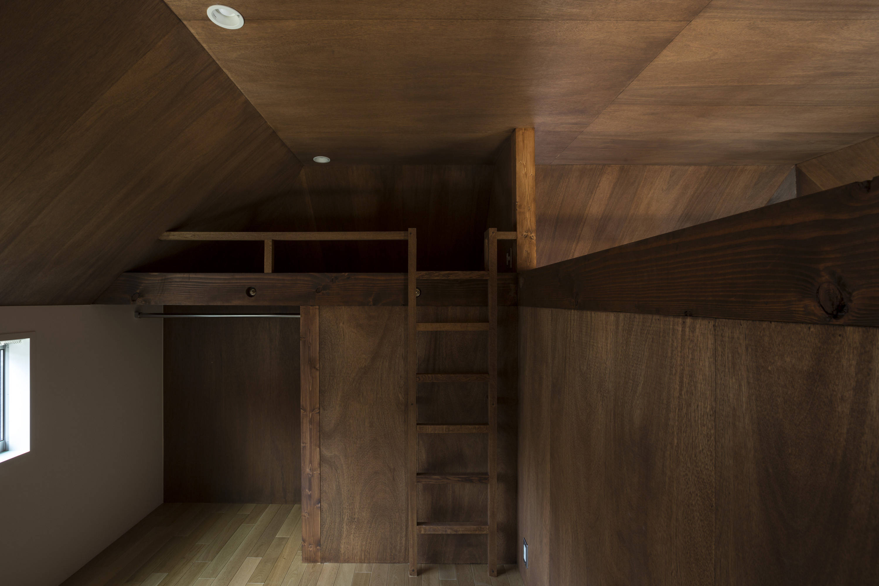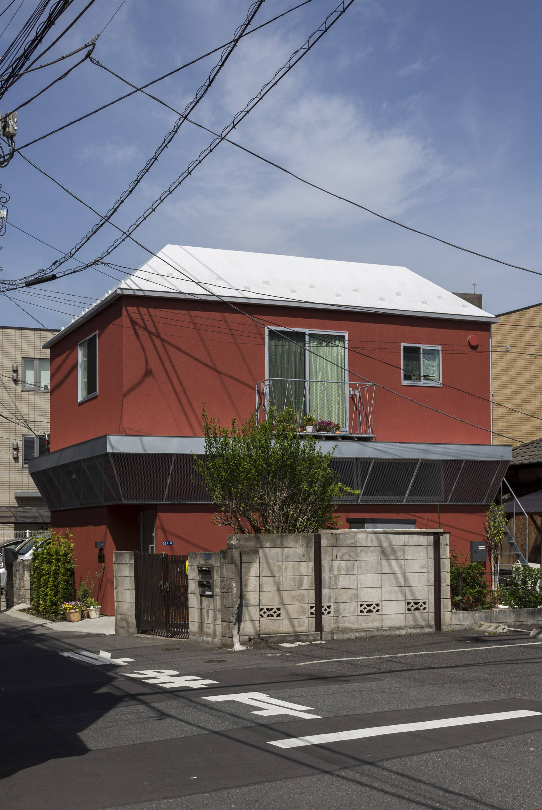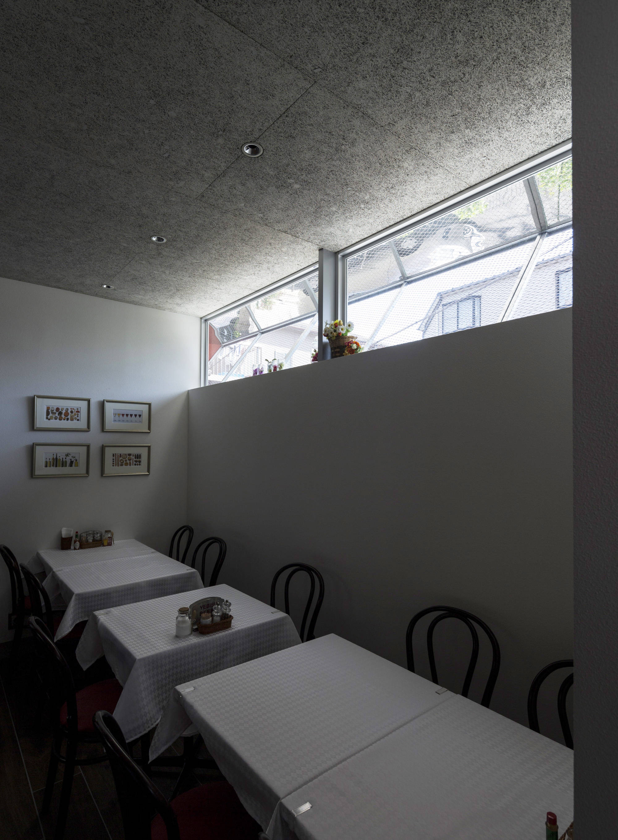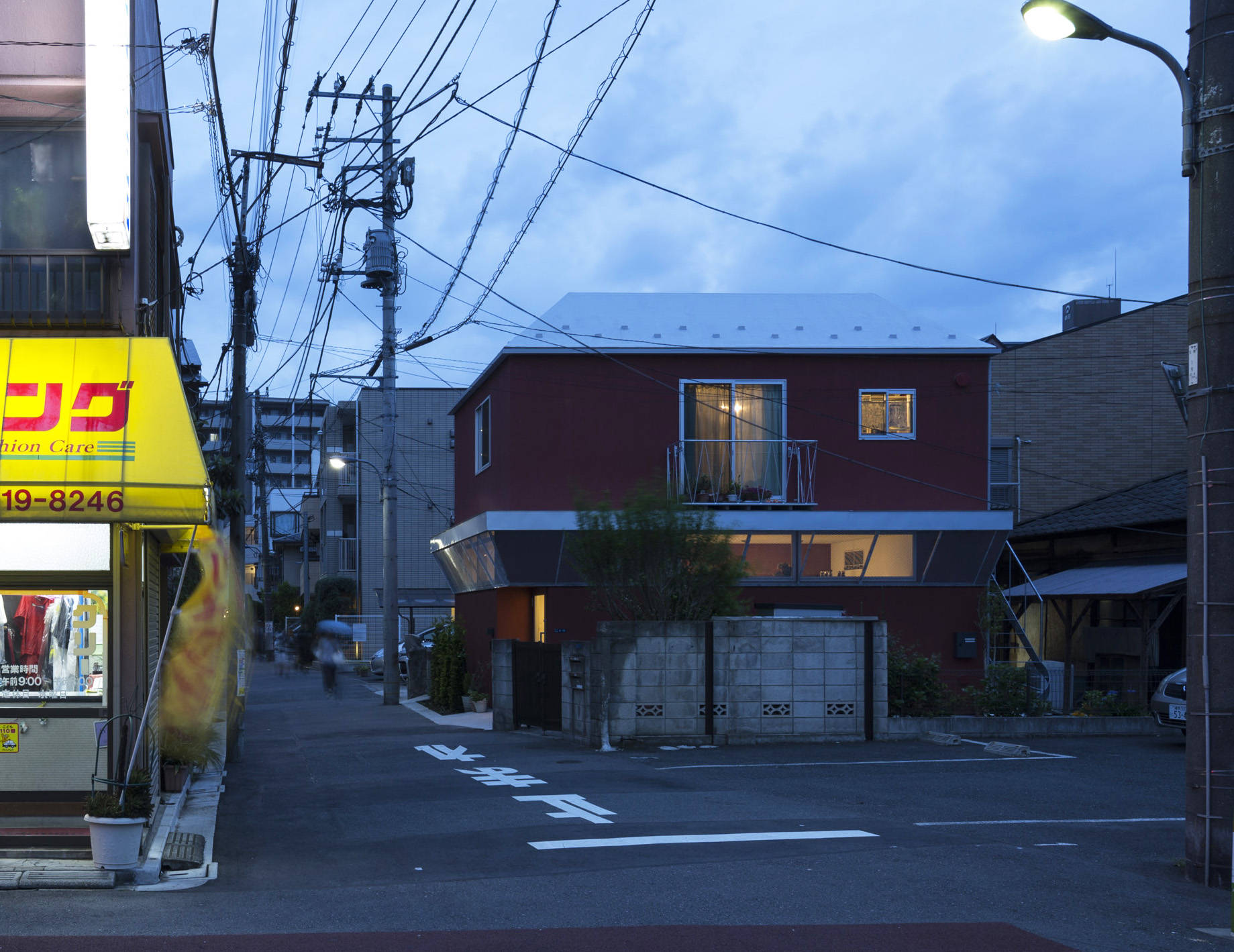 地元でレストランを経営する施主は、店舗の引越しに合わせて新しい店舗の1階を店、2階を弟子家族の住まいとする計画をされた。個人店舗が並ぶ通りに馴染みながら店舗としての存在感を出すため、看板テントの形からヒントを得て、建築の庇と屋根の形態づくりを行った。庇の軒裏を鏡面仕上げとすることで、夜は内部の光が映し出され行灯のような照明効果を出している。外壁の色は植栽好きな施主のために、緑に生えるレンガ色を選んだ。日中と夜で店舗の表情を変えながら、お弟子さんが作る料理が評判の憩いのレストランとなっている。