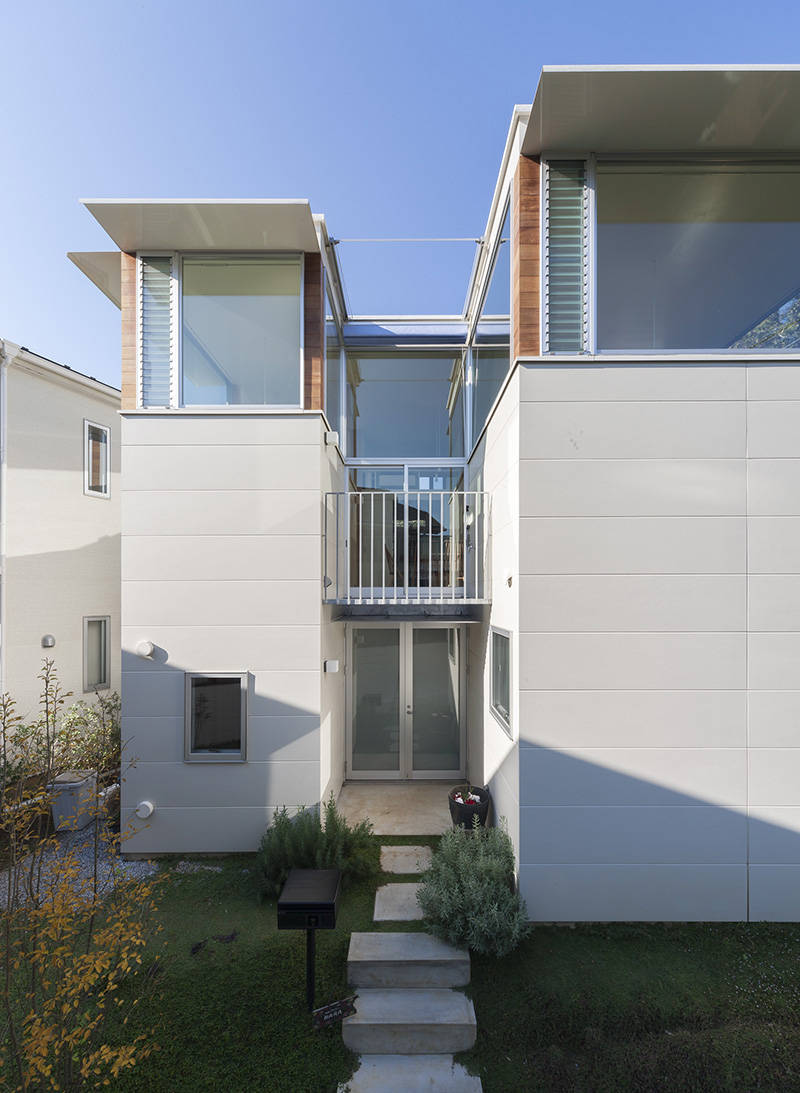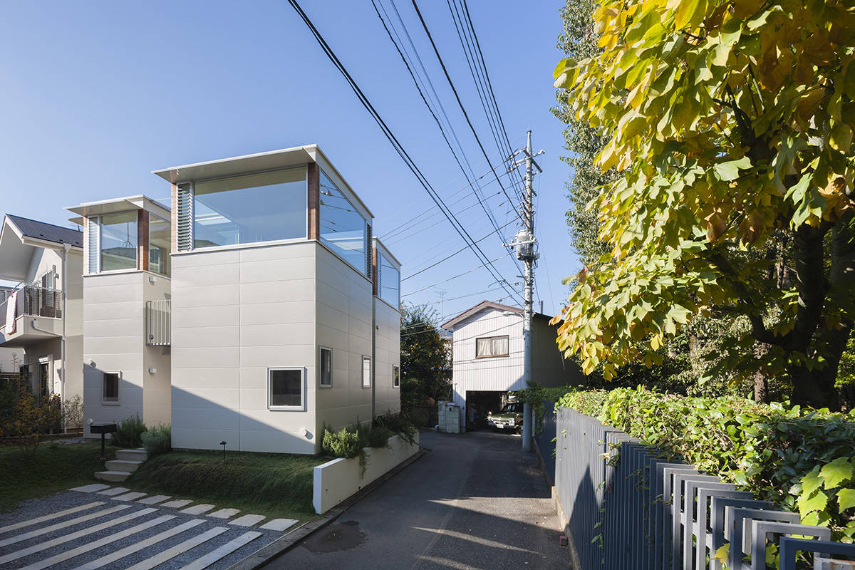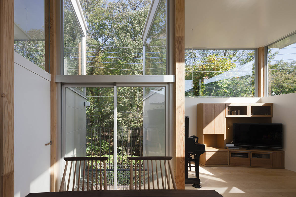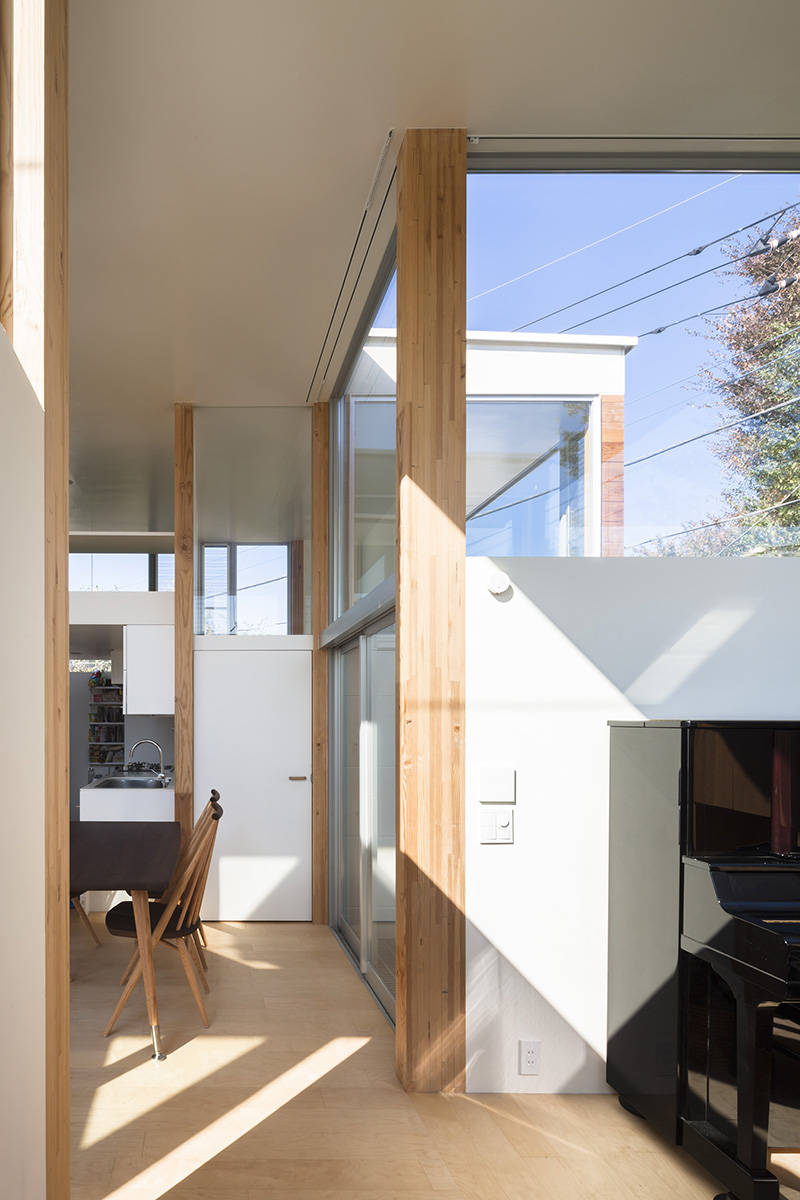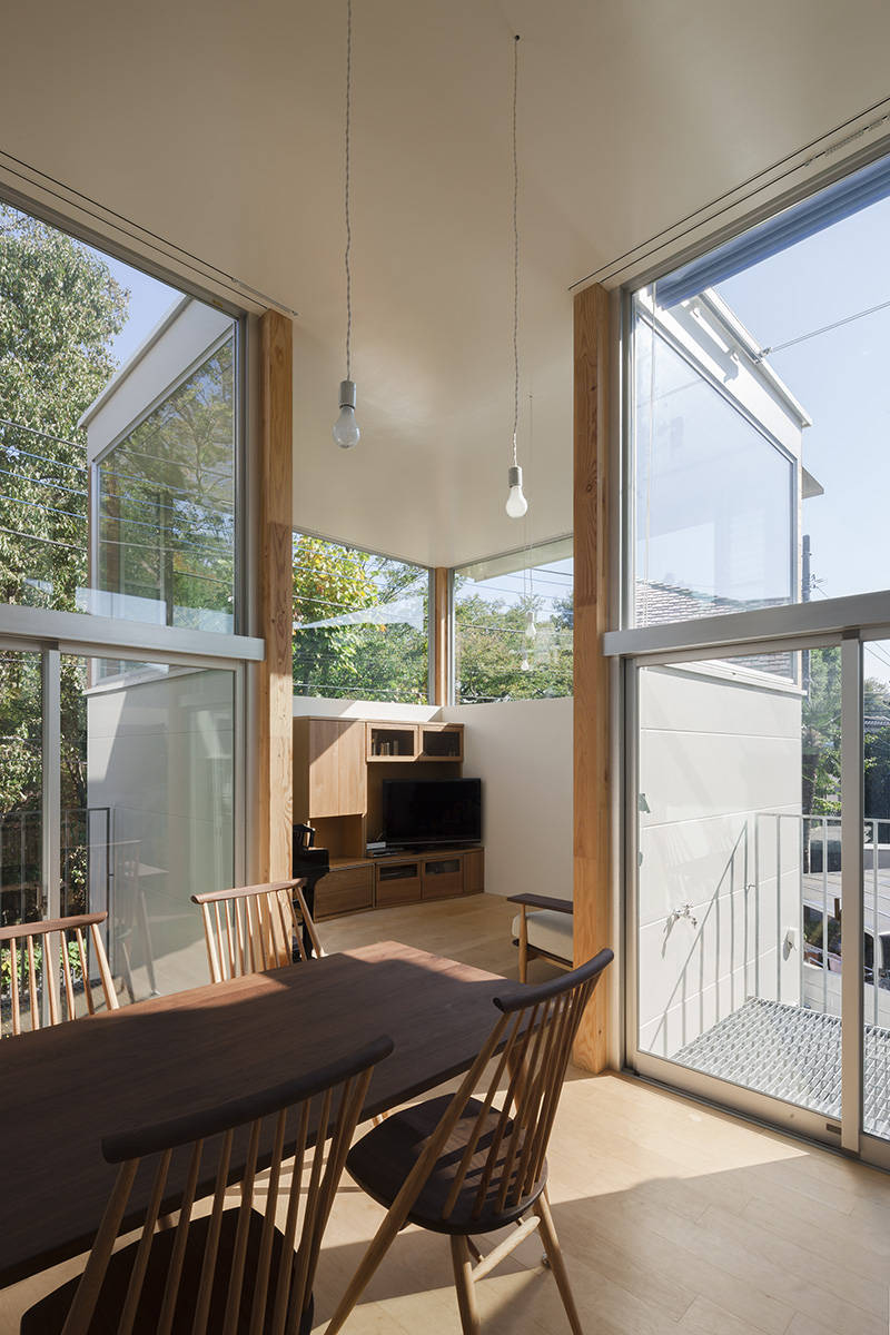 施主ご家族は、共働きのご夫婦とお子さんが二人で、忙しい平日は家事がしやすく、休日は公園の緑を取り込みながら家族でゆったりとくつろげる住宅を希望された。コンパクトでありながらそれぞれのスペースに独立性を持たせるため、花の形を参考にし、中心のつぼみに各部屋が花びらのようにとりつく形とした。家全体がワンルームのような空間では、声は届くが姿は見えないような様々な場所をつくることで、家族それぞれが心地よく感じる距離感や居場所ができるように心がけている。