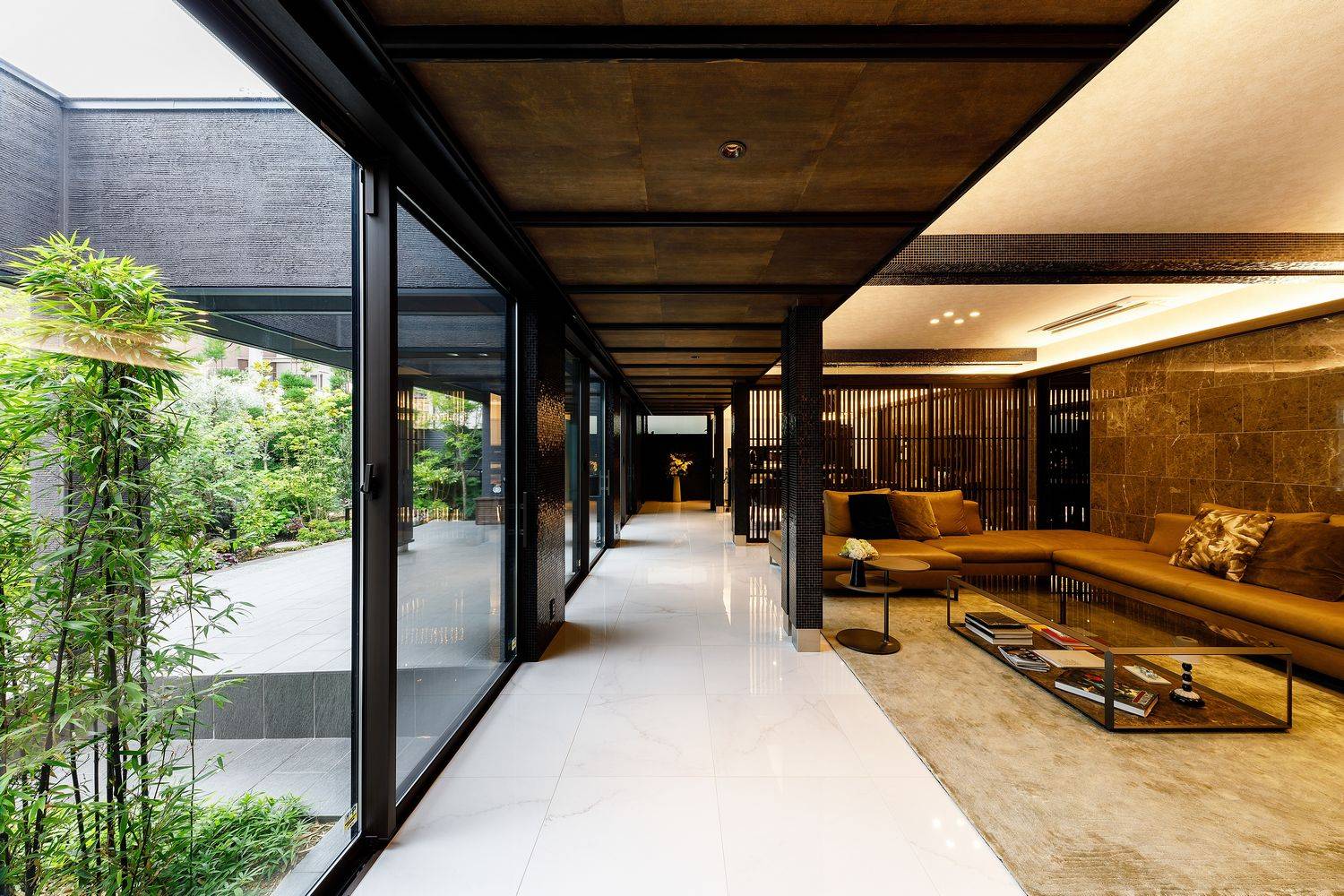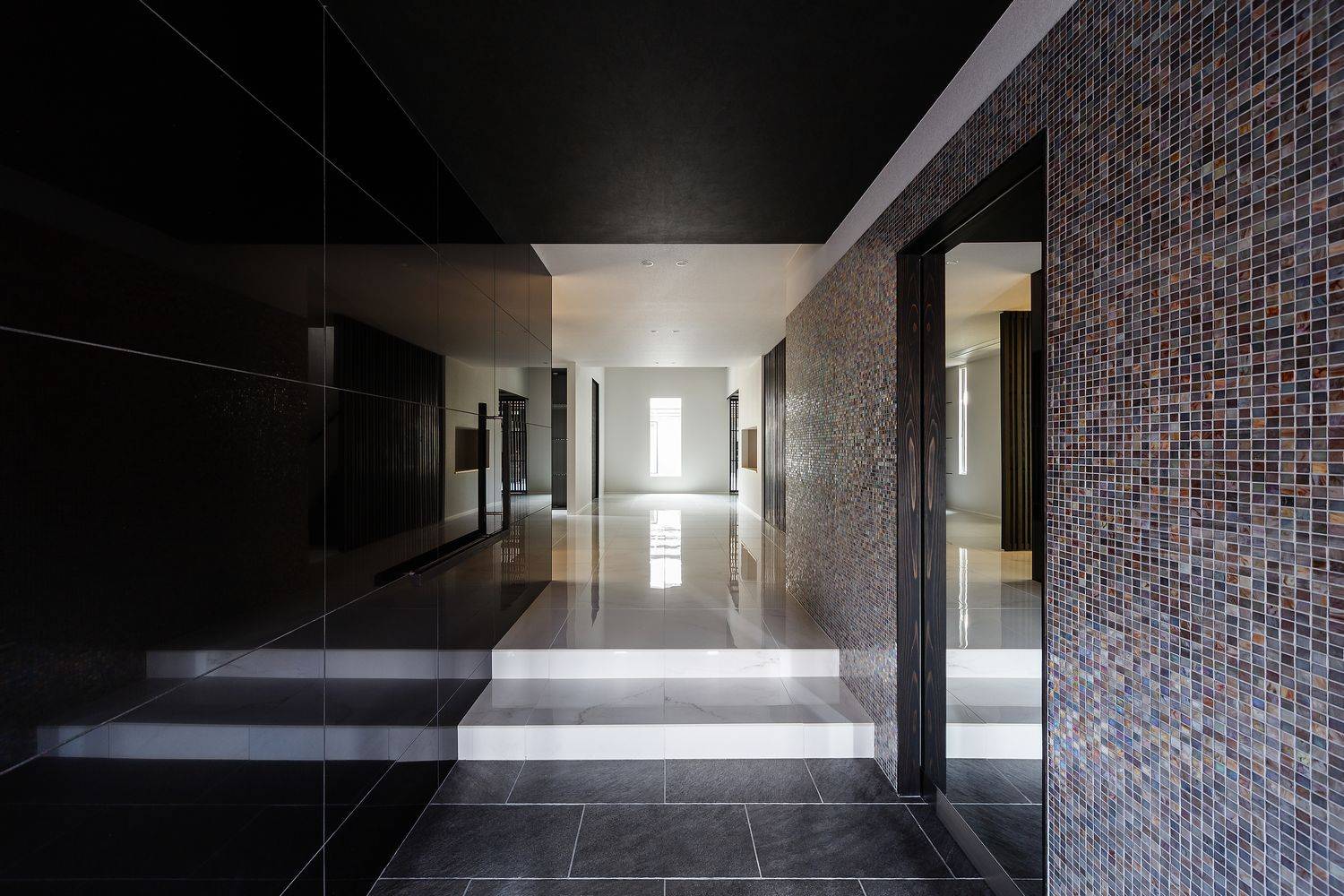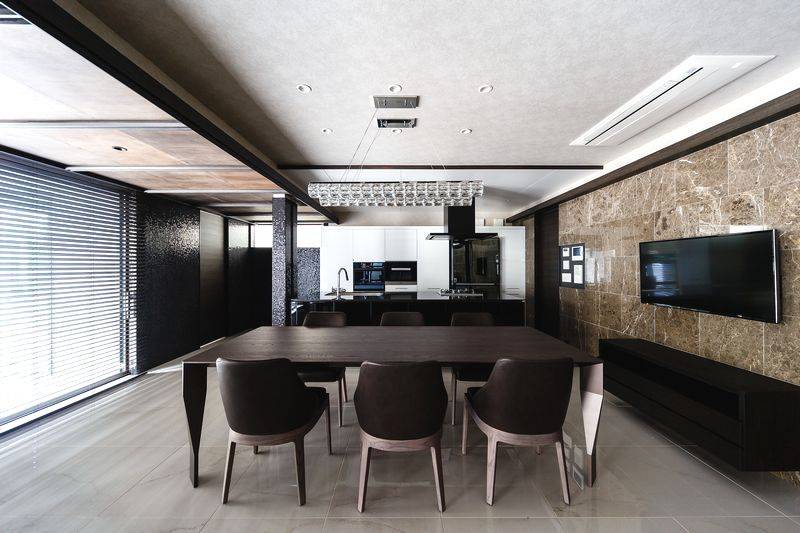 1025㎡の敷地に建つ延床面積482㎡の住宅、木造では過去最大規模の邸宅です。大きさに見合う高級感を演出するため高級ホテルをイメージしながら耐久性の高い素材、セラミックタイル、漆和紙、柿渋和紙、ガラスモザイクタイル等々の素材とライティングには留意しながら、更に高級感を高めるように演出しました。