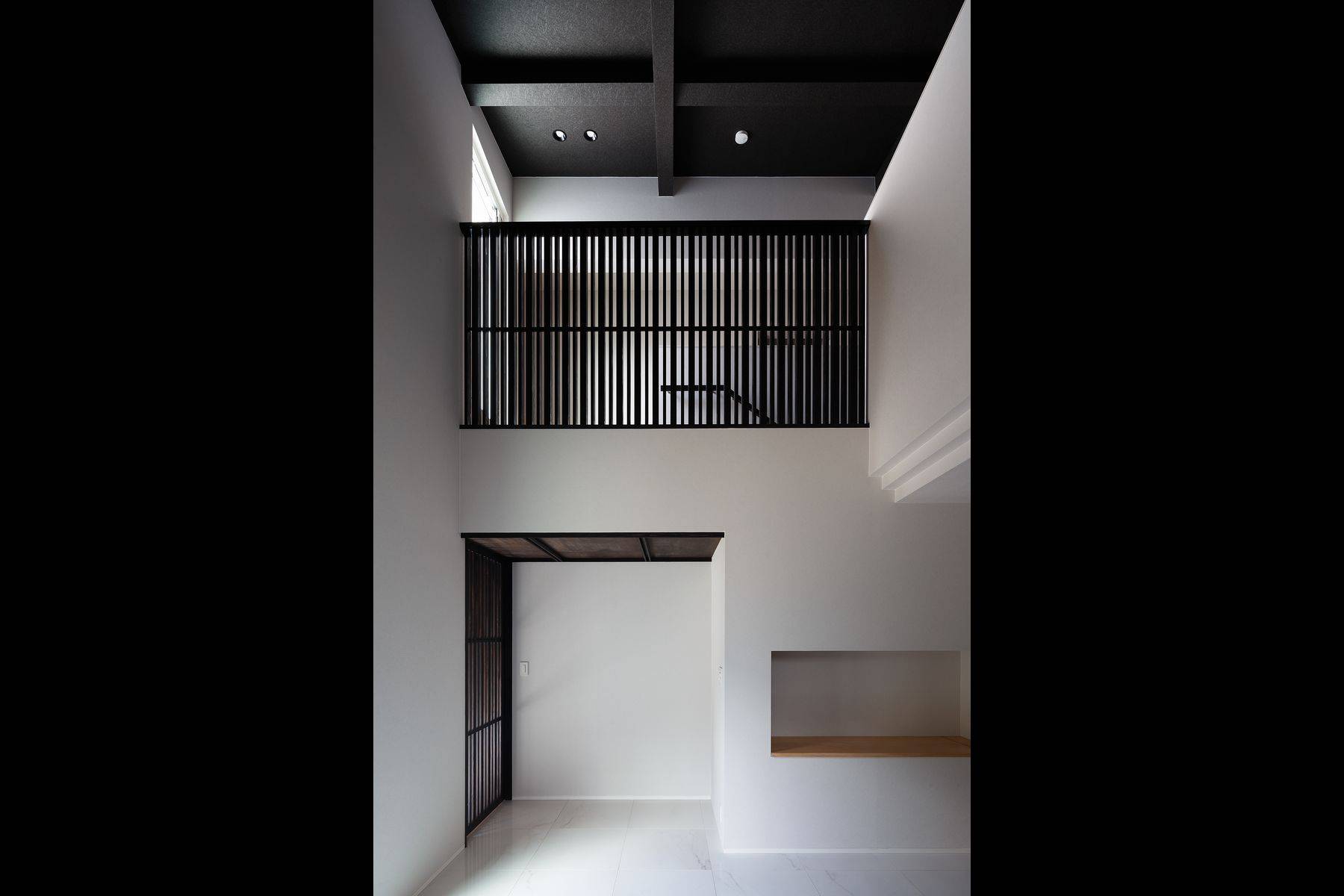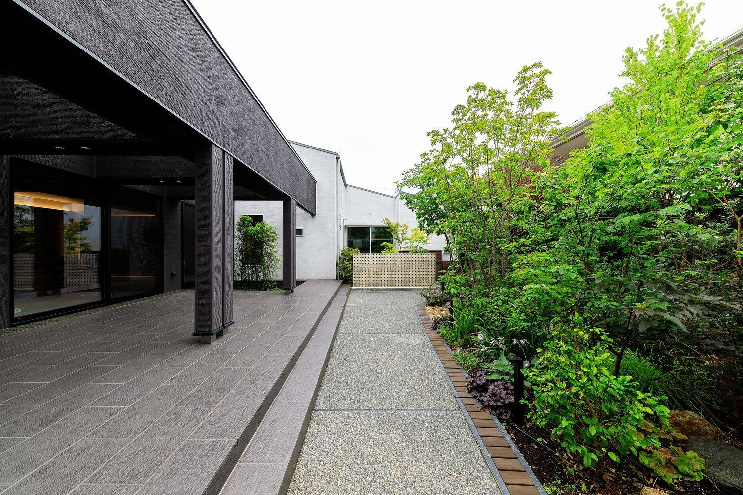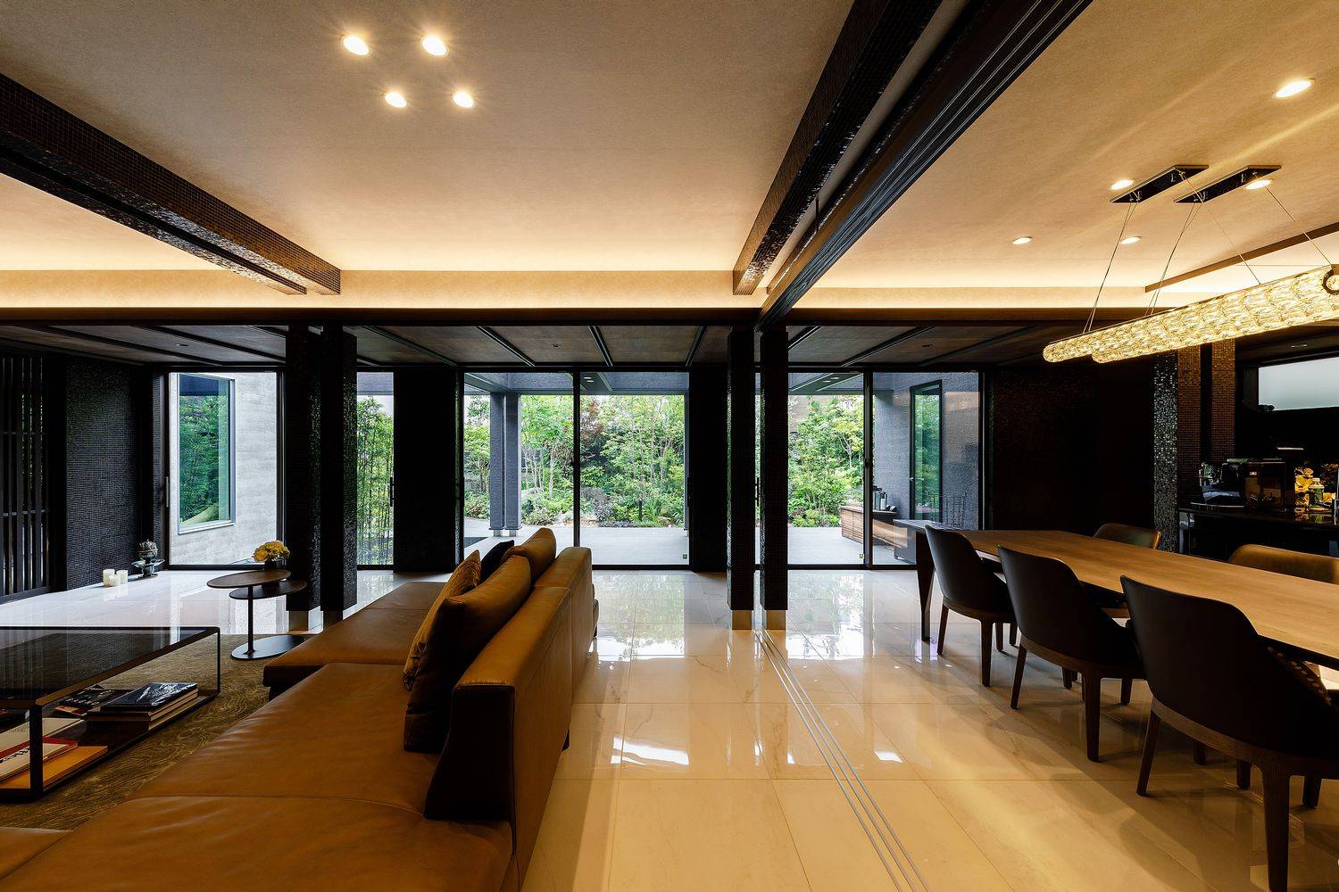 1025㎡の敷地に建つ延床面積482㎡の住宅、木造では過去最大規模の邸宅です。大きさに見合う高級感を演出するため高級ホテルをイメージしながら耐久性の高い素材、セラミックタイル、漆和紙、柿渋和紙、ガラスモザイクタイル等々の素材とライティングには留意しながら、更に高級感を高めるように演出しました。