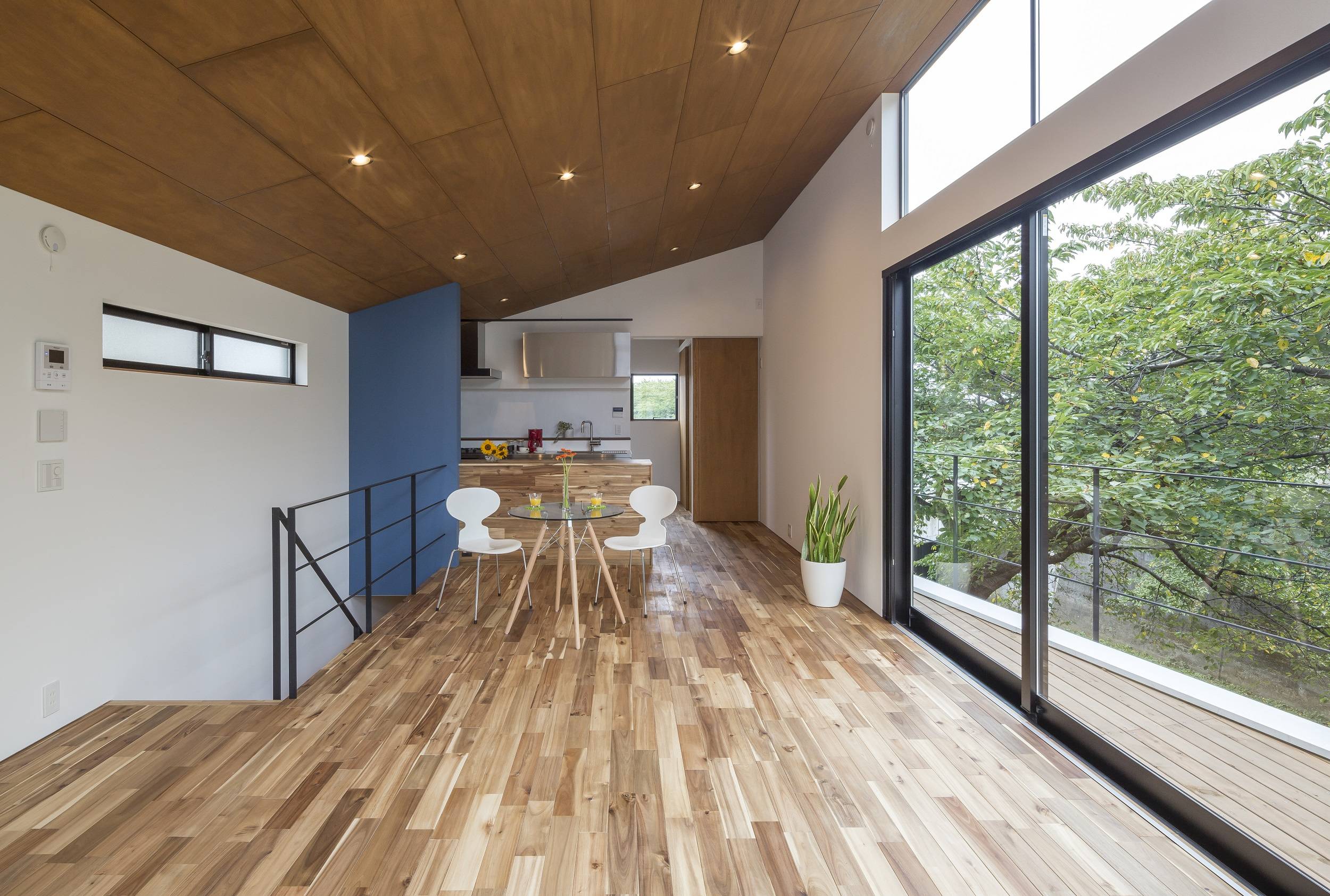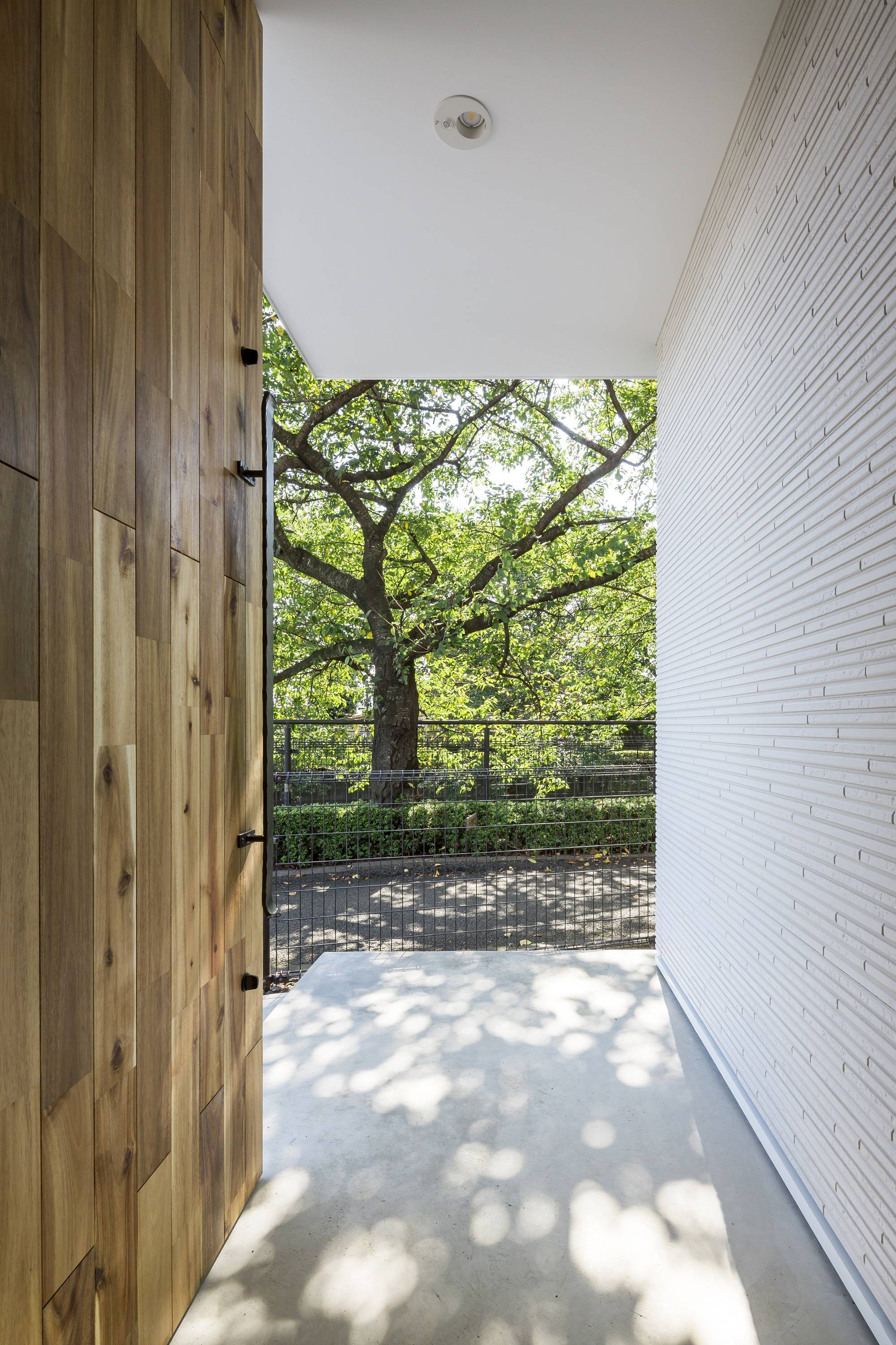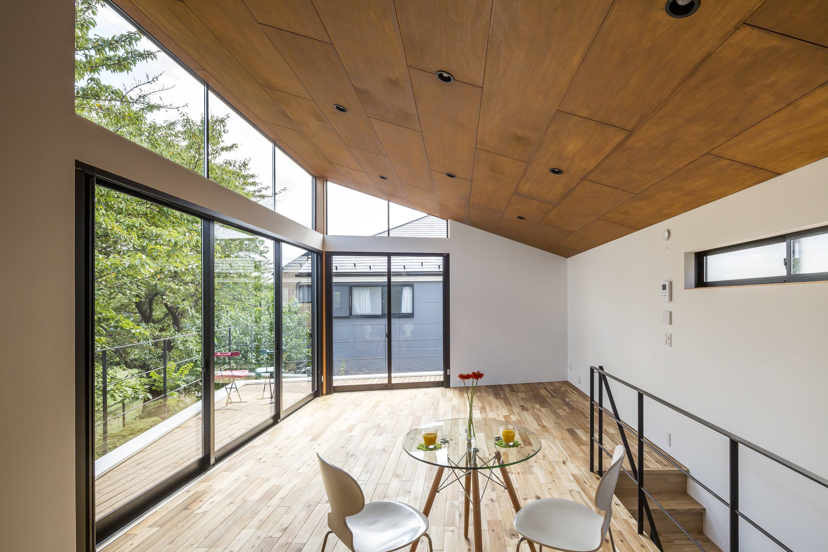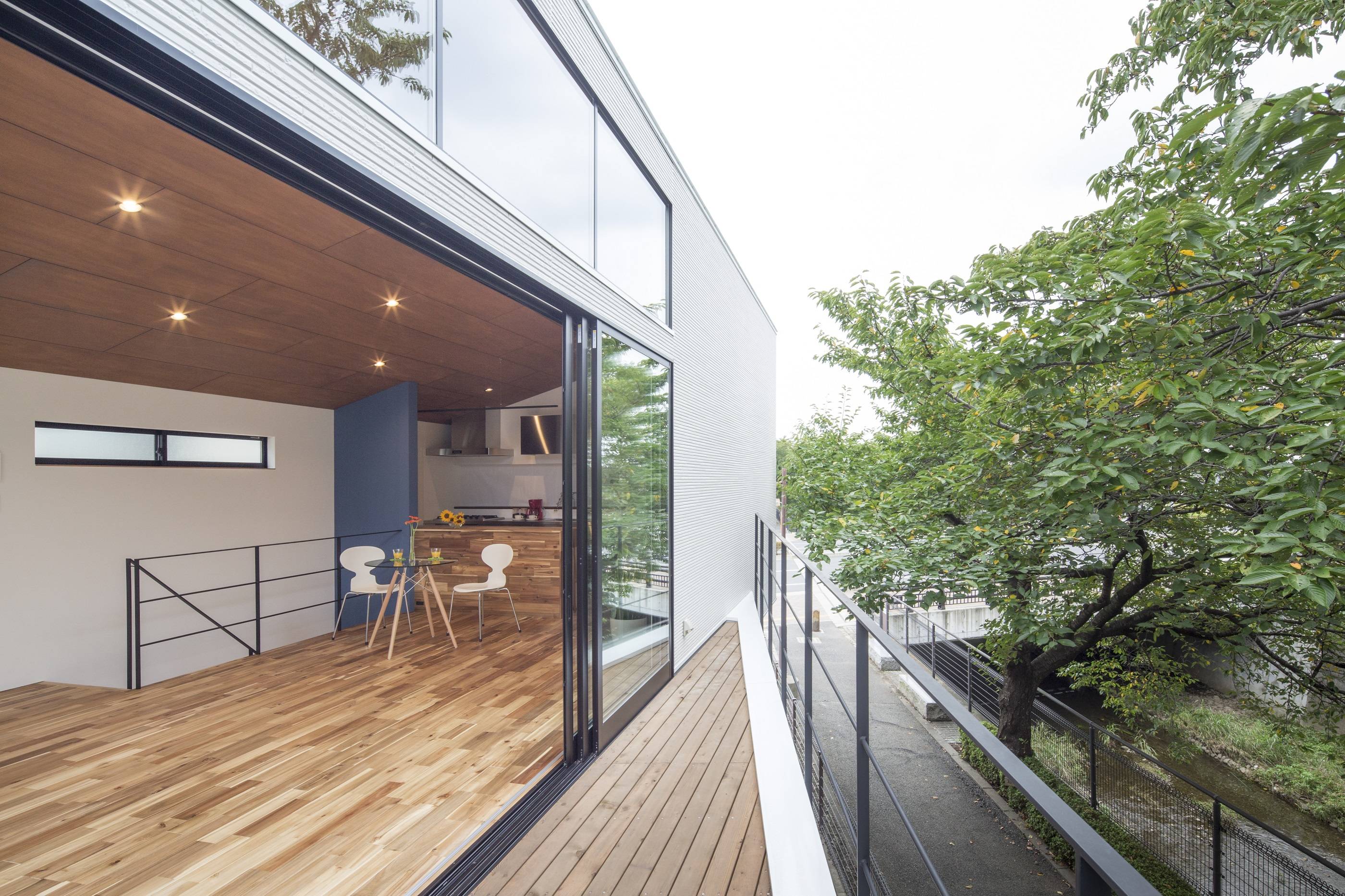 家でお花見ができる、四季の移ろいを日々感じることができる、など、桜の木から受ける良い影響を最大限に活かすことを考えて設計を進めました。建物は南東に大開口を設けることにより、桜並木に向かって開きつつもお日様の光をたくさん取り入れられるようになっています。また、北側に設けた正方形の開口部は通風に役立つだけではなく、遠くに続く桜並木を部屋の中に取り入れ、視線の流れもつくり出しています。玄関ドアを開ければそこも桜並木。都会での仕事を終え疲れて帰って来た時も桜の木に癒されることでしょう。