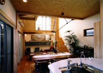 キッチンからLD 大きな吹抜けで中2階の第2に居間とつながります。左側にタタミの間
