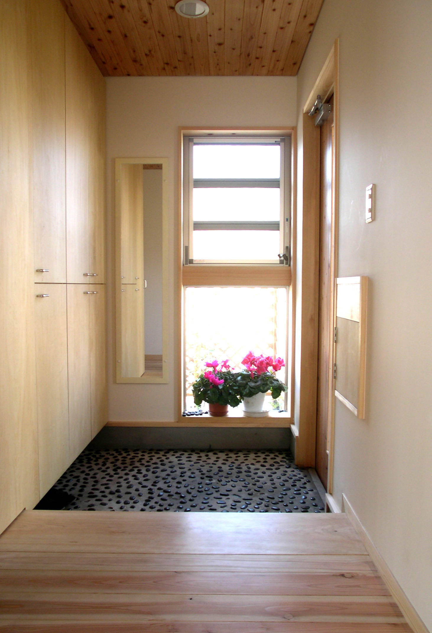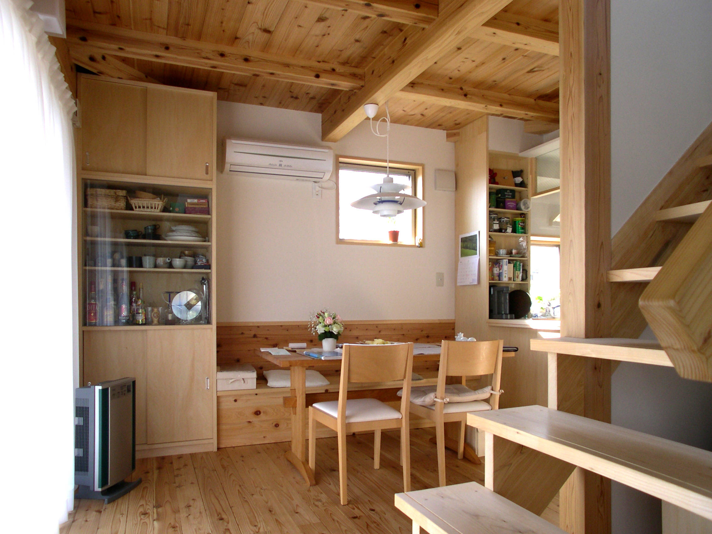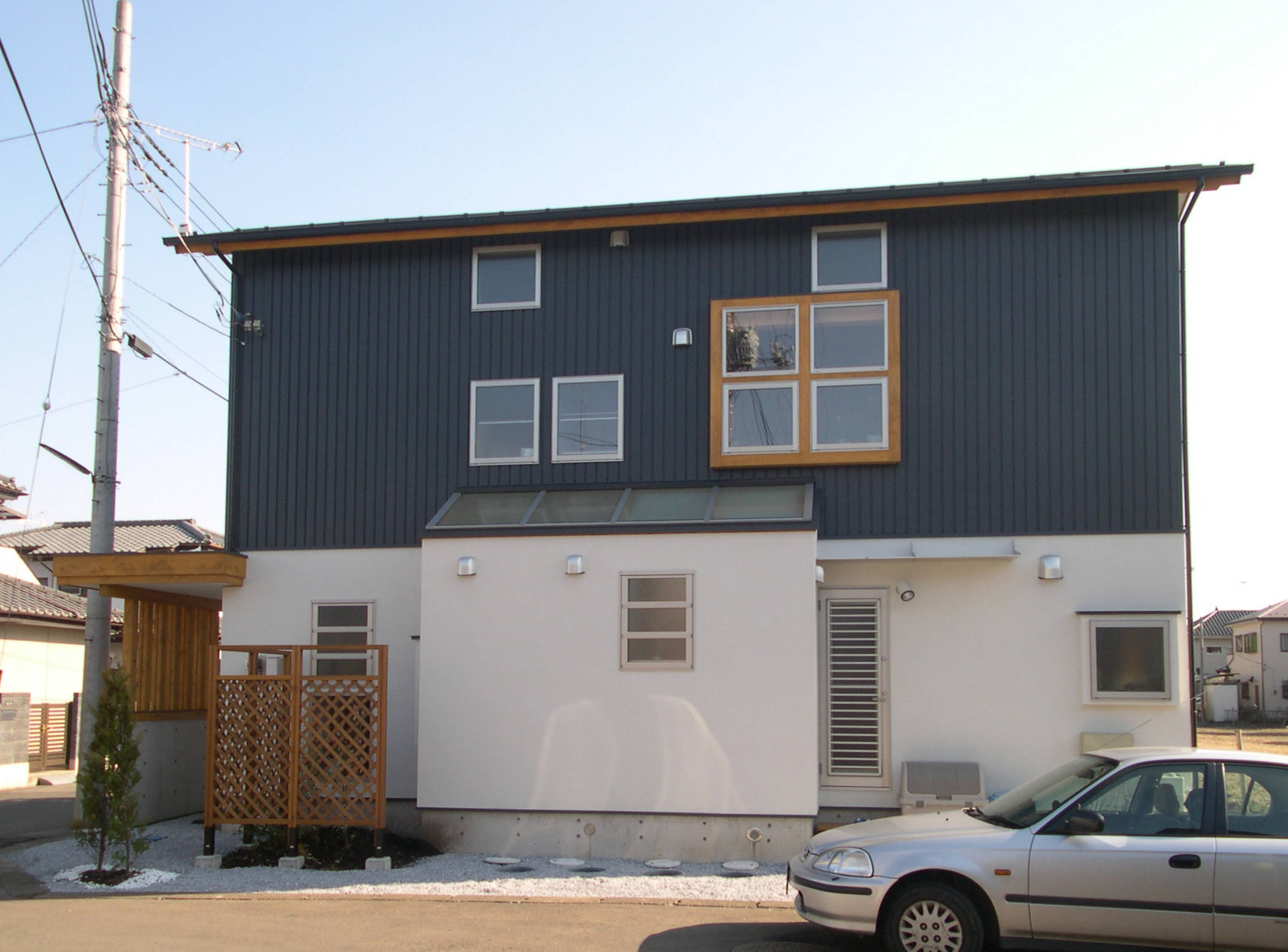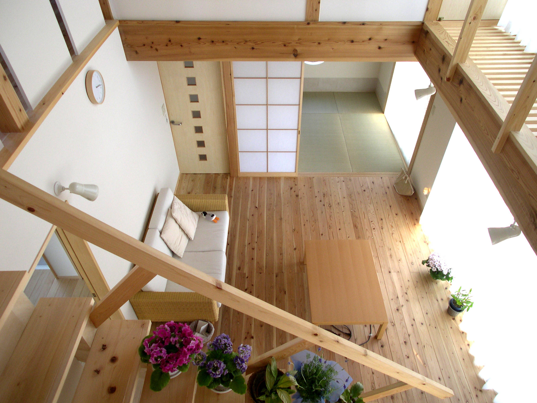 栃木県壬生町にある若夫婦の住まいです。 構造は柱や梁等の軸組をそのまま室内に表しとした在来軸組工法を採用し和モダンの雰囲気を持った2階建ての住宅です。 規模的には30坪(約100㎡)と小住宅の部類に入るかと思いますが、居間とその上部にある大きな吹抜空間を中心に開放感ある空間構成となっています。