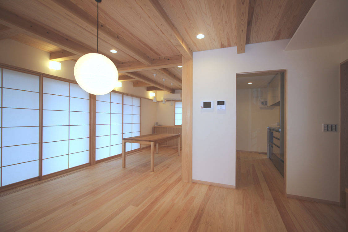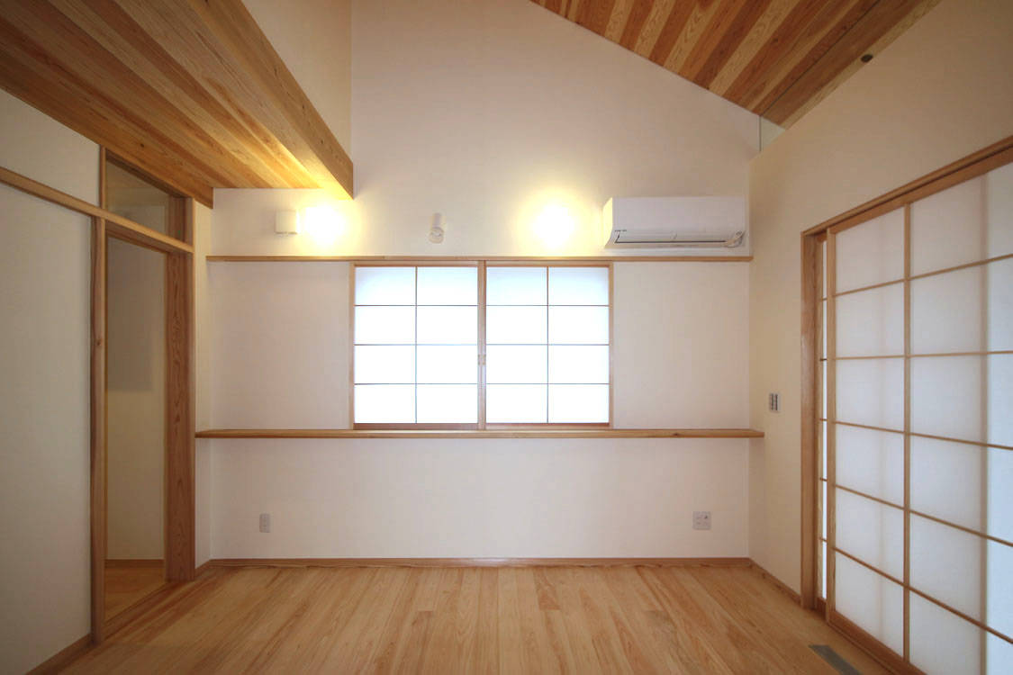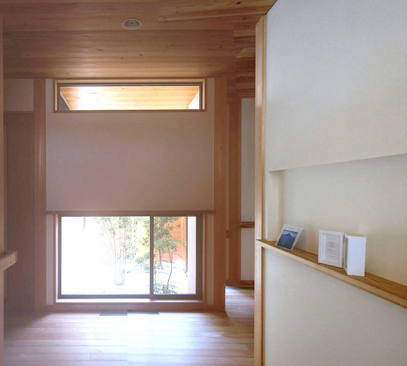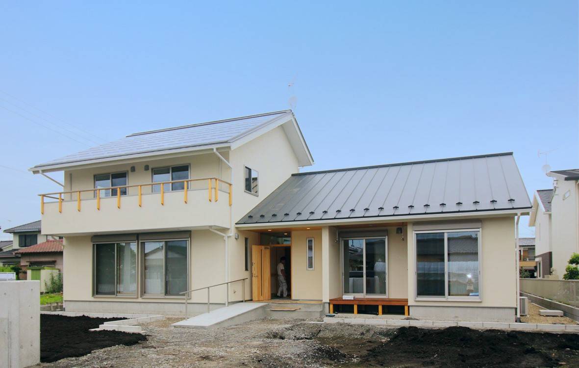 丸林の家は栃木県野木町にあり、ご夫婦と成人のお子さんお二人の4人家族のお住まいです。中央に位置するゆったりとした玄関を中心に西側に2階建てのリビングダイニング(LD)などの生活空間や子供室、東側に静かな平家建てのご夫婦の寝室と明確に分けられている事が特徴のお宅です。太陽光発電、「そよ風」「そよ換気」のソーラーシステムを組み込んだ長期優良住宅となっています。