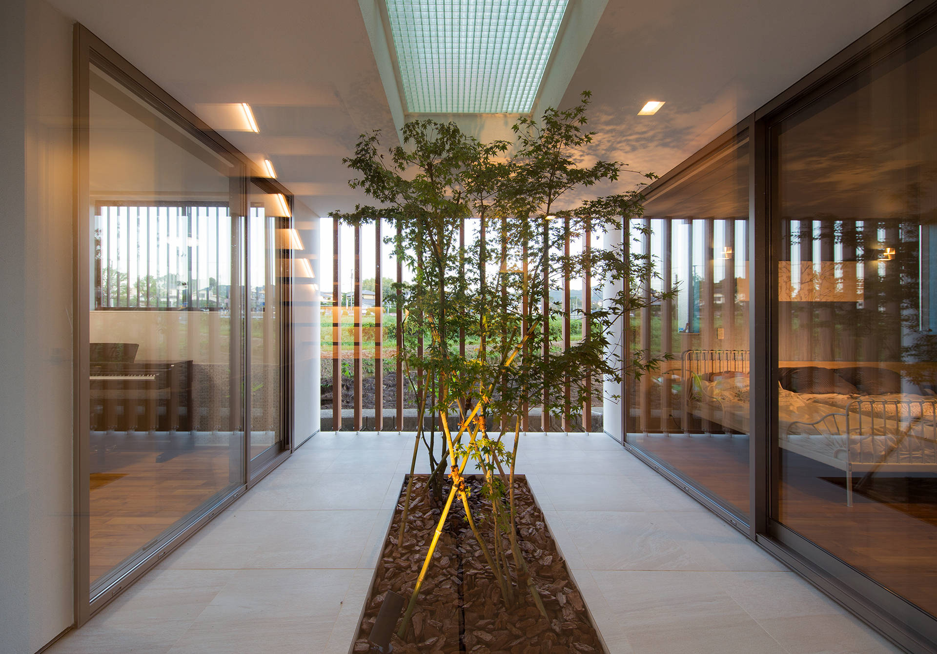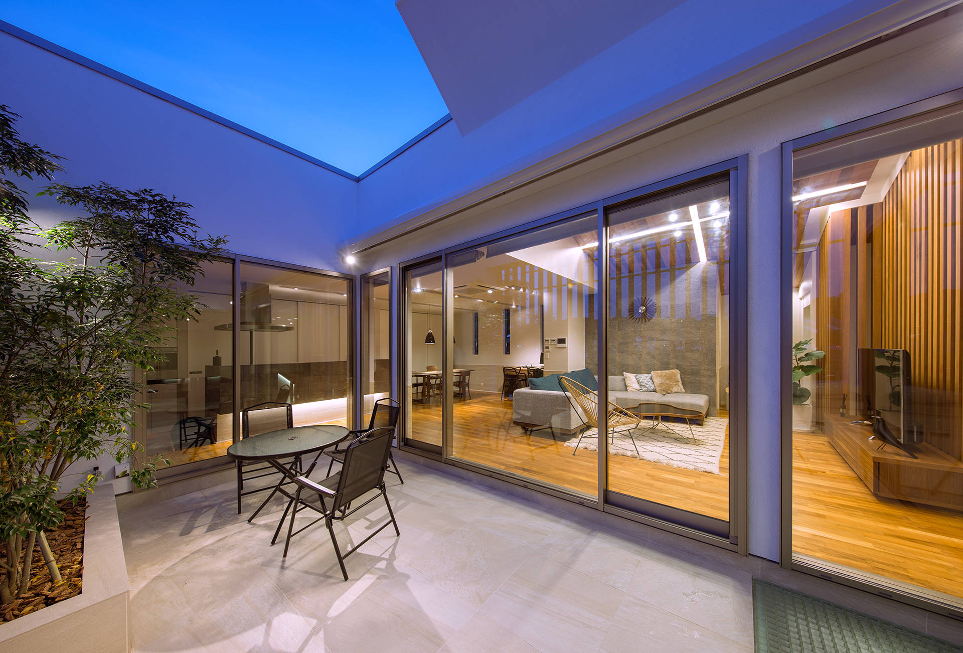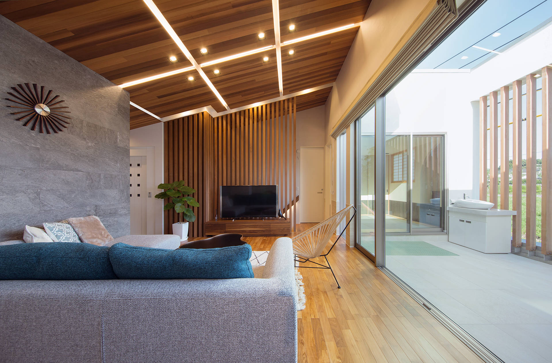 リビング・ダイニング・ゲストルームと繋がるテラスバルコニーのレッドシダーの縦型シェードは、各部屋のプライバシーを守り防犯性を高めながら空間に開放感を与え、各部屋に木漏れ日のような光を注いでくれます。
