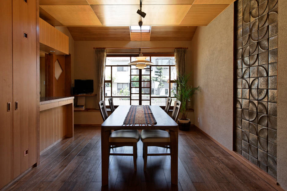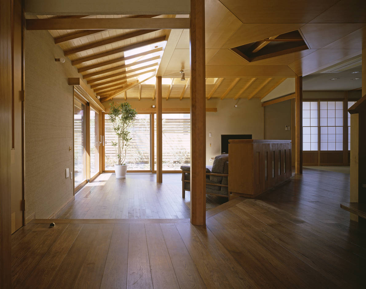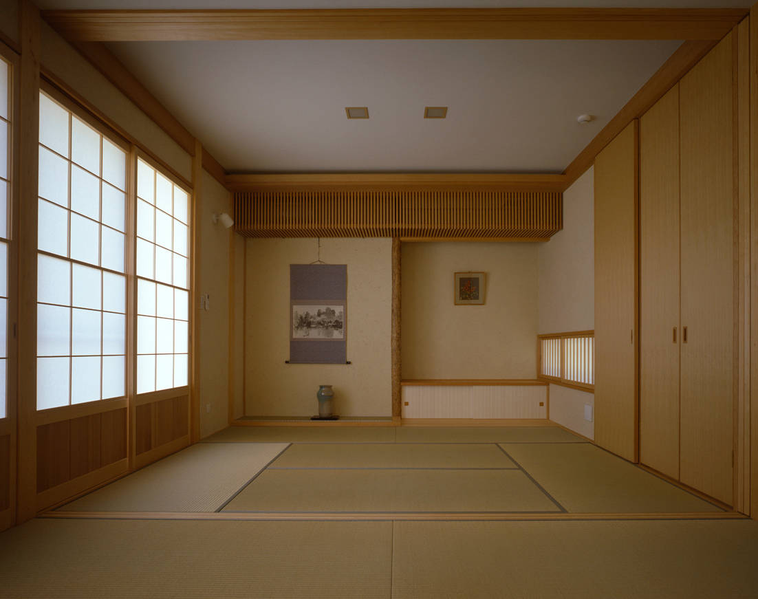 10帖の和室は、通常は6帖と4帖とに、引き込み襖で仕切られ、日常その4帖はリビング空間に取り込まれる計画となっている。