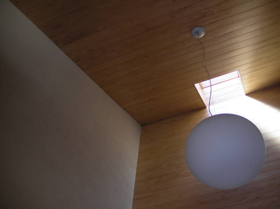 6帖の玄関ホールは、ポーチからせりあがってくる下屋をそのまま延長したため、2層分の吹き抜けとなっている。