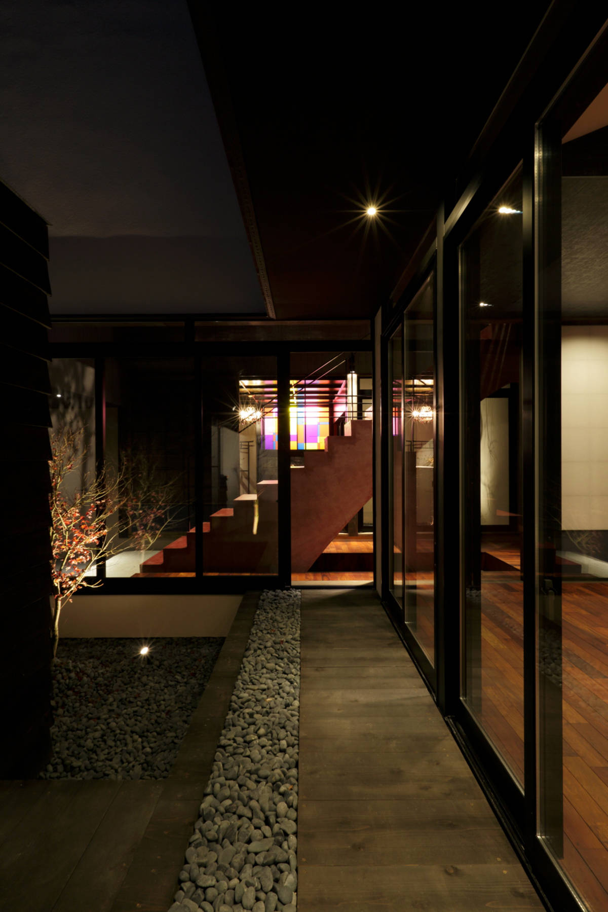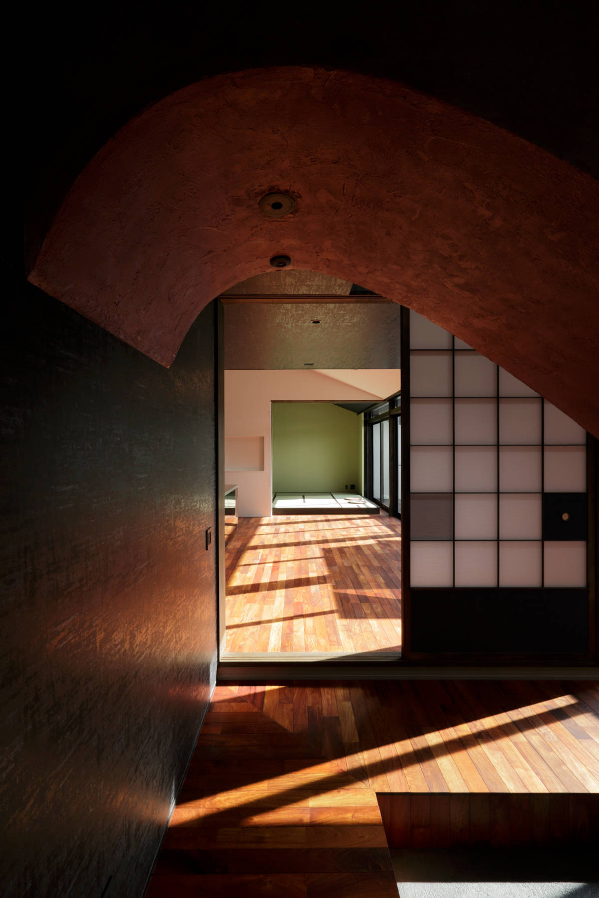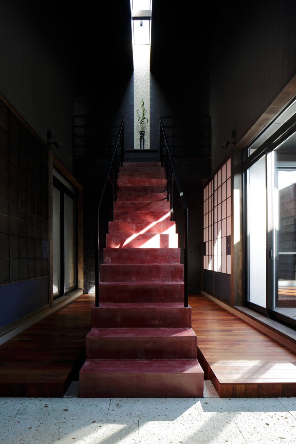 父娘が同居する住宅の計画。インテリアの要素を強く求められた住宅です。 玄関を入ってすぐに伸びやかで大きな吹抜けを設け、父娘の生活に適度な距離を持たせるバッファーゾーンとして機能させると同時に、スリット状の光を落とすことにより、舞台のような印象的な空間としてゲストと家人を迎える空間としました。 吹抜け向かって右側の平屋がお父さんの居住エリアであり、和モダンの空間としています。中庭の向かいには宙に浮く2畳の書斎を設け、ドーム天井とし光の不思議な空間としています。 吹抜け向かって左側の2階建て部分が娘の居住エリアであり、1階にはゲストと語らう中庭を擁した和室を配し、カラフルな行燈と黒い畳、赤い壁の色使いとして、襖絵もオリジナルで描いてもらったものです。2階の寝室は、ヨーロッパのデザインホテルのようなテイストとし、アート好きなクライアントが満足する空間として仕上げています。