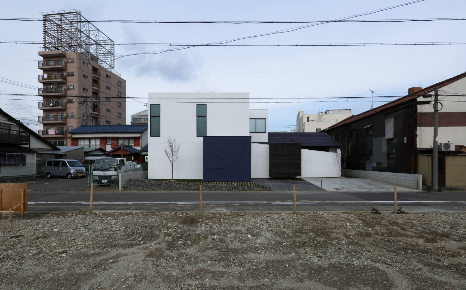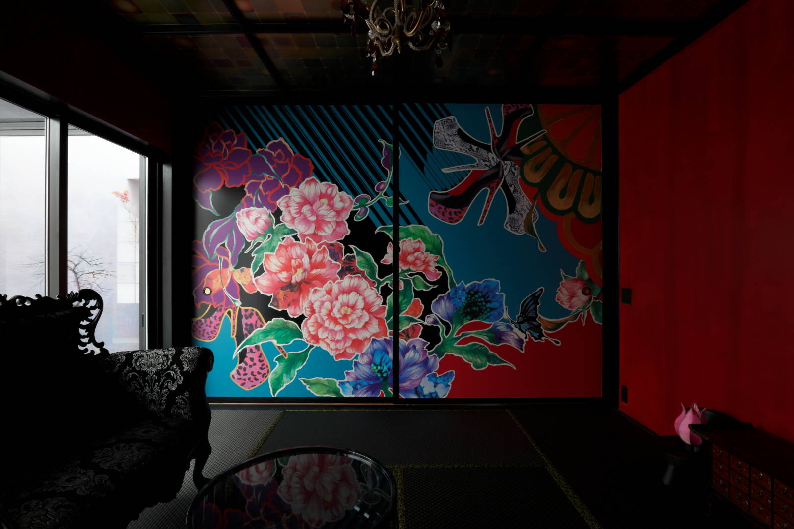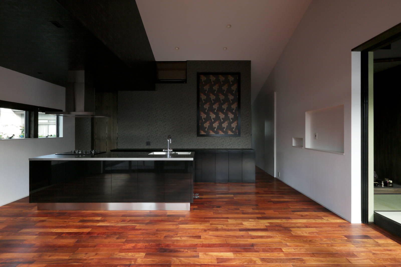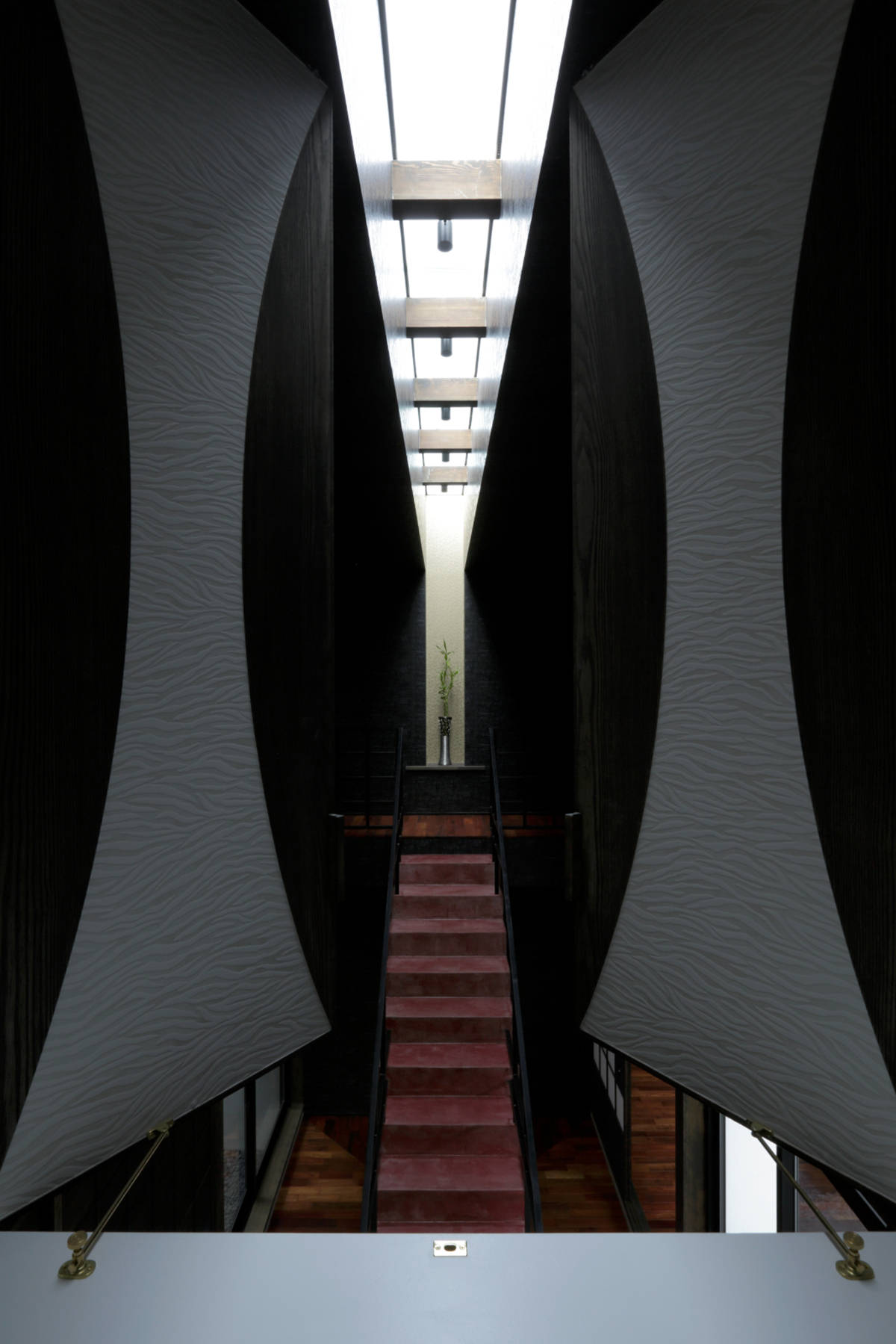 父娘が同居する住宅の計画。インテリアの要素を強く求められた住宅です。 玄関を入ってすぐに伸びやかで大きな吹抜けを設け、父娘の生活に適度な距離を持たせるバッファーゾーンとして機能させると同時に、スリット状の光を落とすことにより、舞台のような印象的な空間としてゲストと家人を迎える空間としました。 吹抜け向かって右側の平屋がお父さんの居住エリアであり、和モダンの空間としています。中庭の向かいには宙に浮く2畳の書斎を設け、ドーム天井とし光の不思議な空間としています。 吹抜け向かって左側の2階建て部分が娘の居住エリアであり、1階にはゲストと語らう中庭を擁した和室を配し、カラフルな行燈と黒い畳、赤い壁の色使いとして、襖絵もオリジナルで描いてもらったものです。2階の寝室は、ヨーロッパのデザインホテルのようなテイストとし、アート好きなクライアントが満足する空間として仕上げています。