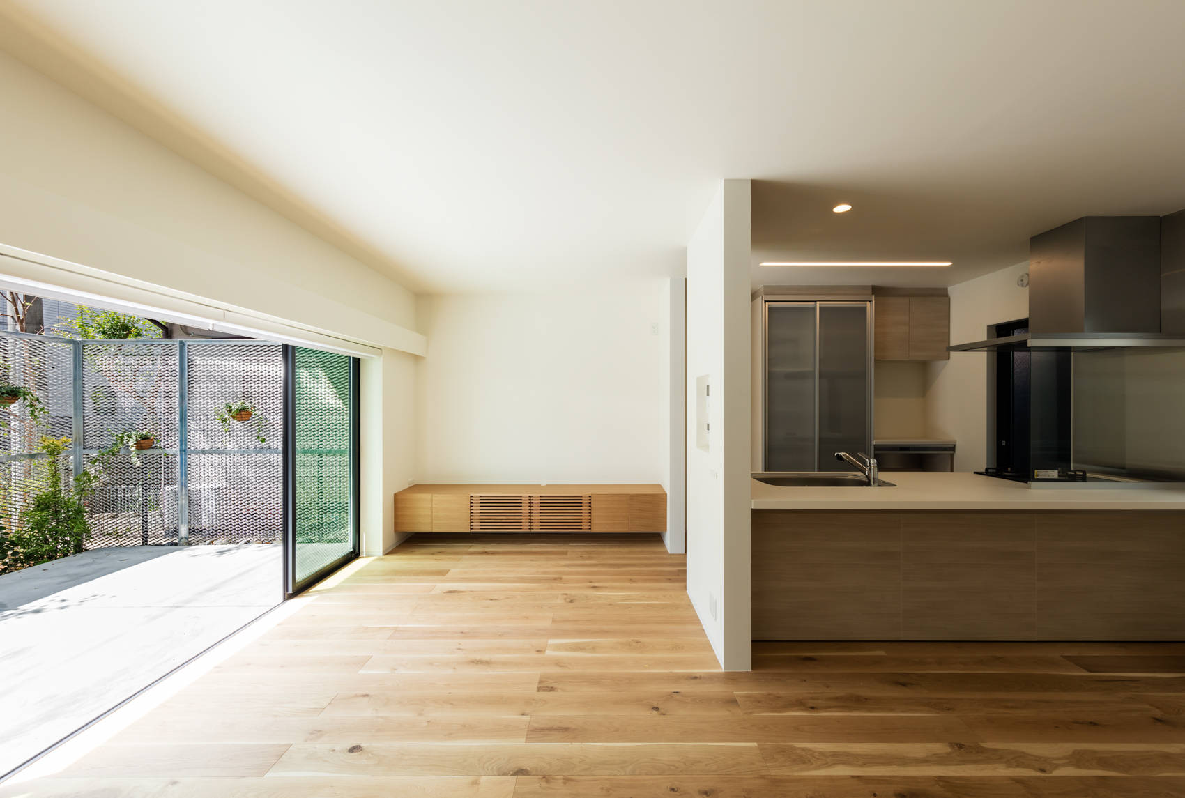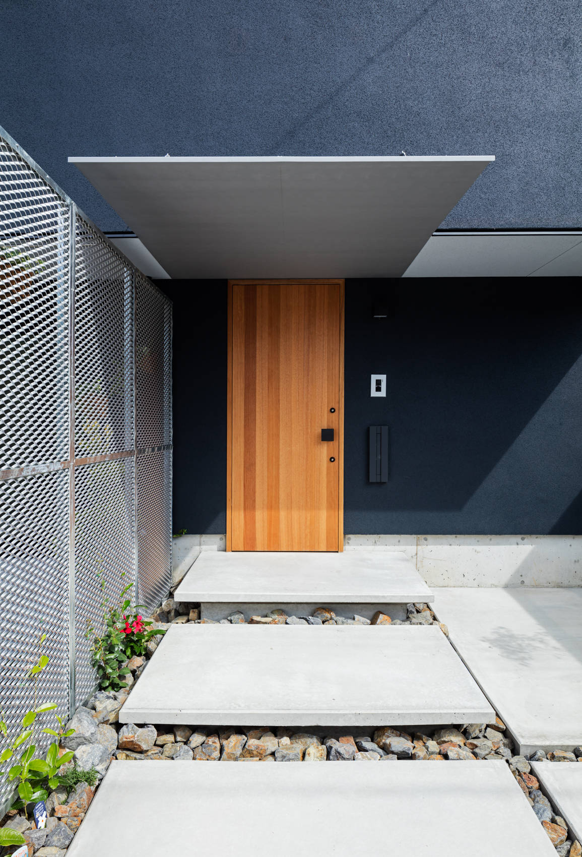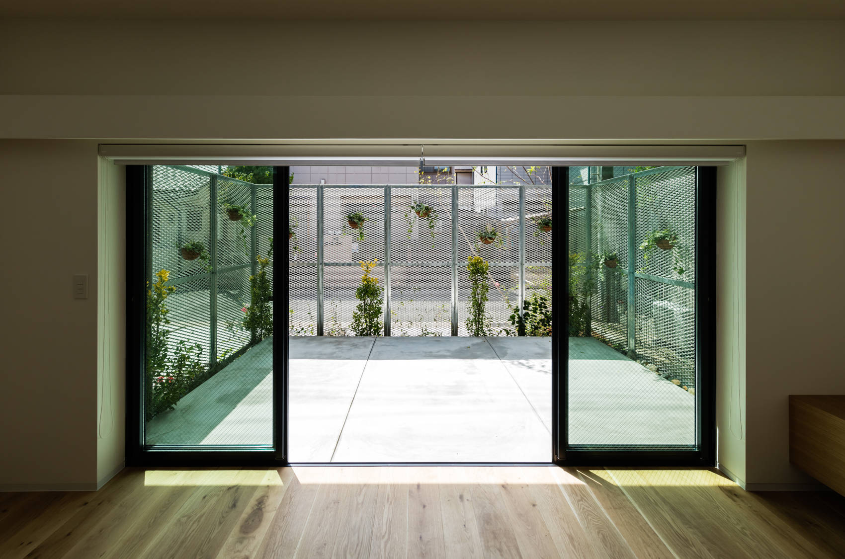 小さなお子様がおられる若い家族の延床面積31坪の住宅です。シンプルな間取りとデザインの快適な家に仕上がりました。アルミのエキスパンドメタルに囲われたリビングに面するテラスは安心して子供が遊べるエリアになります。時間の経過とともにアルミの塀が植栽に覆われます。